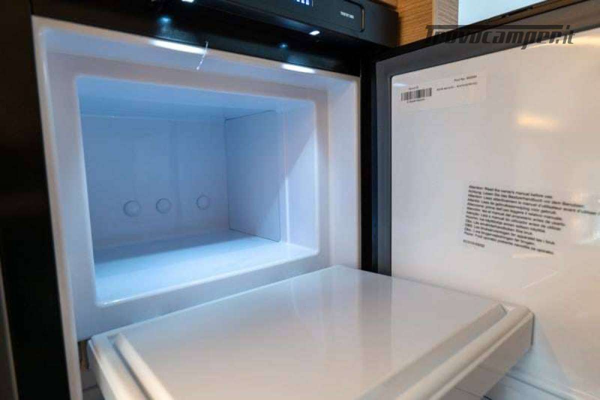 Per quanto riguarda il comfort termico, il camper è equipaggiato con una stufa a gas Truma Combi 6 con boiler, permettendo di mantenere un ambiente accogliente anche nei giorni più freddi. Il frigorifero trivalente da 142 litri è perfetto per conservare cibi e bevande, rendendo la cucina in linea completamente attrezzata per preparare pasti deliziosi.