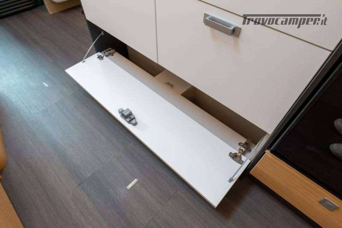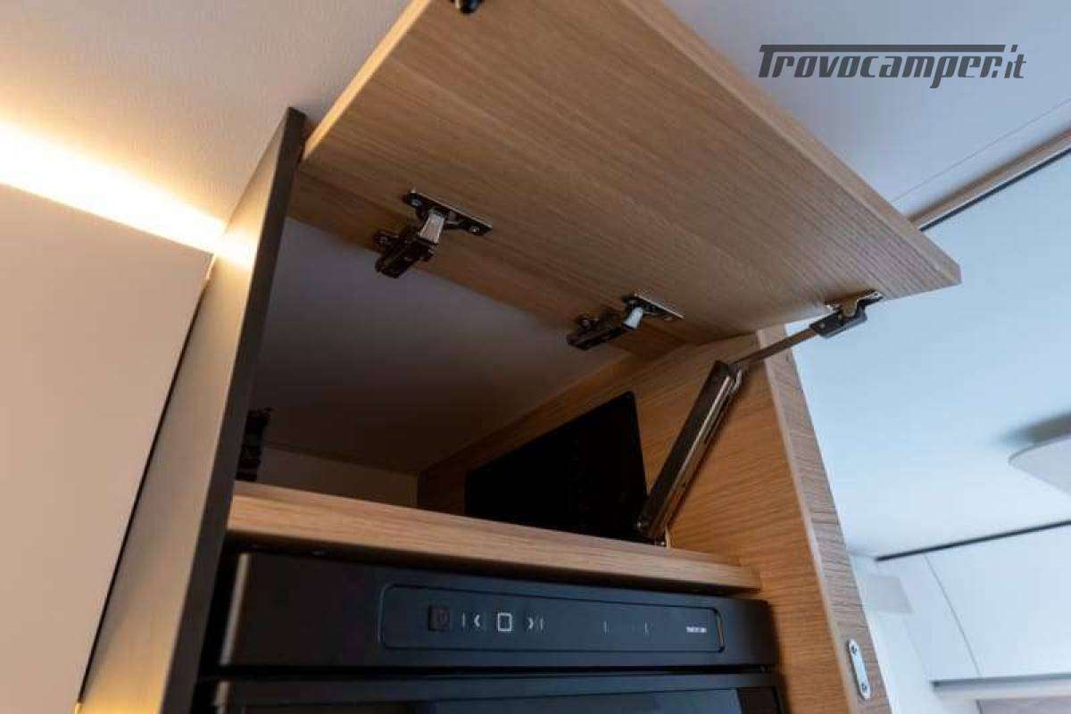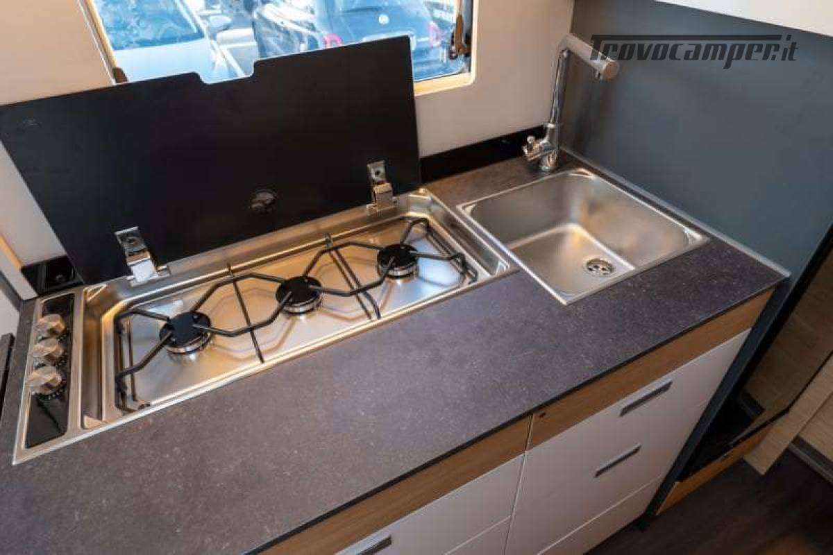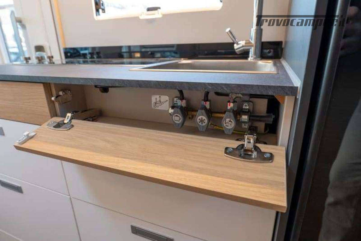 Per quanto riguarda il comfort termico, il camper è equipaggiato con una stufa a gas Truma Combi 6 con boiler, permettendo di mantenere un ambiente accogliente anche nei giorni più freddi. Il frigorifero trivalente da 142 litri è perfetto per conservare cibi e bevande, rendendo la cucina in linea completamente attrezzata per preparare pasti deliziosi.