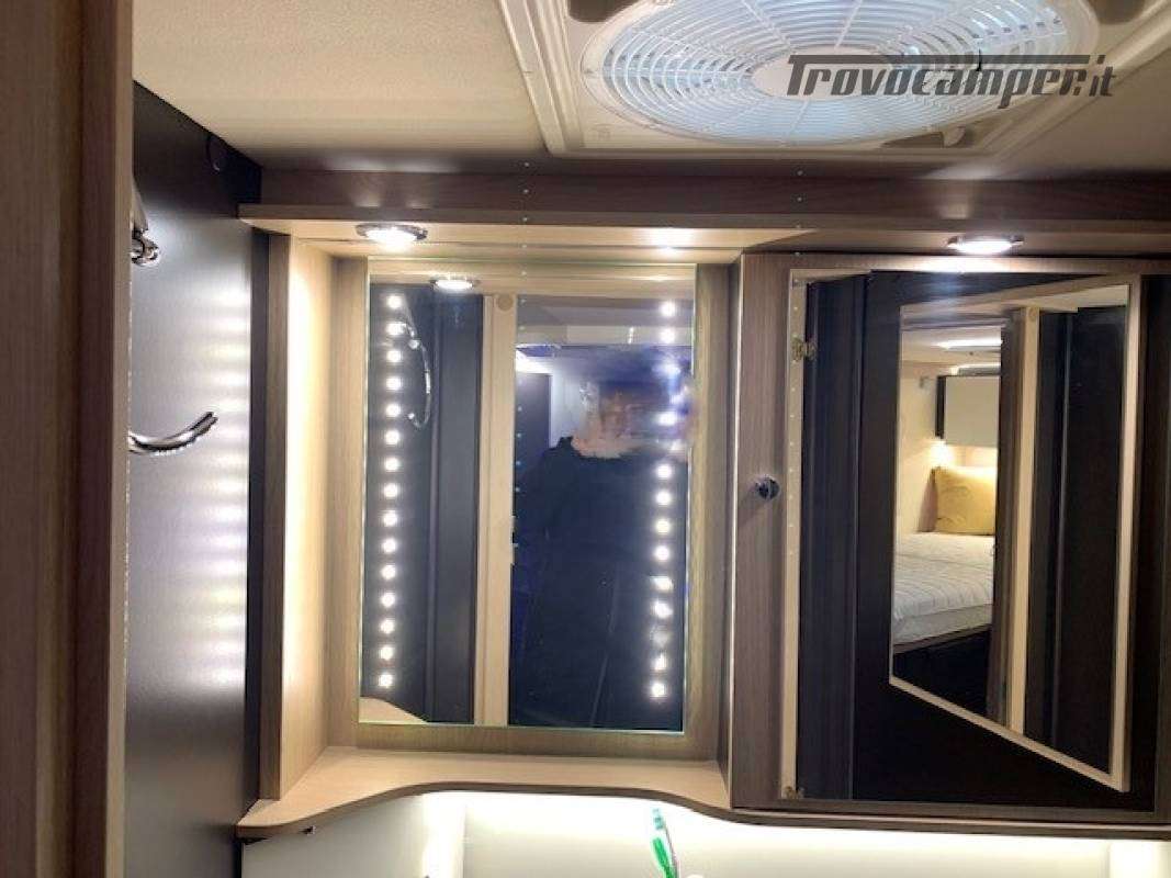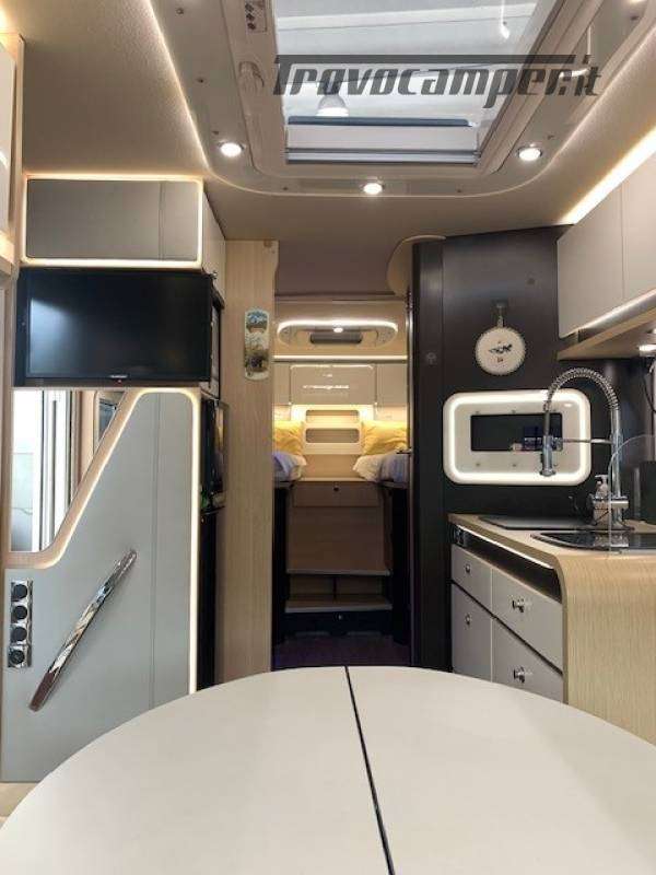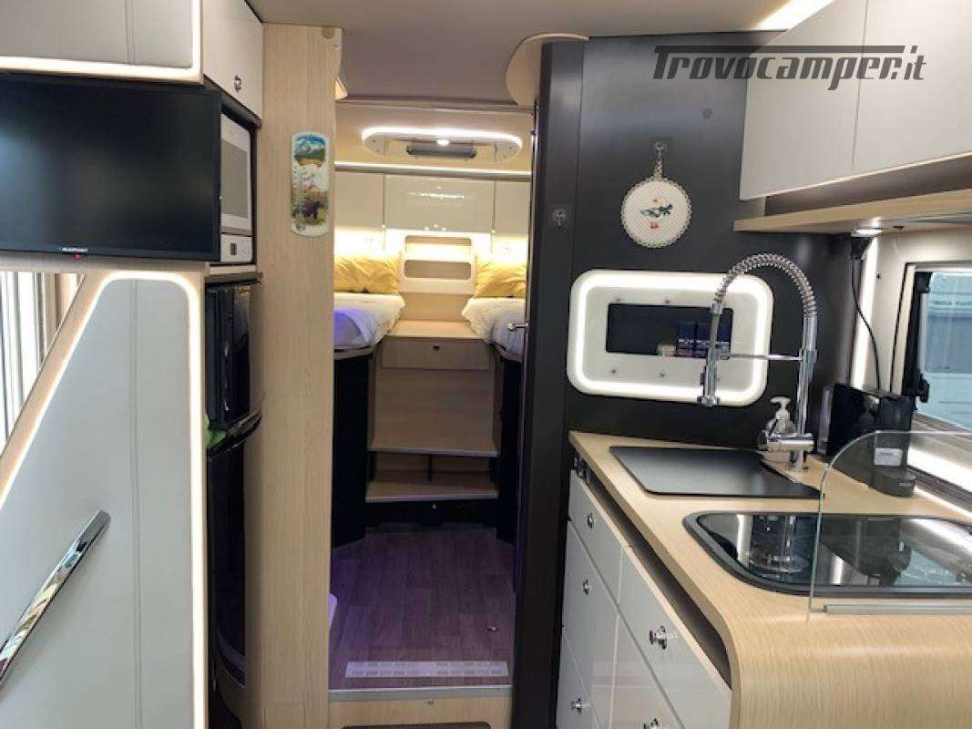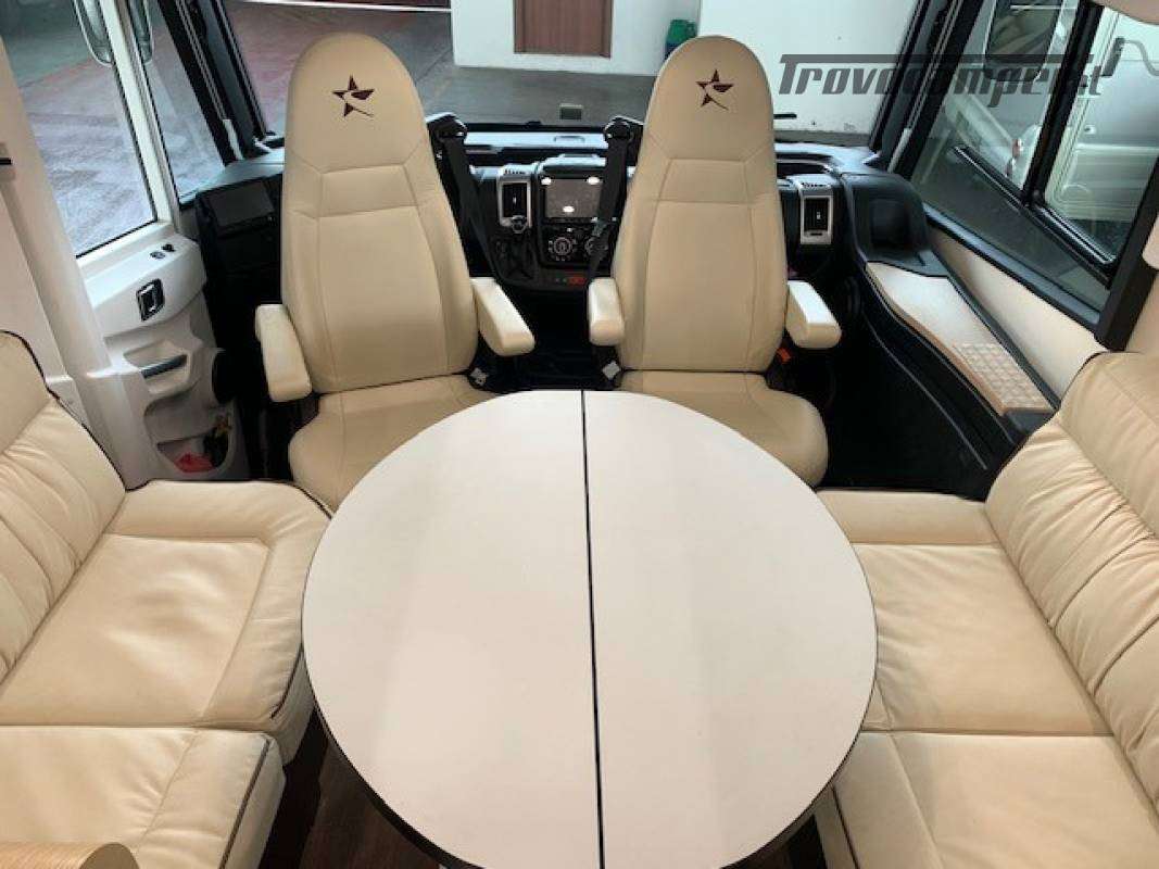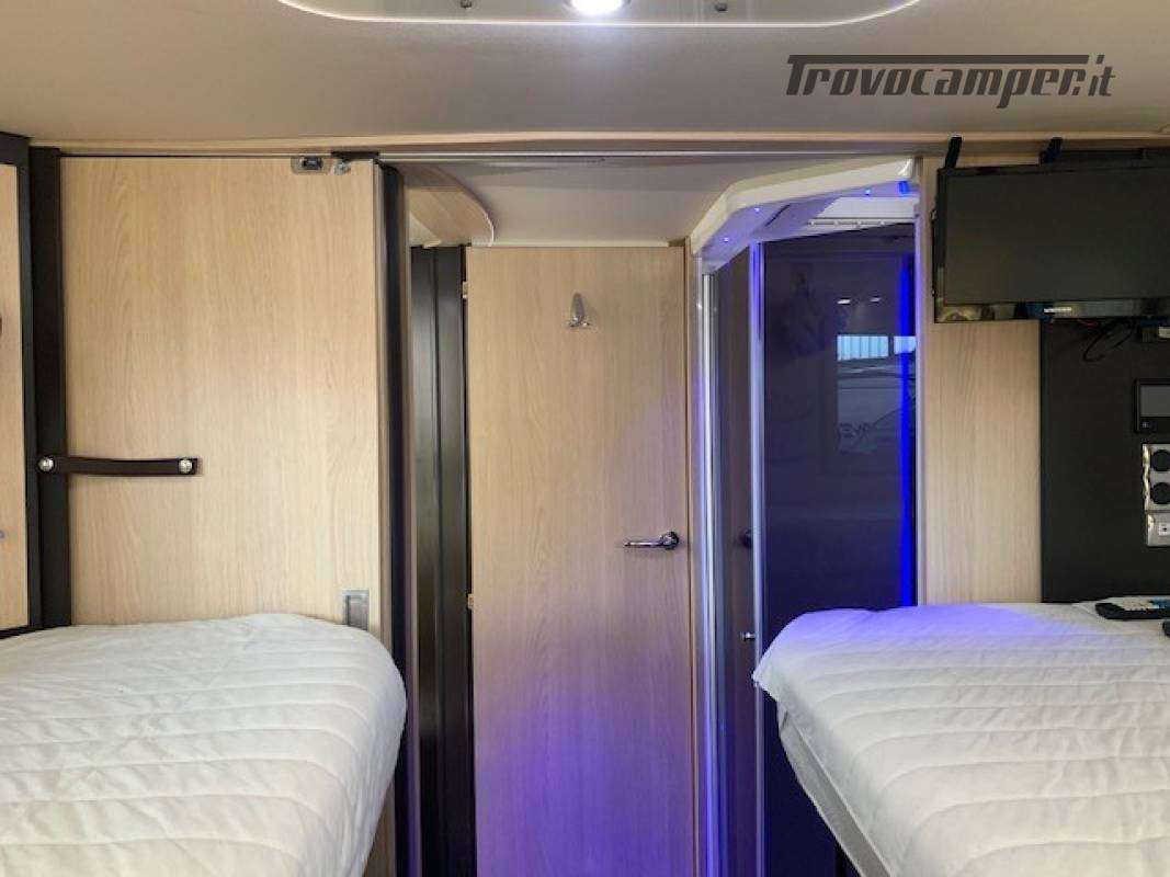 Telaio ribassato AL-KO portata 3.850 kg, riscaldamento a convettori ALDE versione Elite, elettrico ed a gas, scambiatore termico, programmazione da pannello, app smart-phone, da remoto con sistema I-Net. Comando duo control gas, protezione in marcia "gas drive protection". Pack completo, sicurezza, elettrici, climatizzazione, porta guidatore lusso, porta cellula lusso, tappeto riscaldato a liquido in cabina. Cellula "Protec-star", rivestimento esterno in Alufiber, rivestimento termico ed acustico rinforzato, isolamento e rigidità della cellula in Stirofoam 100%, doppio pavimento tecnico su tutta la lunghezza, con doppio vano cassetta wc, multimedia touch screen, android auto, Apple car play, navigatore, 4 telecamere full vision 360° con monitor, retrovisori tipo Bus, oscurante termico parabrezza, frigo trivalente da 175L AES, fornello a 2 fuochi grande e rubinetto con flessibile. Letti gemelli con materassi memory misure 80x214 e 80x210. Doccia esterna calda/fredda, presa gas esterna per grill.
