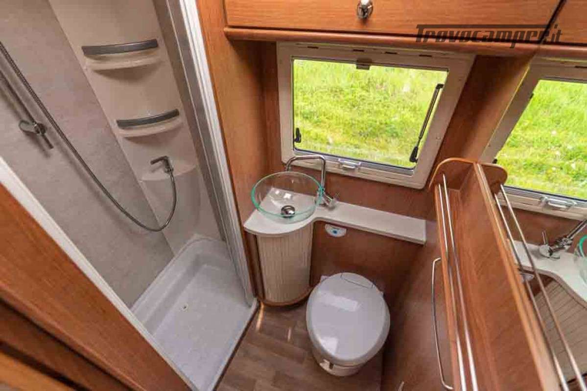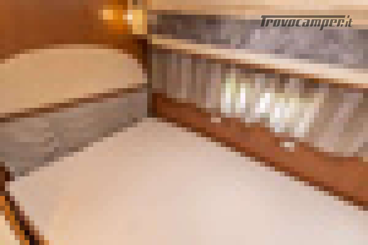 Appena si entra, si viene accolti da un’ampia dinette luminosa e confortevole, affiancata da una cucina lineare completa di tutto: due fuochi a gas, numerosi scomparti di stivaggio e un frigorifero trivalente da 167 litri con freezer separato da 29 litri, ideale per le vacanze più lunghe.