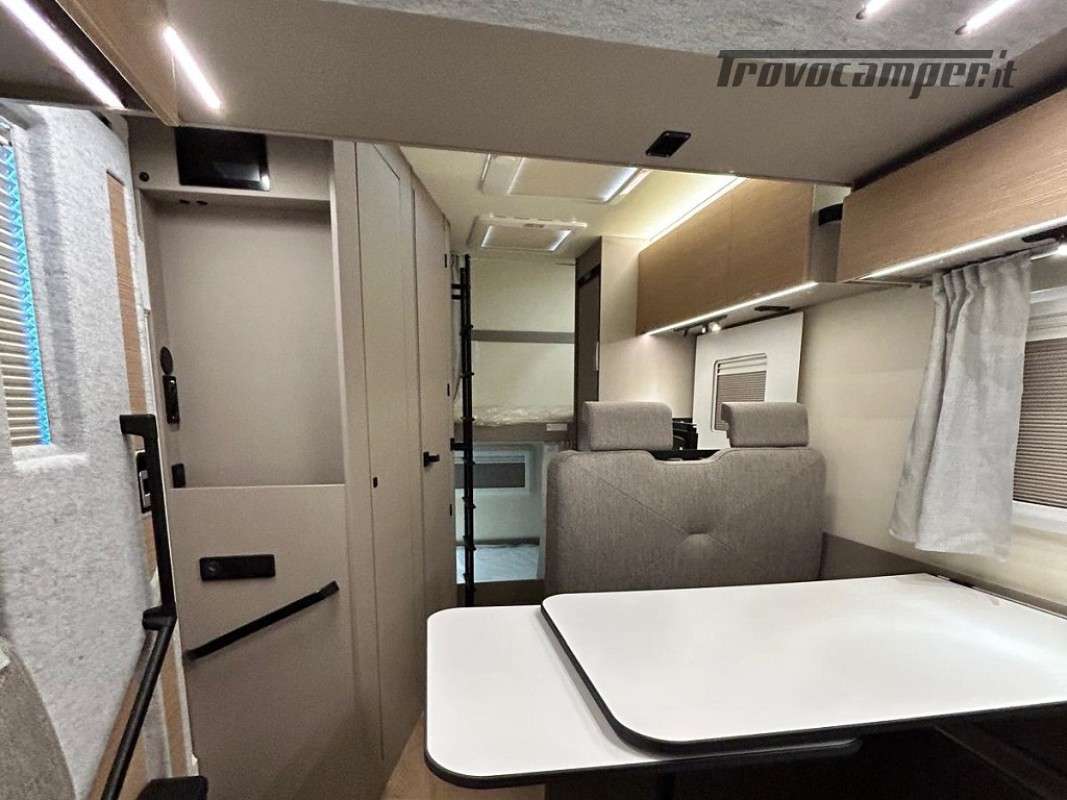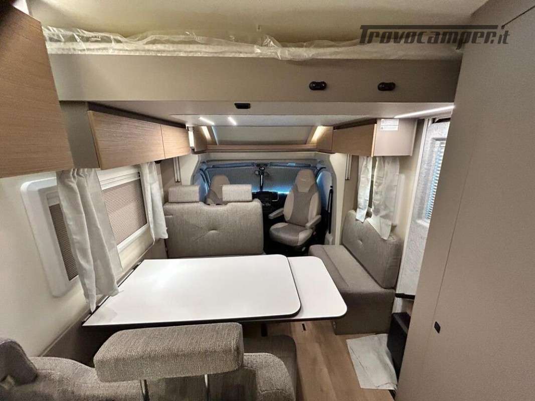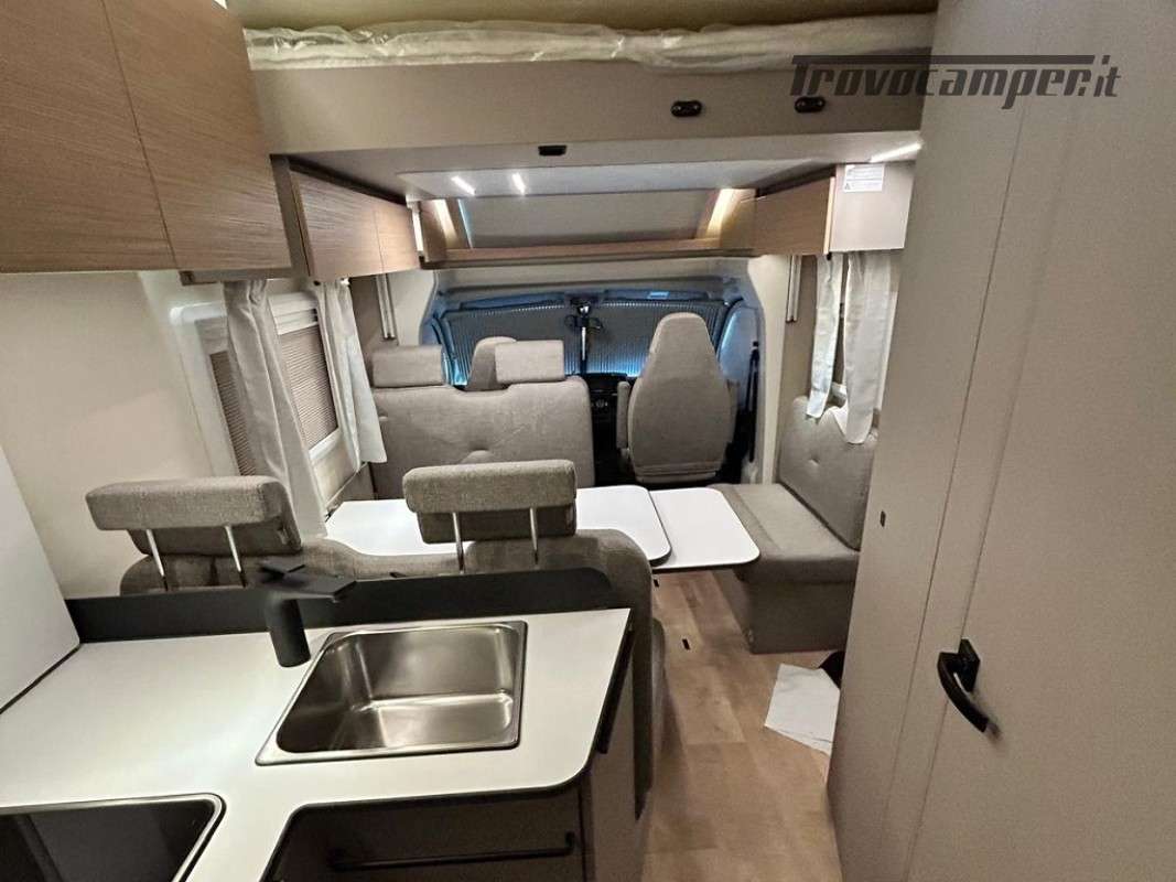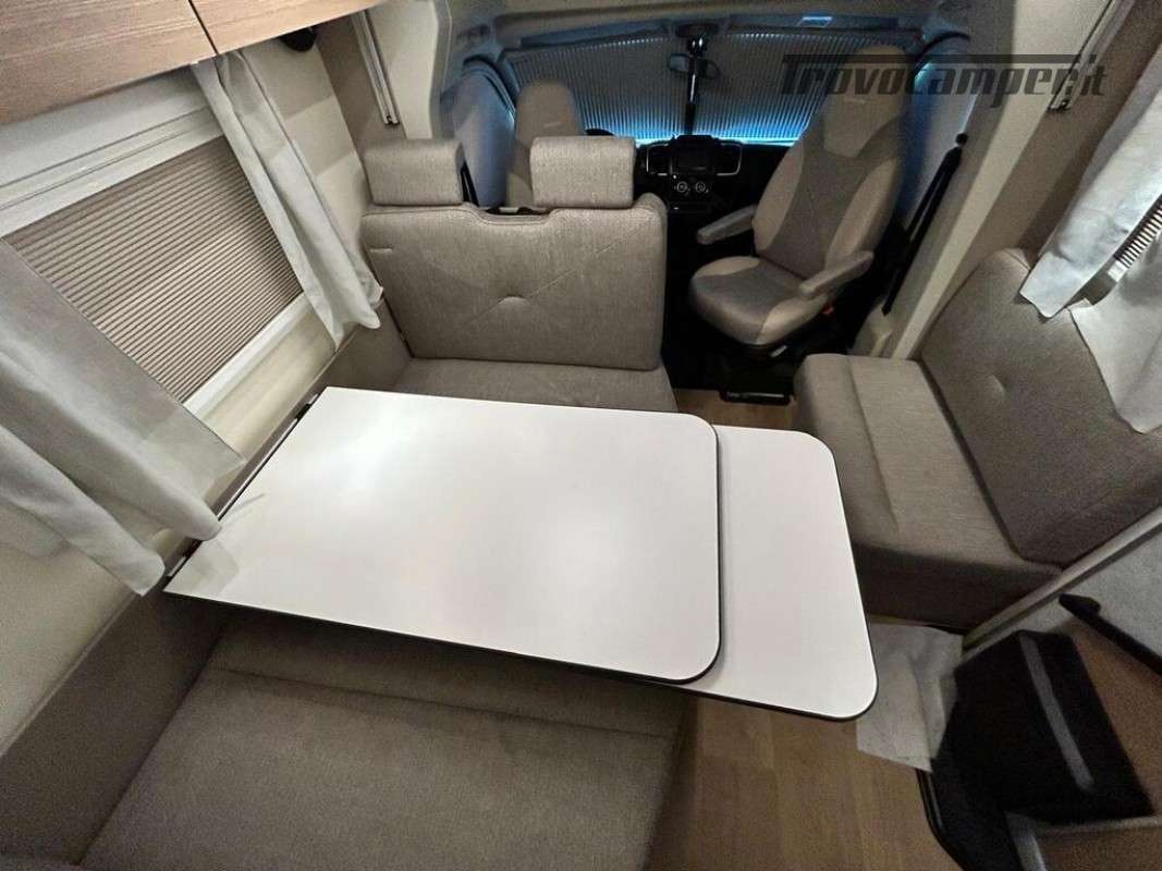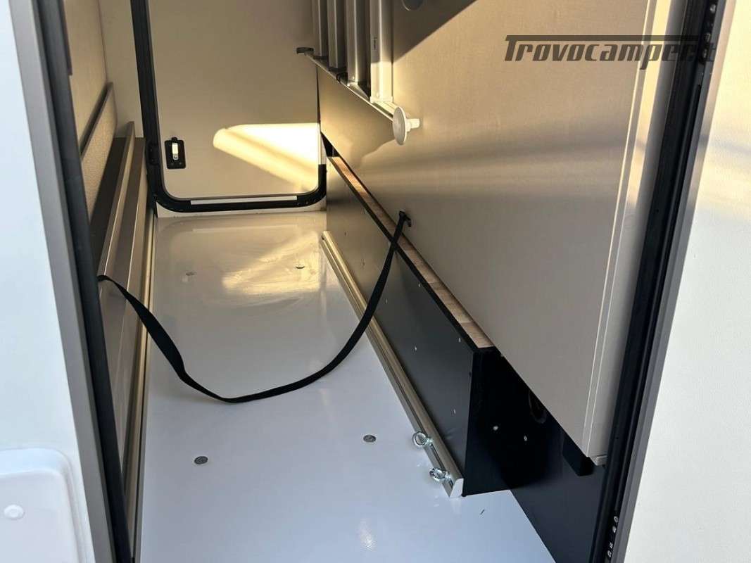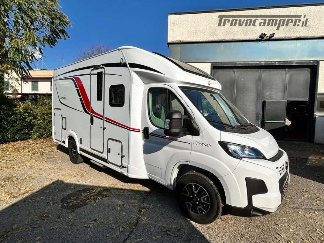 - PACCHETTO COMFORT (Oscuranti plissettati in cabina Sun-Roof, Porta ingresso larga con finestra e chiusura centralizzata, Finestre con cornici, Oblò 50 x 70 cm, Gradino elettrico, Illuminazione indiretta, My Bürstner App, Schermo di controllo 7"e Sportello garage supplementare lato sinistro);