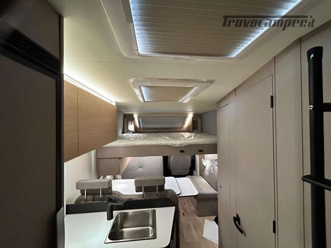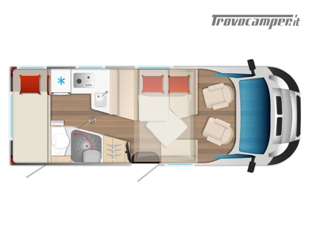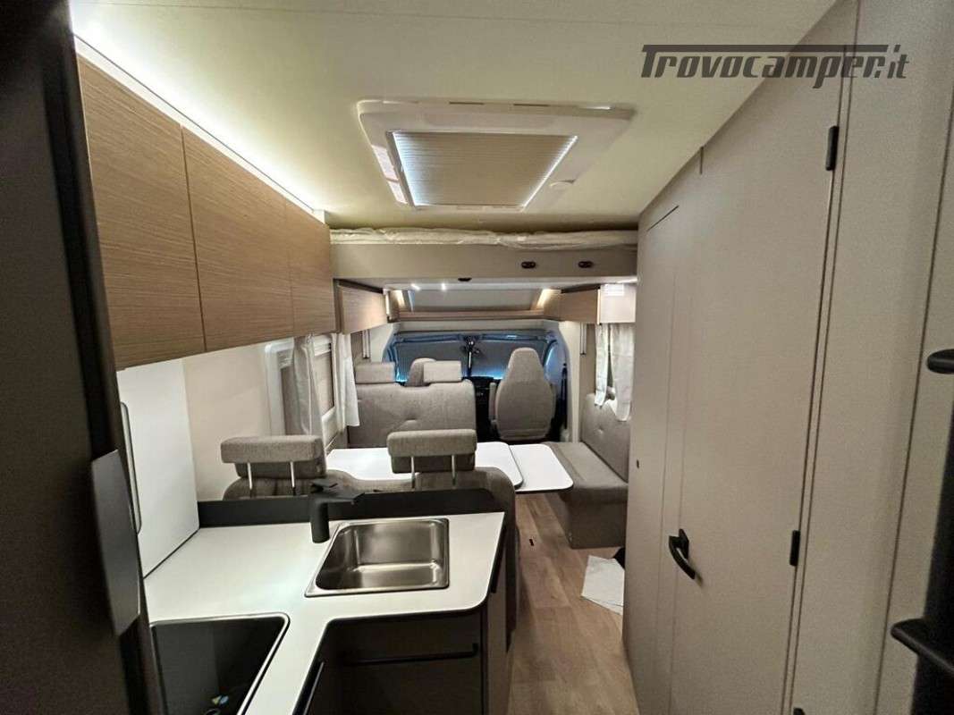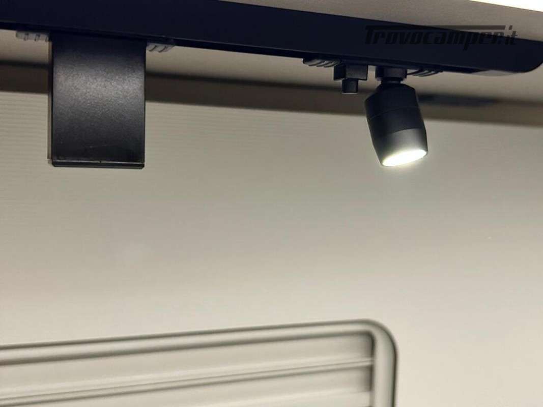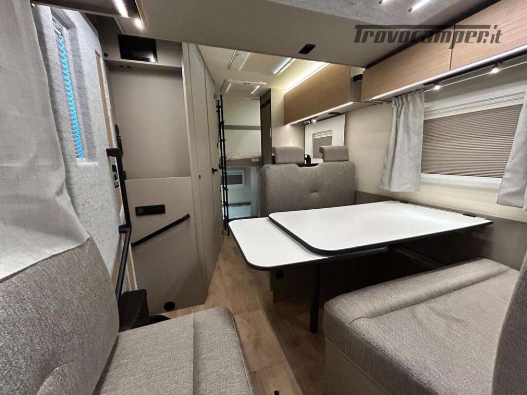 - PACCHETTO COMFORT (Oscuranti plissettati in cabina Sun-Roof, Porta ingresso larga con finestra e chiusura centralizzata, Finestre con cornici, Oblò 50 x 70 cm, Gradino elettrico, Illuminazione indiretta, My Bürstner App, Schermo di controllo 7"e Sportello garage supplementare lato sinistro);