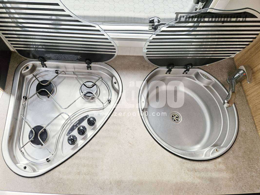 Letto matrimoniale trasversale sopra cabina di guida – Dinette contrapposta lato sx trasformabile in letto matrimoniale – Divanetto anteriore lato dx dietro sedili passeggero- Sedili cabina girevoli – Letti a castello posteriori trasversali a volume variabile – Cucina lineare 3 fuochi con Frigorifero trivalente grande con cella freezer separata – Toilette con finestra e Box doccia separato con oblo’ 28 x 28