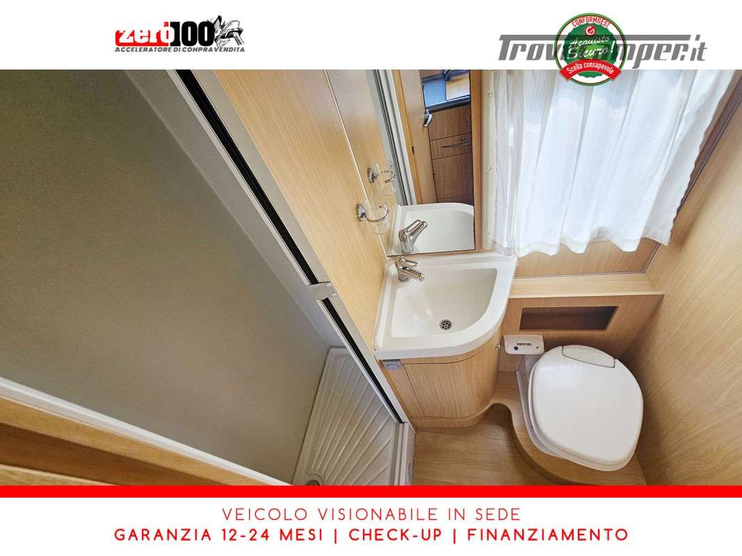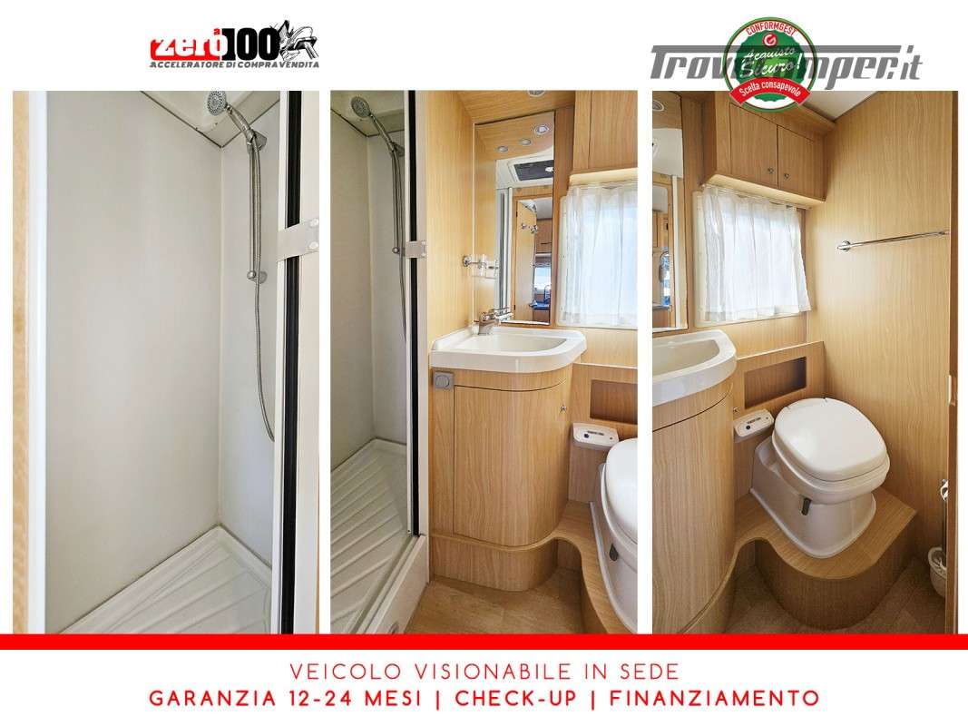 Letto matrimoniale trasversale in mansarda – Letto matrimoniale trasversale posteriore – Mezza dinette con divanetto laterale e sedili cabina girevoli trasformabile in letto – Cucina lineare 4 fuochi con scaldavivande, forno a gas e cappa aspirante – Frigorifero trivalente alto con cella freezer separata – Bagno con doccia separata, finestra e oblò con ventola – Garage