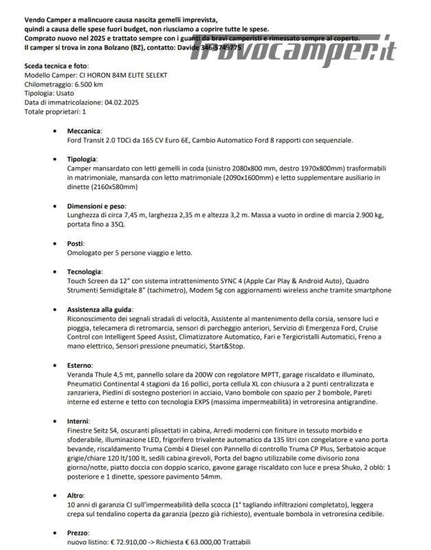 Il camper si trova in zona Bolzano (BZ), contatto: Davide