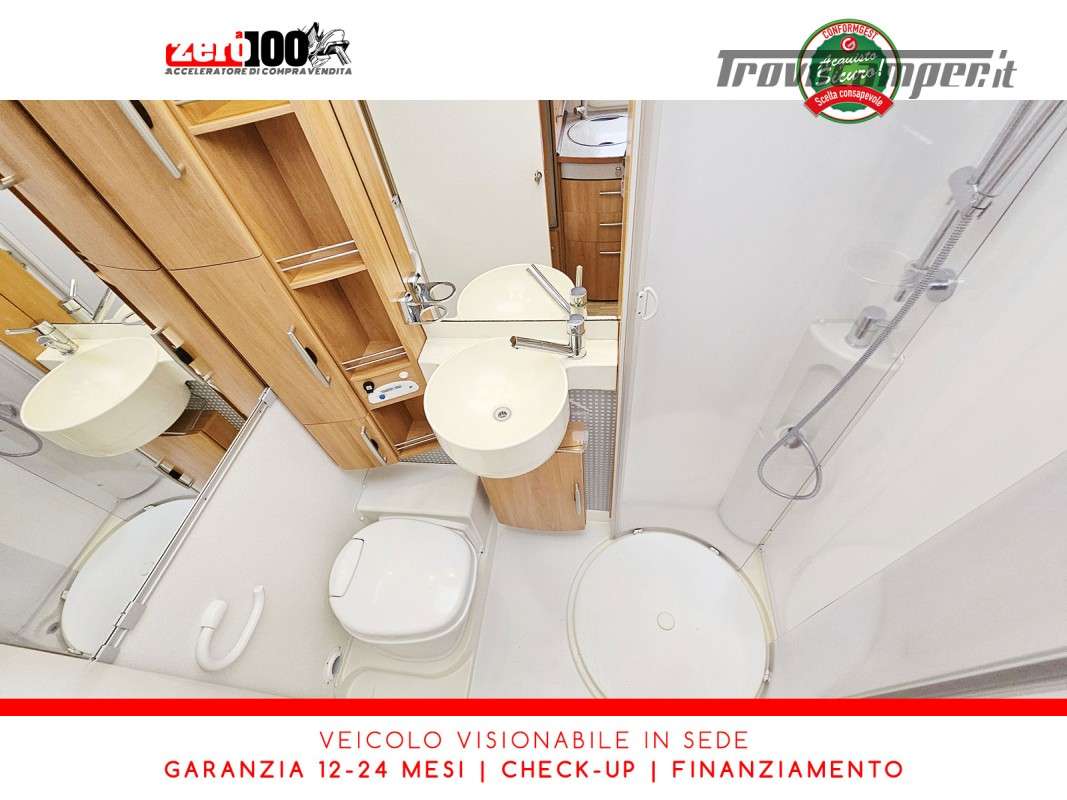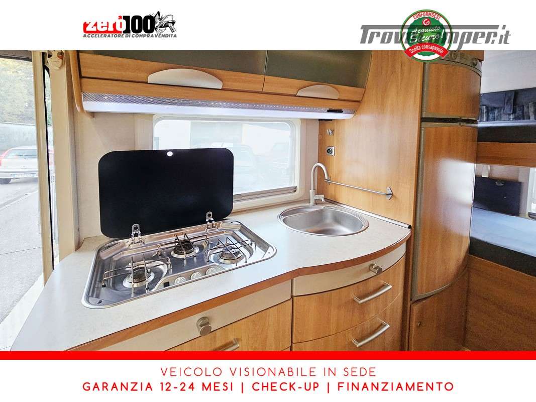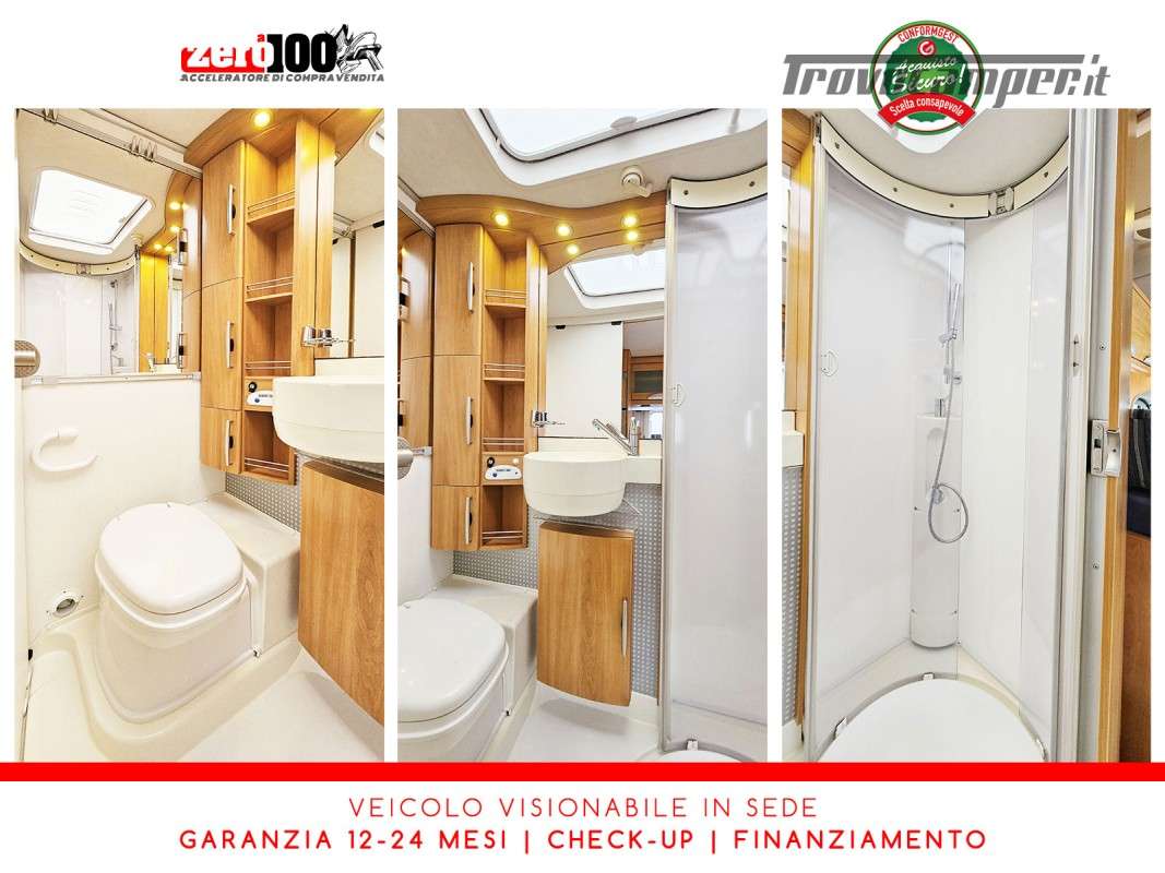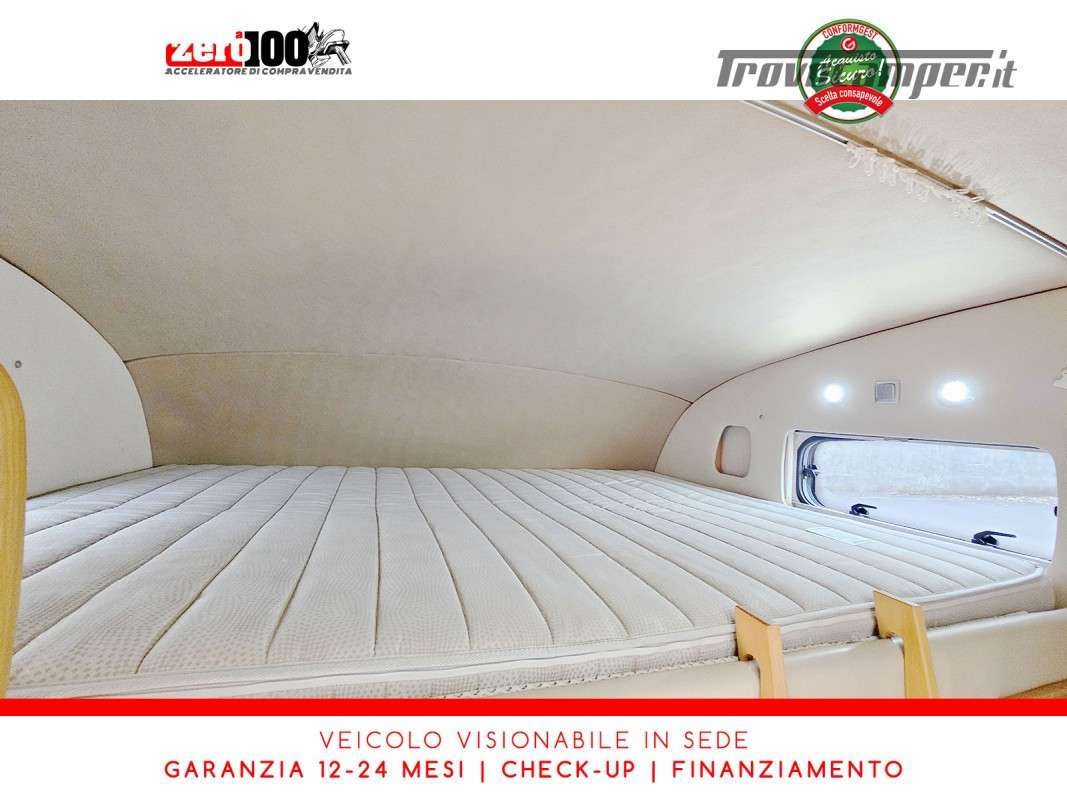 Letto matrimoniale trasversale anteriore in mansarda – Mezza dinette con sedili cabina girevoli – Letti a castello posteriori trasversali – Cucina lineare 3 fuochi con cappa aspirante e Frigorifero trivalente grande con cella freezer separata – Bagno con box doccia girevole annesso al bagno