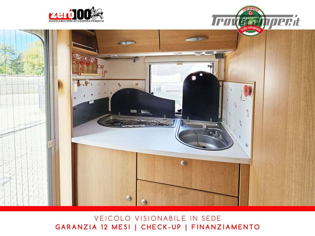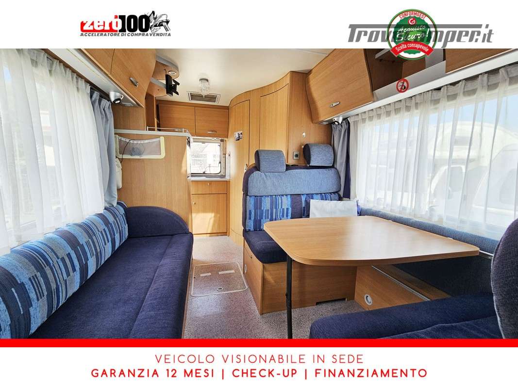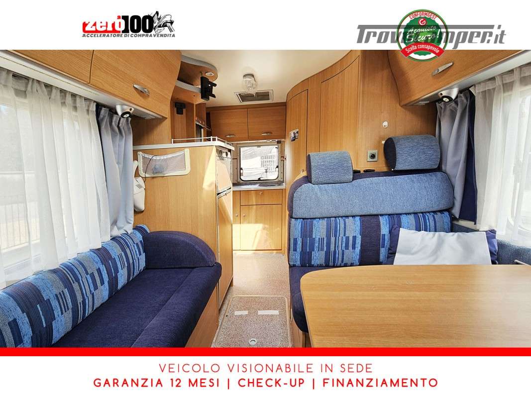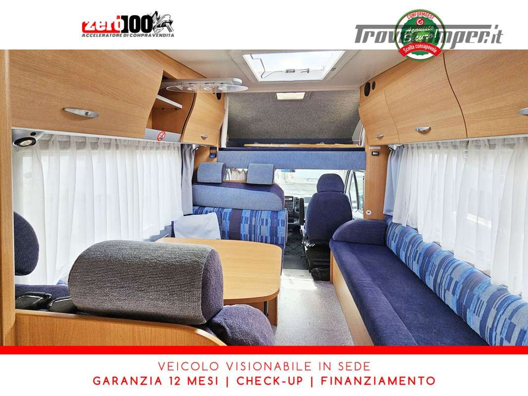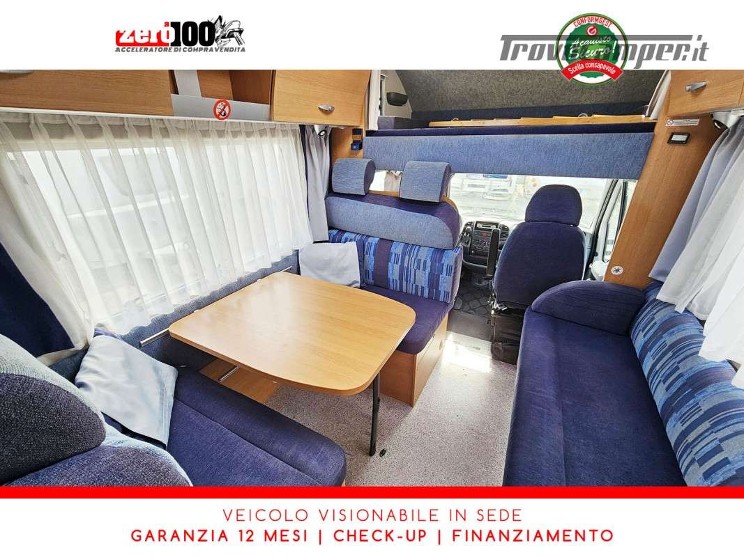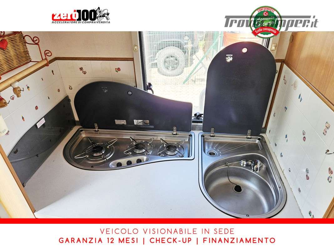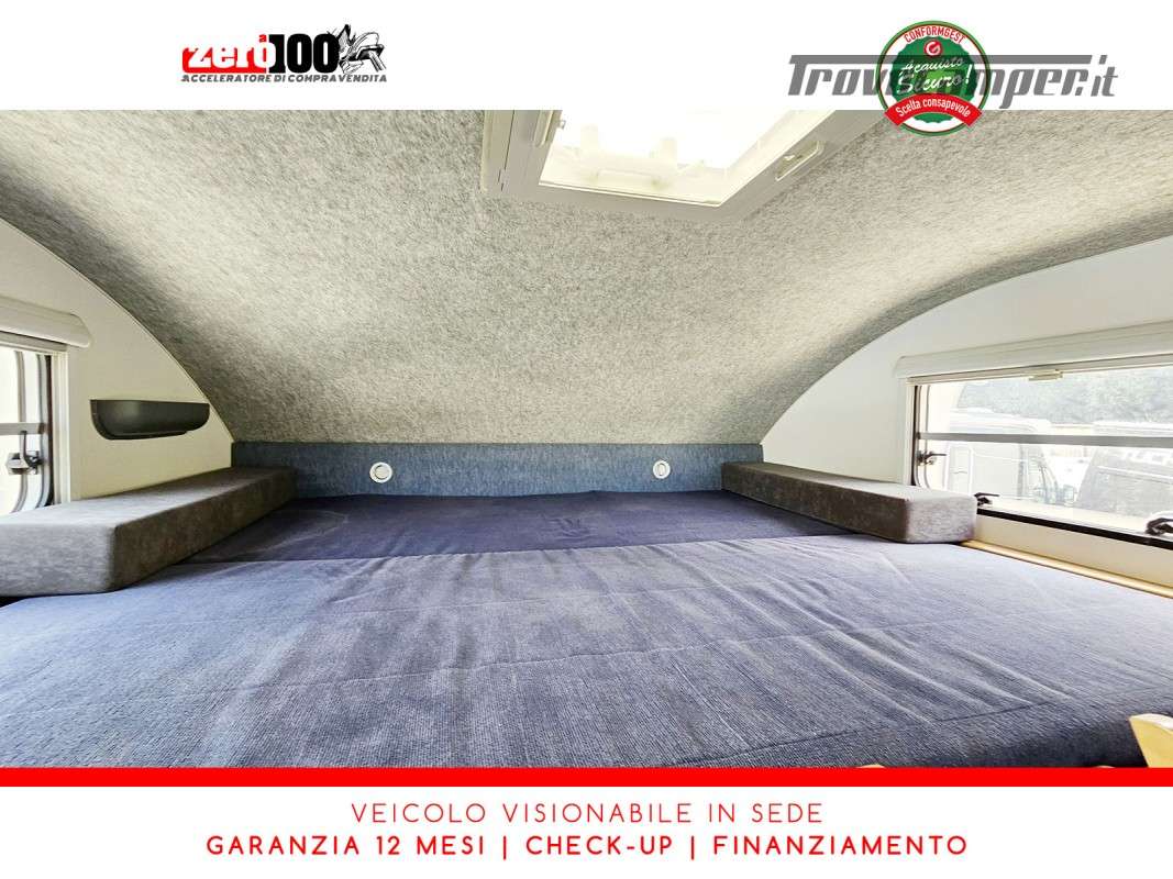 Letto matrimoniale trasversale in mansarda – Dinette contrapposta lato SX trasformabile in letto matrimoniale – Divanetto lato DX – Cucina lineare 3 fuochi con Frigorifero trivalente 150 lt alto con cella freezer separata – Bagno con box doccia girevole e finestra