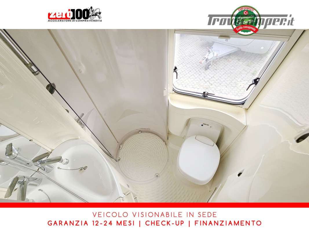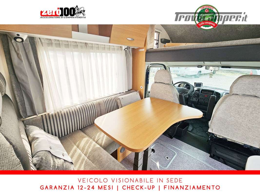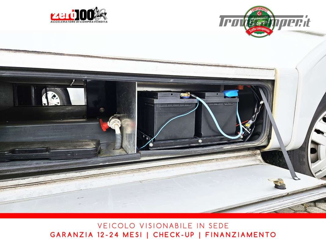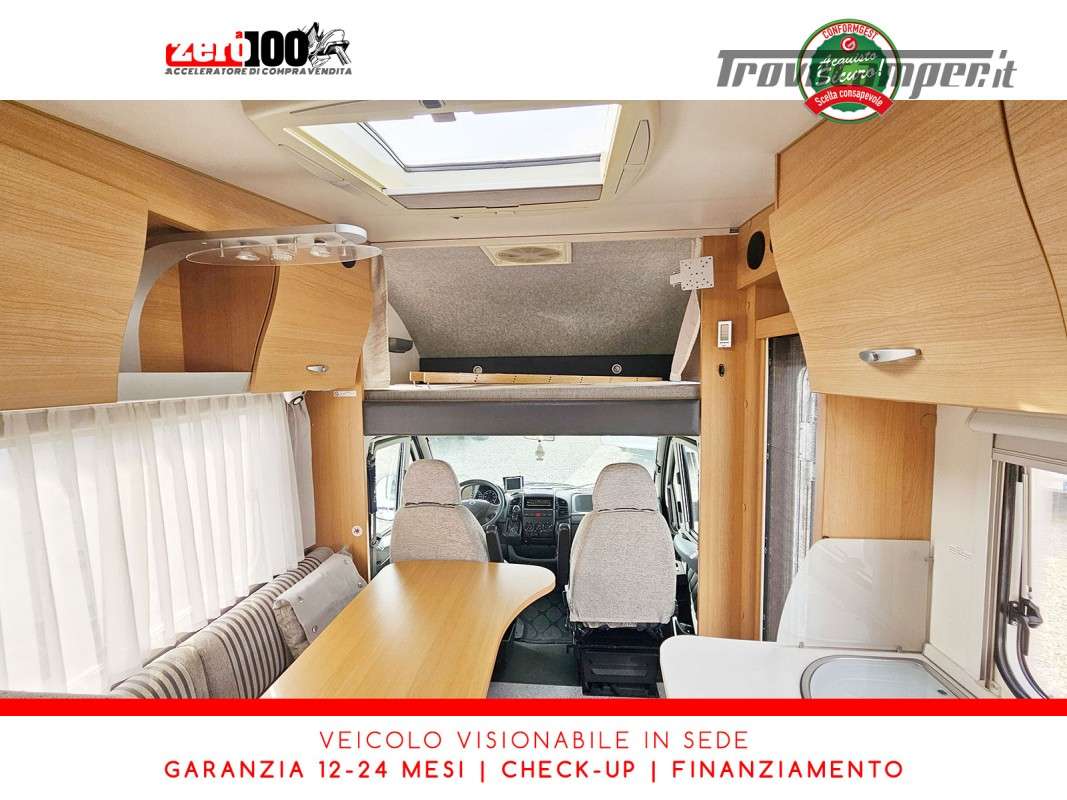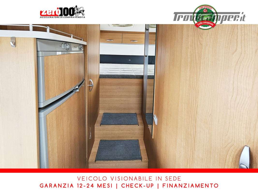 Letto matrimoniale in mansarda – Letto matrimoniale trasversale in coda – Dinette a L con sedili cabina girevoli – Cucina lineare 3 fuochi con frigorifero trivalente 150 lt automatico – Bagno con box doccia girevole – Garage con doppio portellone
