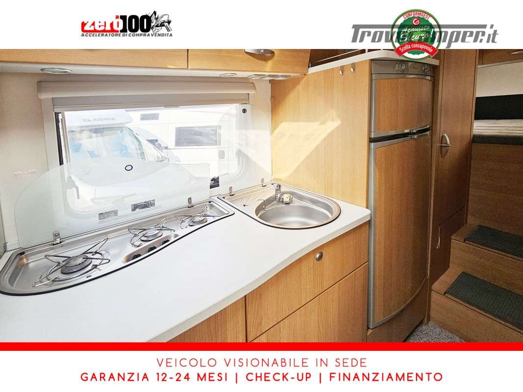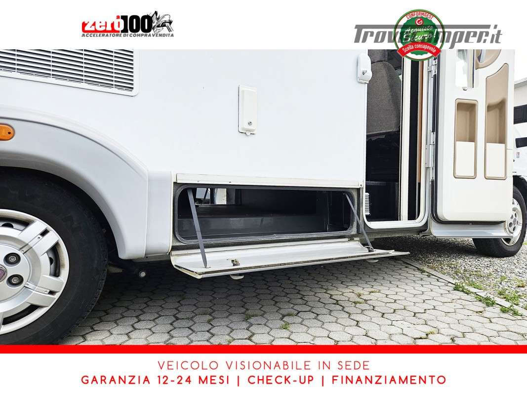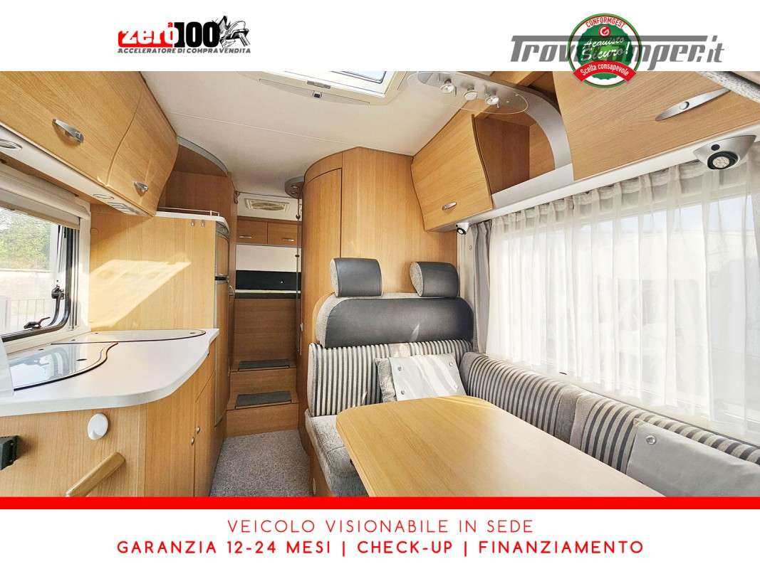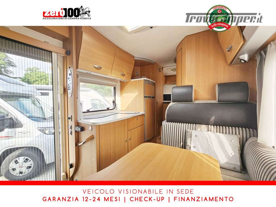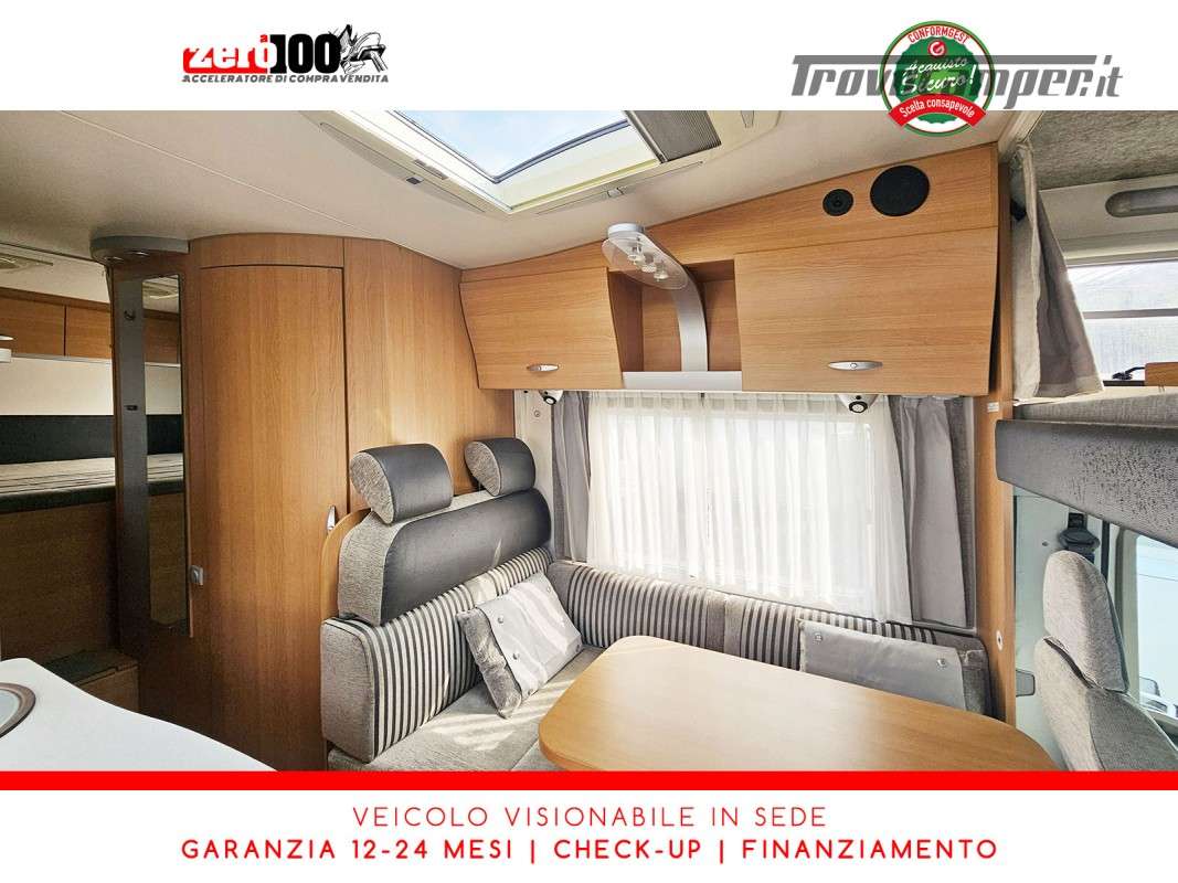 Letto matrimoniale in mansarda – Letto matrimoniale trasversale in coda – Dinette a L con sedili cabina girevoli – Cucina lineare 3 fuochi con frigorifero trivalente 150 lt automatico – Bagno con box doccia girevole – Garage con doppio portellone