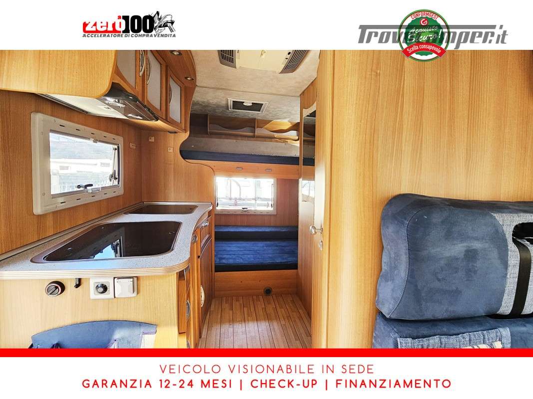Letto matrimoniale anteriore trasversale in mansarda – Dinette contrapposta trasformabile in letto matrimoniale – Letti a castello posteriori trasversali maggiorati – Cucina lineare 3 fuochi con Frigorifero trivalente alto con cella freezer separata – Bagno con box doccia separato, finestra e oblò – Garage a volume variabile