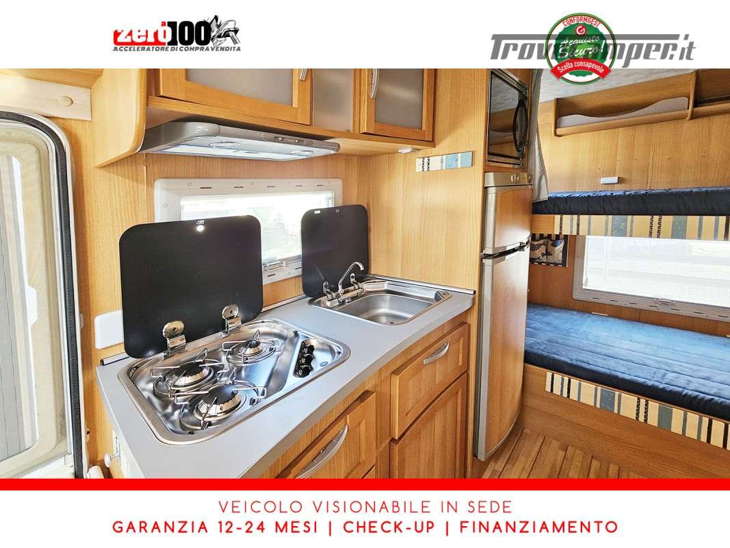 Letto matrimoniale mansarda – Letto a castello trasversale posteriore con gavone a volume variabile – Doppia dinette trasformabile in letto 3 posti – Cucina lineare 3 fuochi con frigorifero alto trivalente 150 lt, Cappa aspirante e Forno a gas – Bagno con box doccia separato – Ampio armadio.