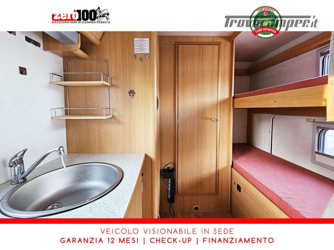 Letto matrimoniale trasversale anteriore in mansarda – Dinette contrapposta centrale lato SX trasformabile in letto matrimoniale – Letti a castello posteriori lato SX longitudinali – Cucina lineare 3 fuochi con aspiratore, Frigorifero trivalente 110 lt – Toilette con finestra e oblo’ 40 x 40 e Doccia separata