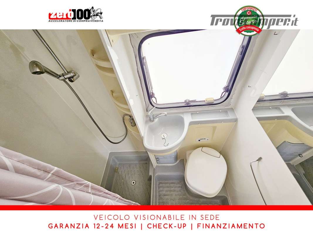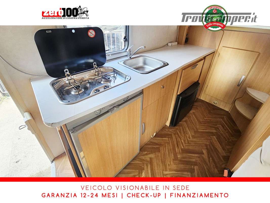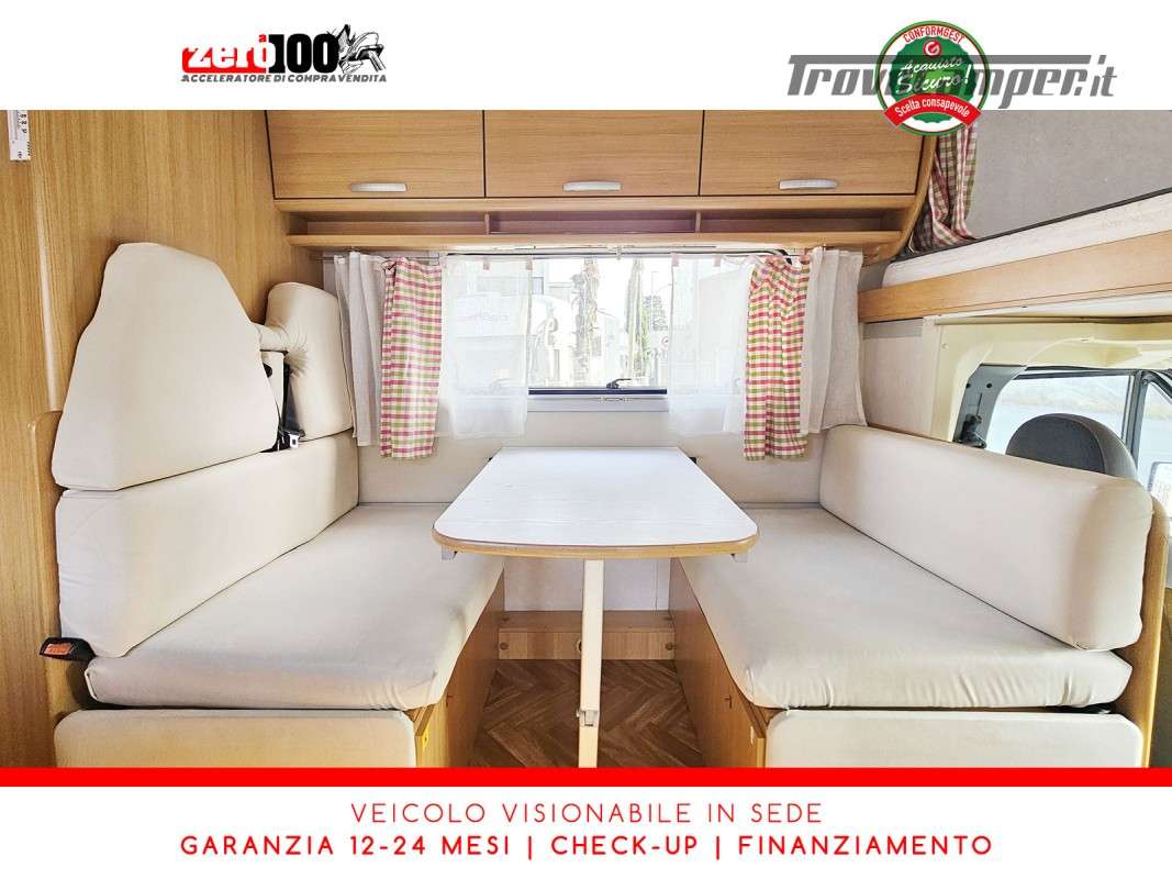 Letto matrimoniale trasversale in coda – Dinette contrapposta trasformabile in letto matrimoniale – Letto matrimoniale anteriore in mansarda – Cucina lineare 2 fuochi con frigorifero trivalente basso 110 lt con cella freezer integrata – Bagno con finestra e box doccia separato