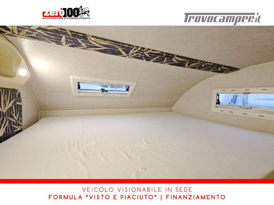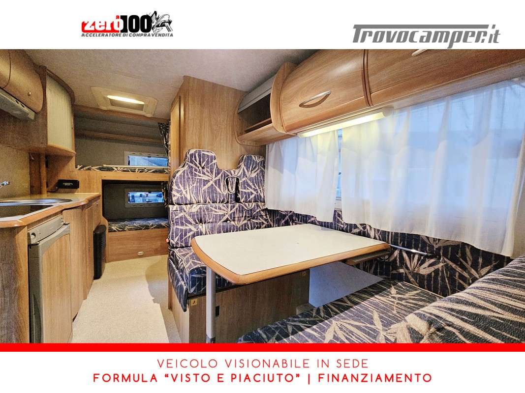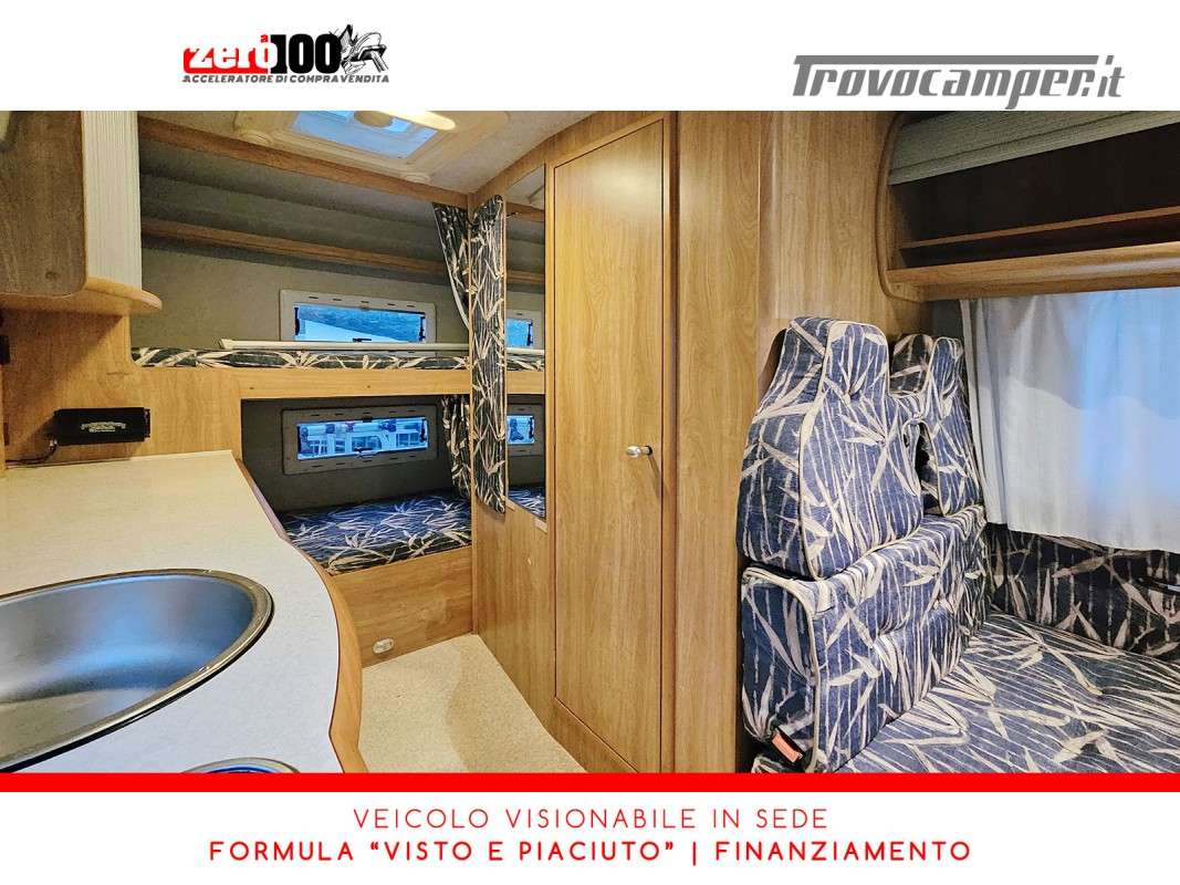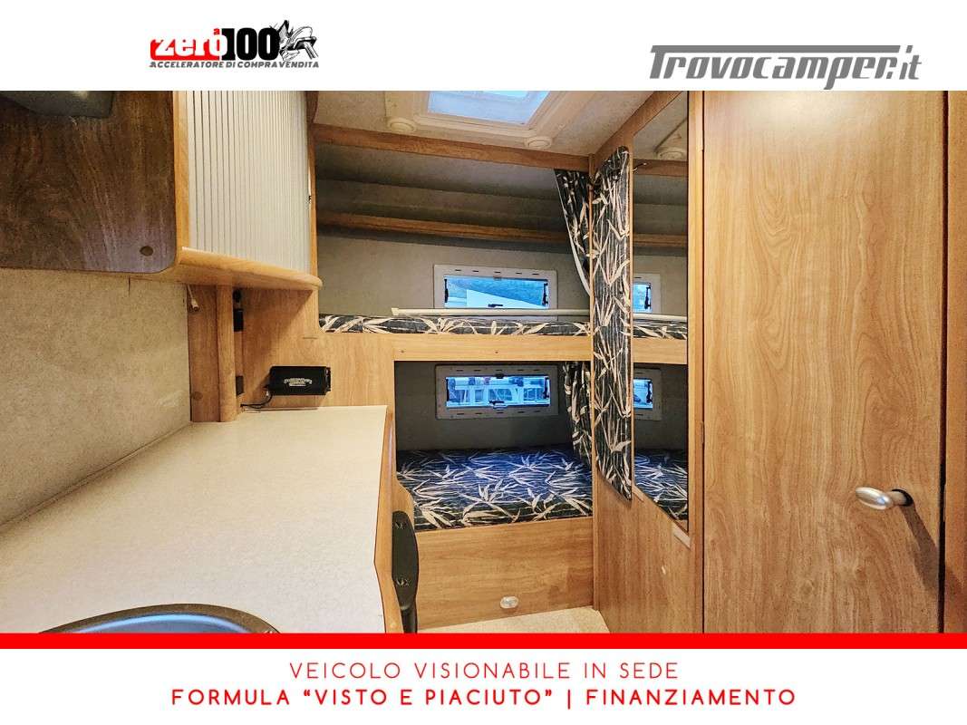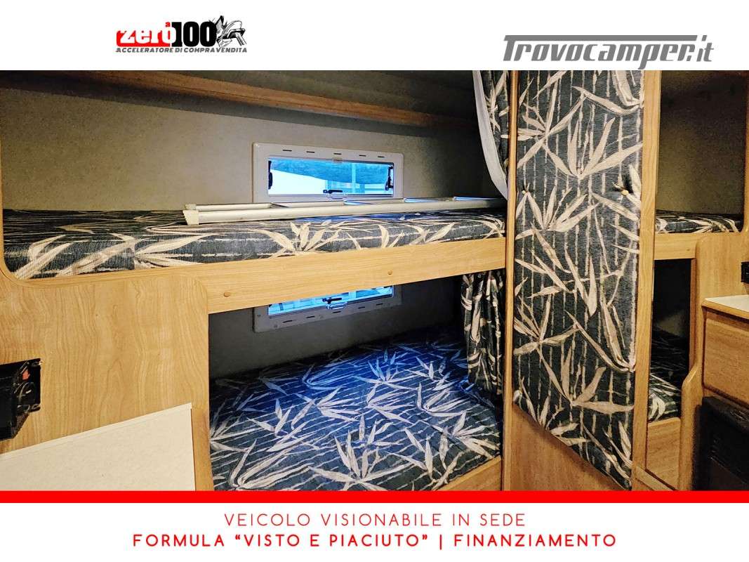 Letto matrimoniale anteriore in mansarda – Dinette contrapposta trasformabile in letto – Letti a castello posteriori trasversali – Cucina lineare 3 fuochi – Frigorifero trivalente con cella freezer integrata – Bagno con finestra e separazione doccia