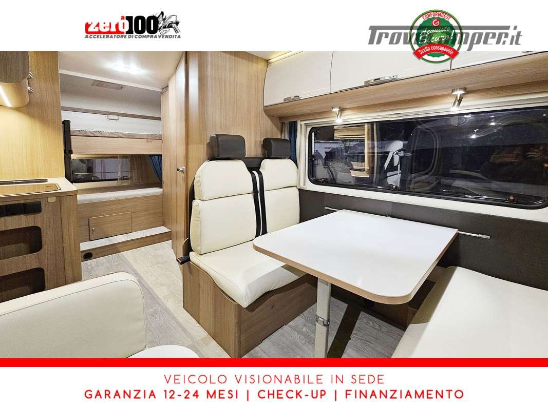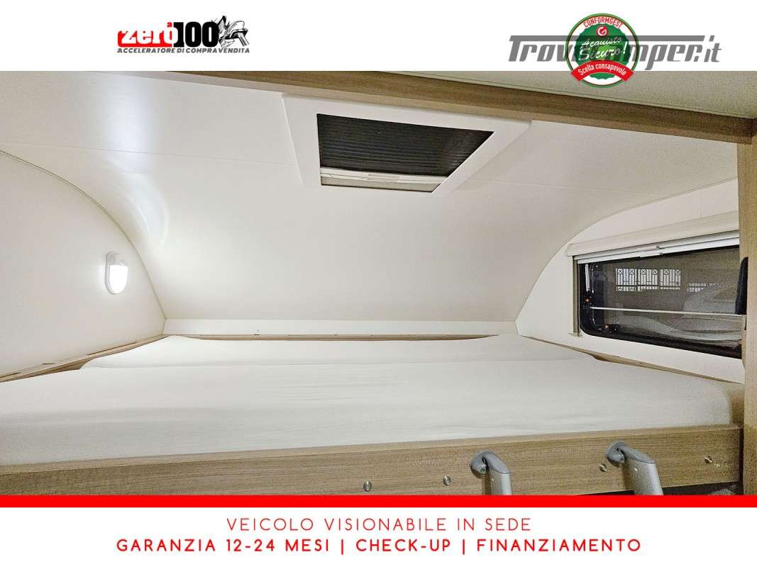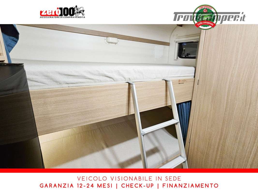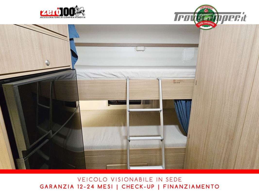 Letto matrimoniale anteriore in mansarda - Dinette classica contrapposta trasformabile in letto matrimoniale - Letti a castello trasversale - Cucina lineare 3 fuochi con frigorifero con cella frigorifera separata - Bagno con box doccia separata