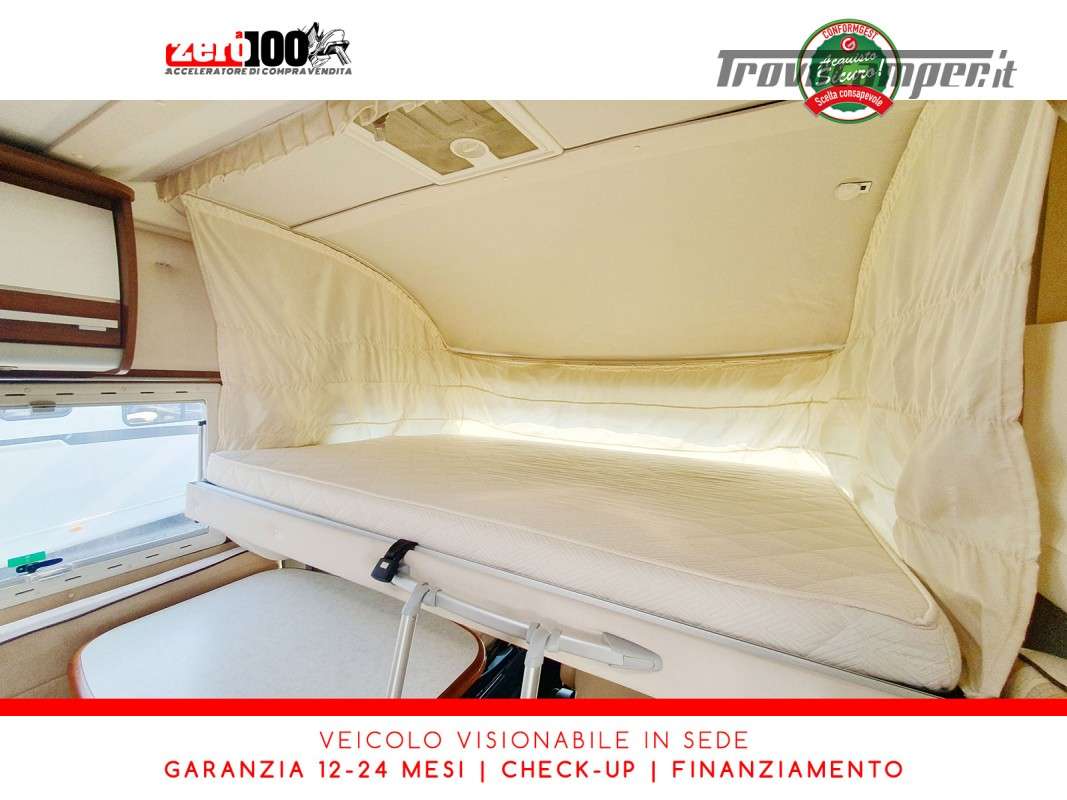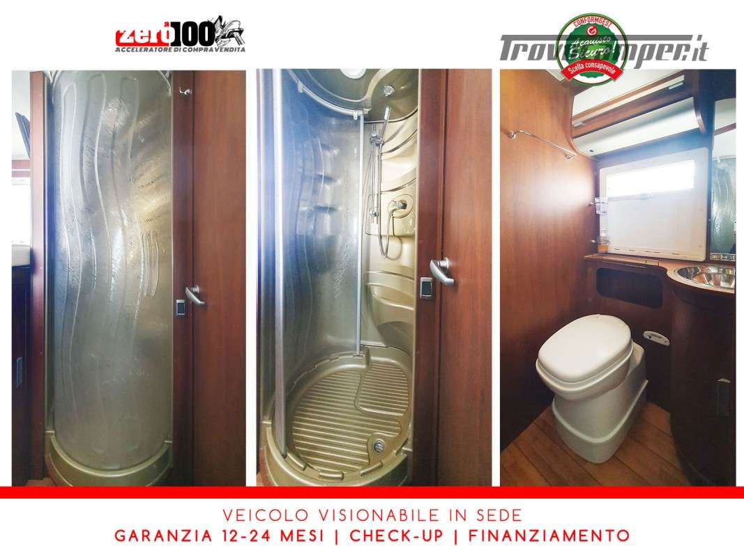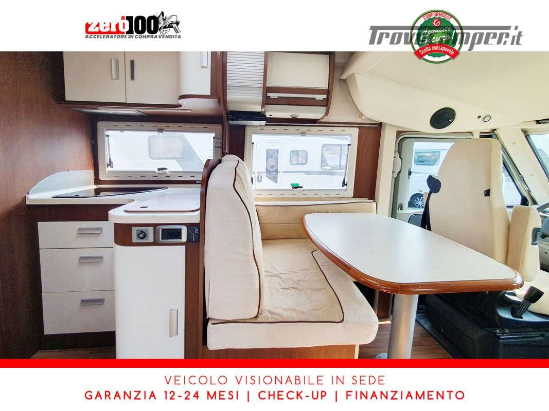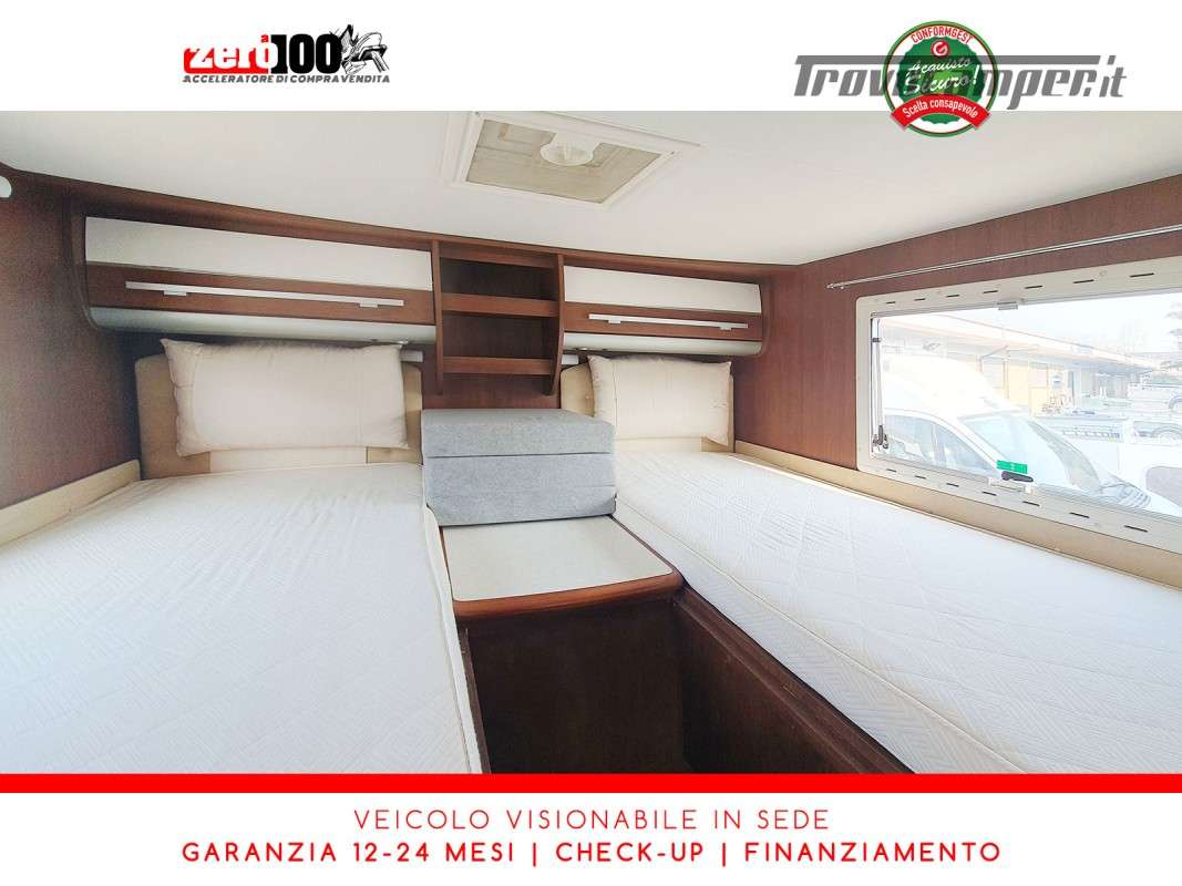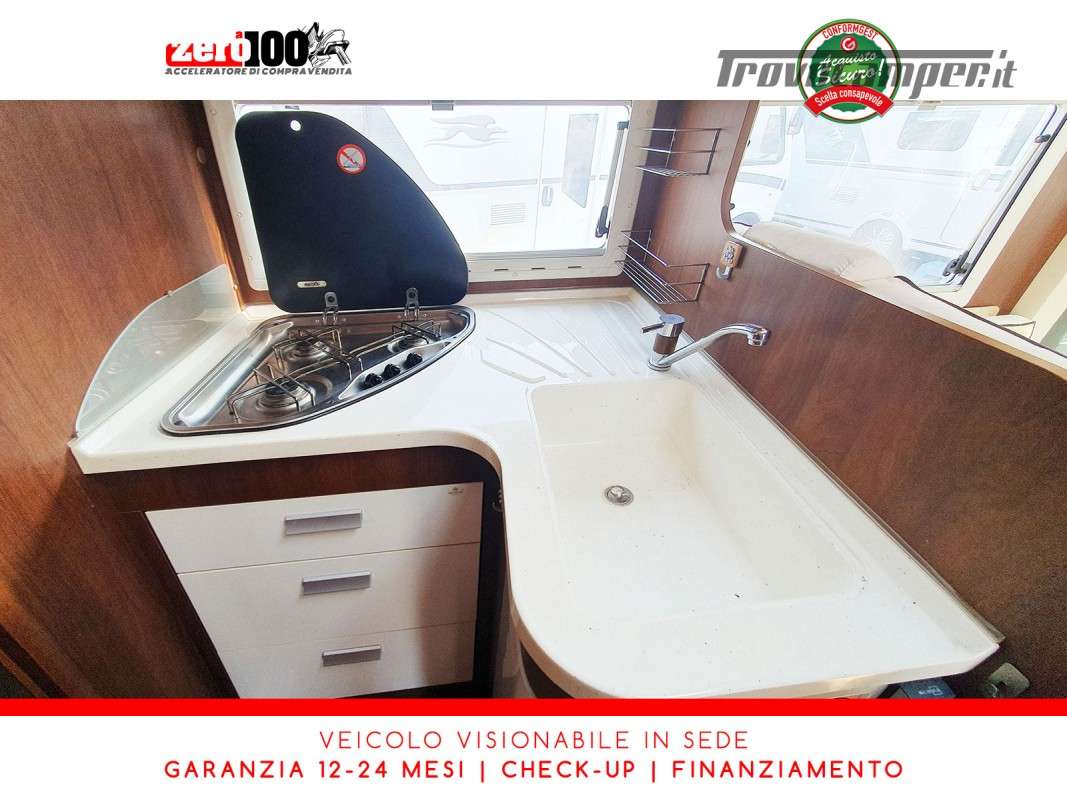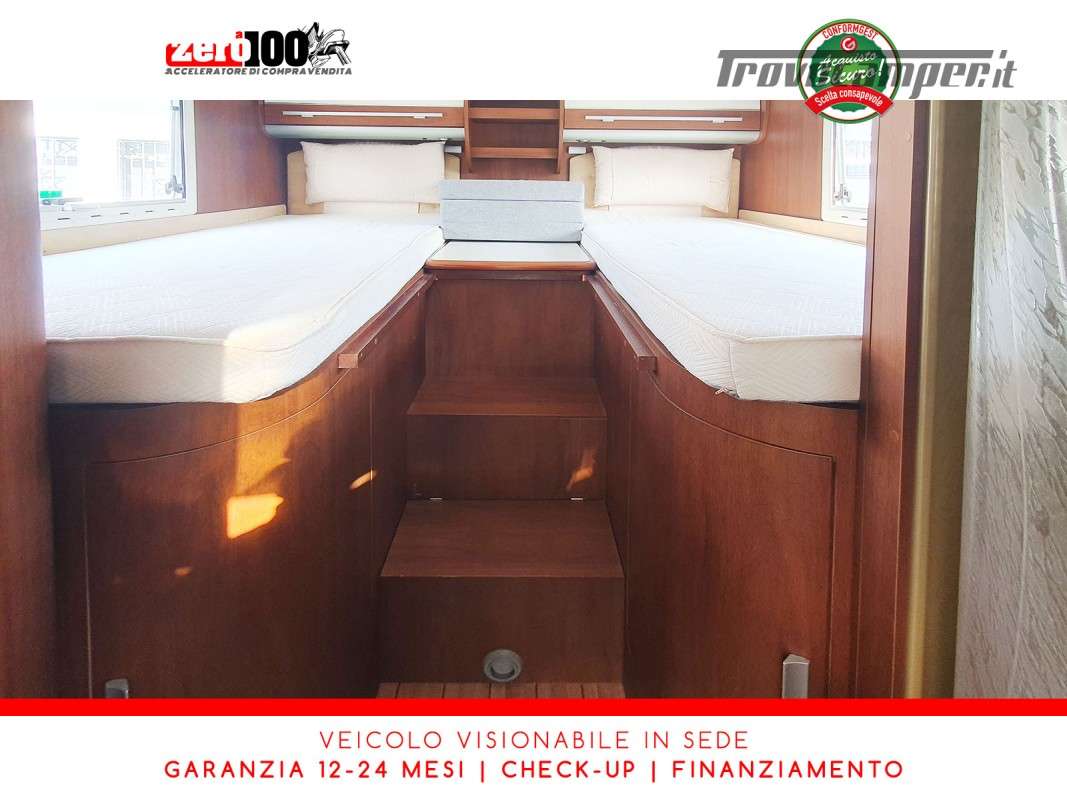 Letti gemelli in coda – Mezza dinette con sedili cabina girevoli – Letto matrimoniale basculante anteriore – Cucina a L 3 fuochi con Frigorifero trivalente 150 lt automatico contrapposto – Bagno composto da 2 vani separati e Doccia indipendente – Garage