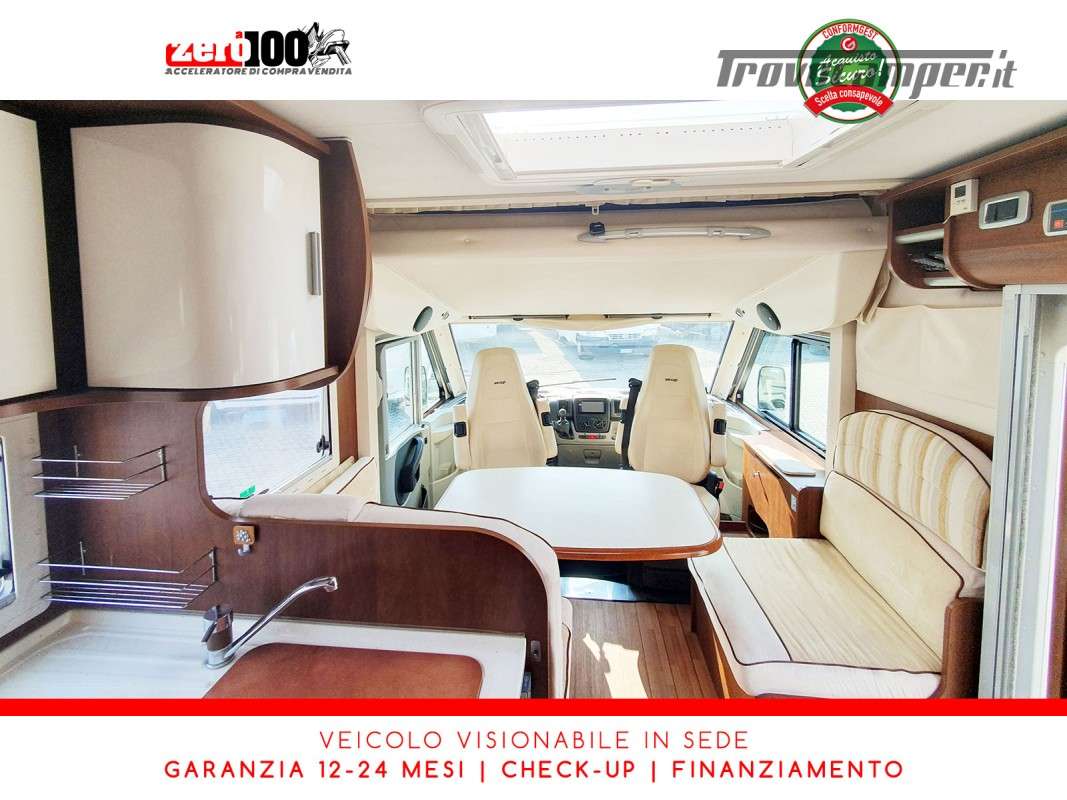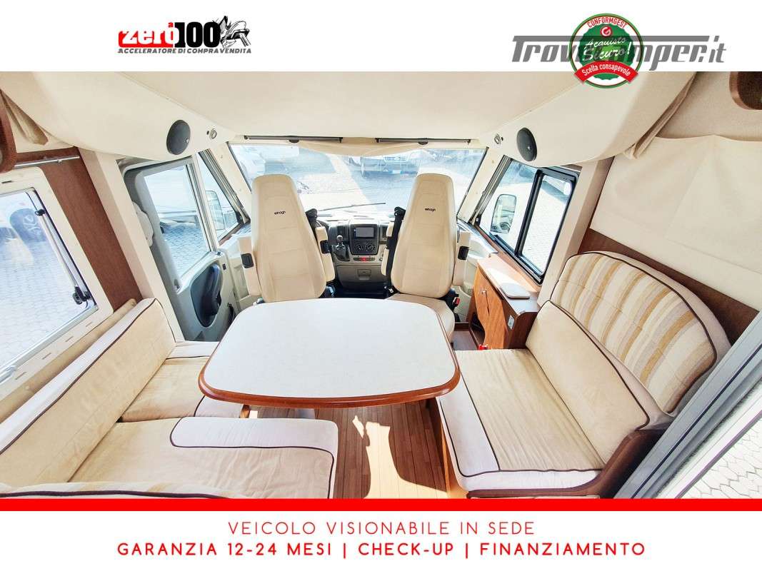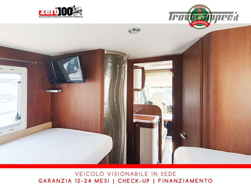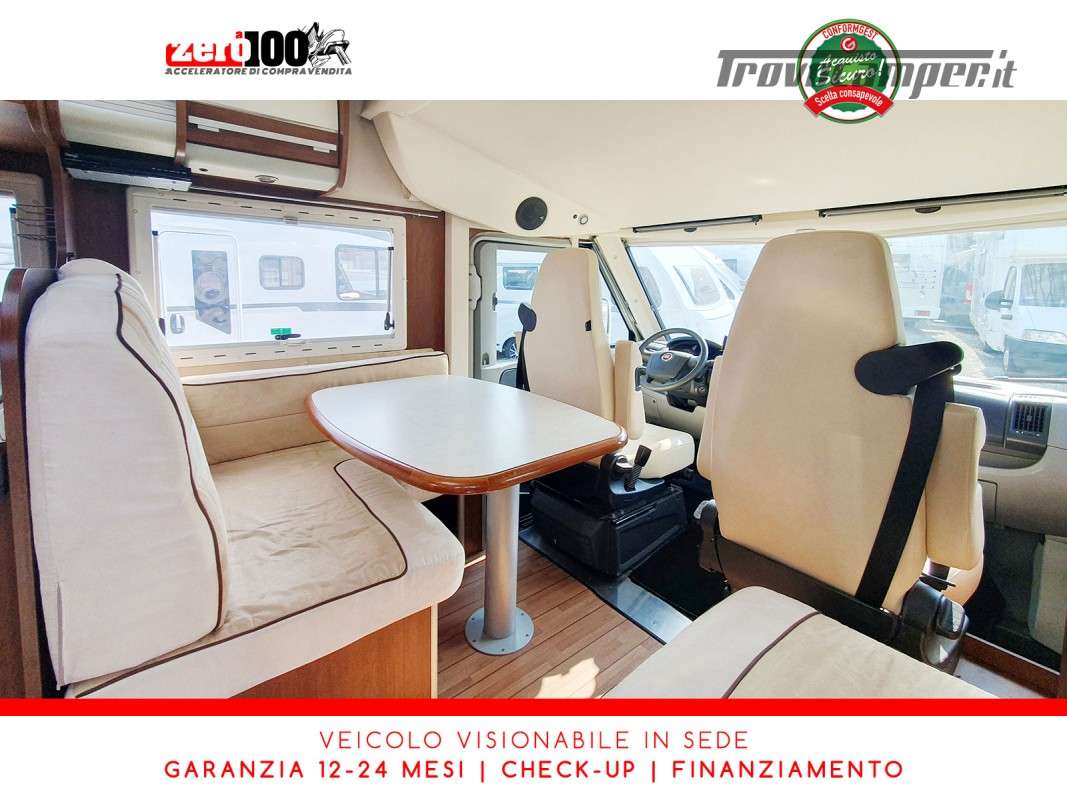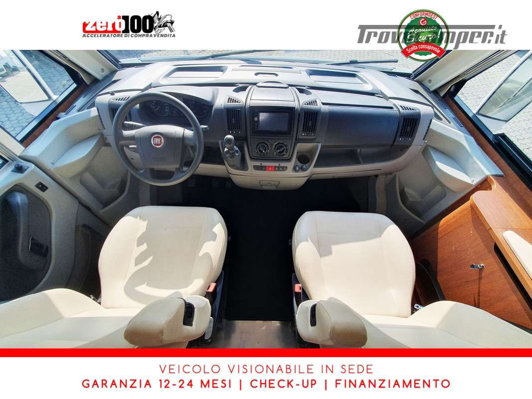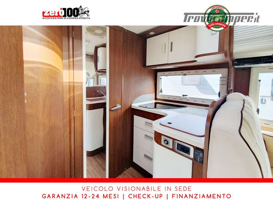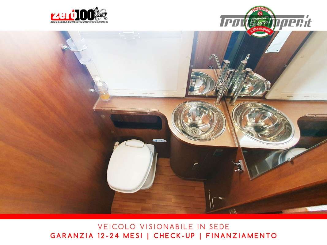 Letti gemelli in coda – Mezza dinette con sedili cabina girevoli – Letto matrimoniale basculante anteriore – Cucina a L 3 fuochi con Frigorifero trivalente 150 lt automatico contrapposto – Bagno composto da 2 vani separati e Doccia indipendente – Garage