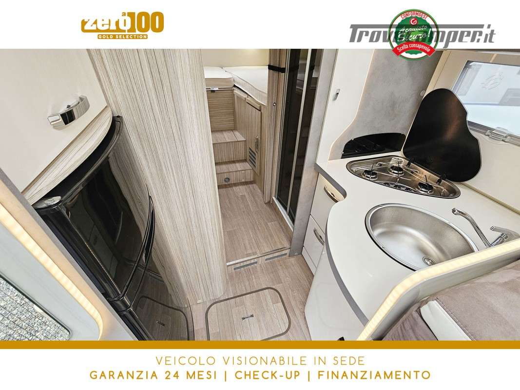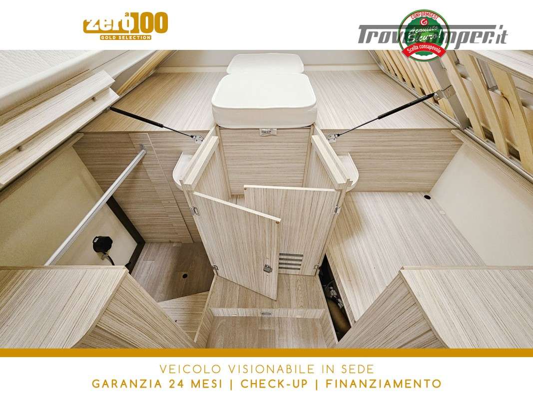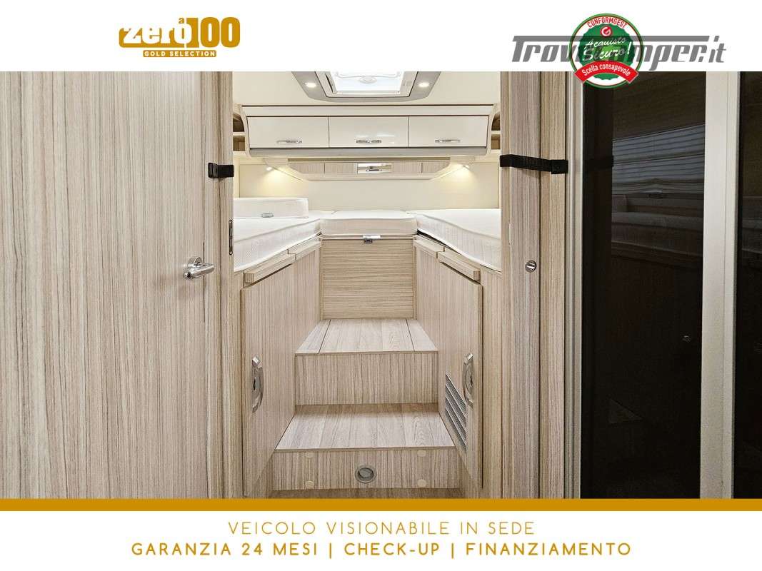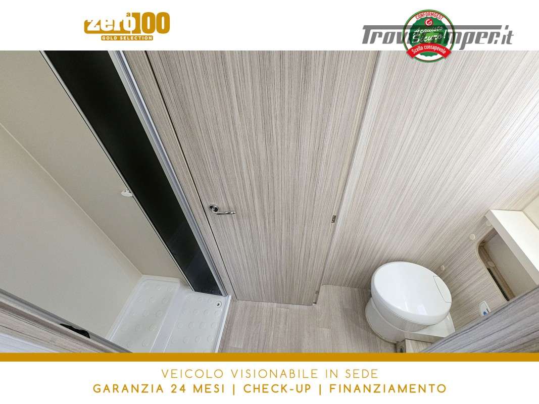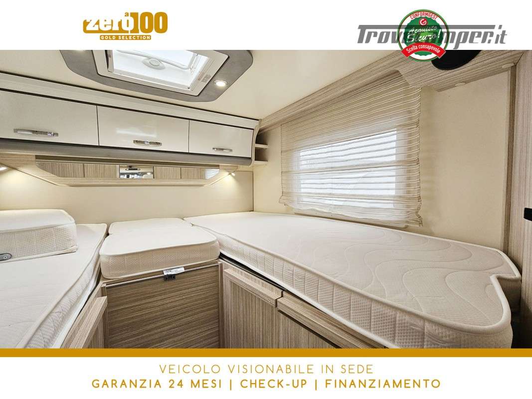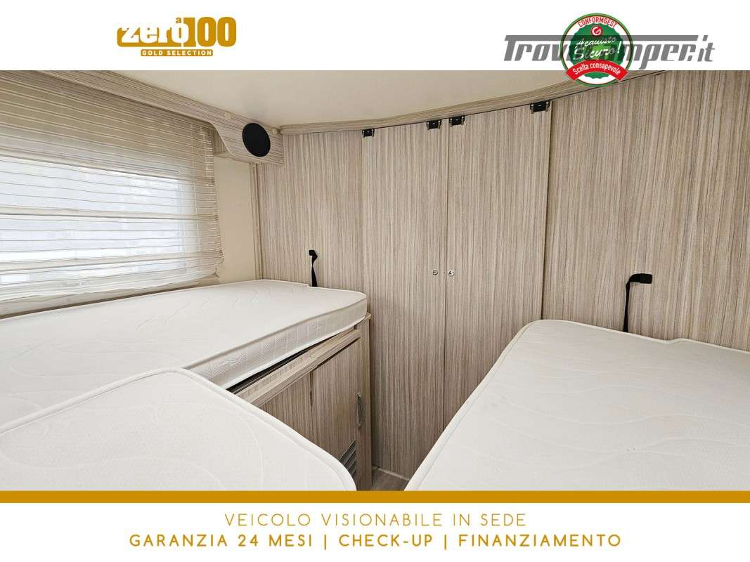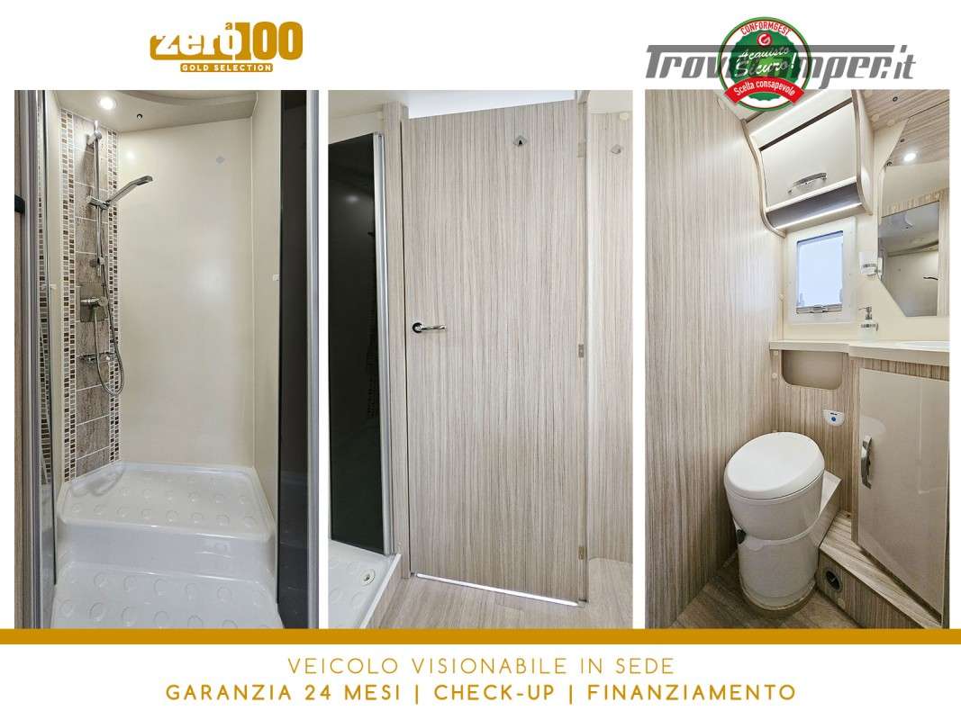 Letti gemelli posteriori in coda – Dinette a L con sedili girevoli – Letto matrimoniale basculante anteriore – Cucina a L 3 fuochi con frigorifero trivalente alto con cella freezer separata – Bagno finestrato composto da 2 vani separati e Doccia indipendente – Garage