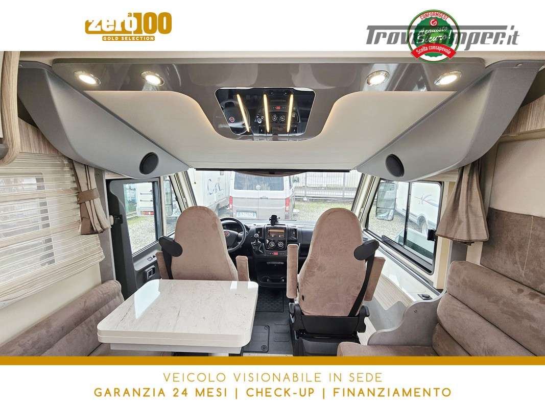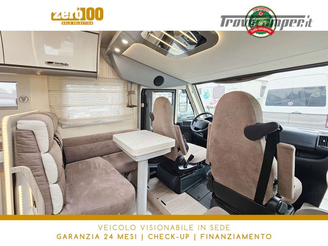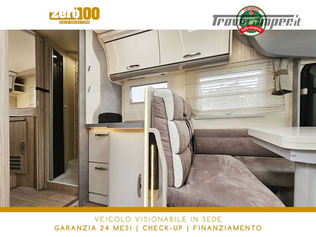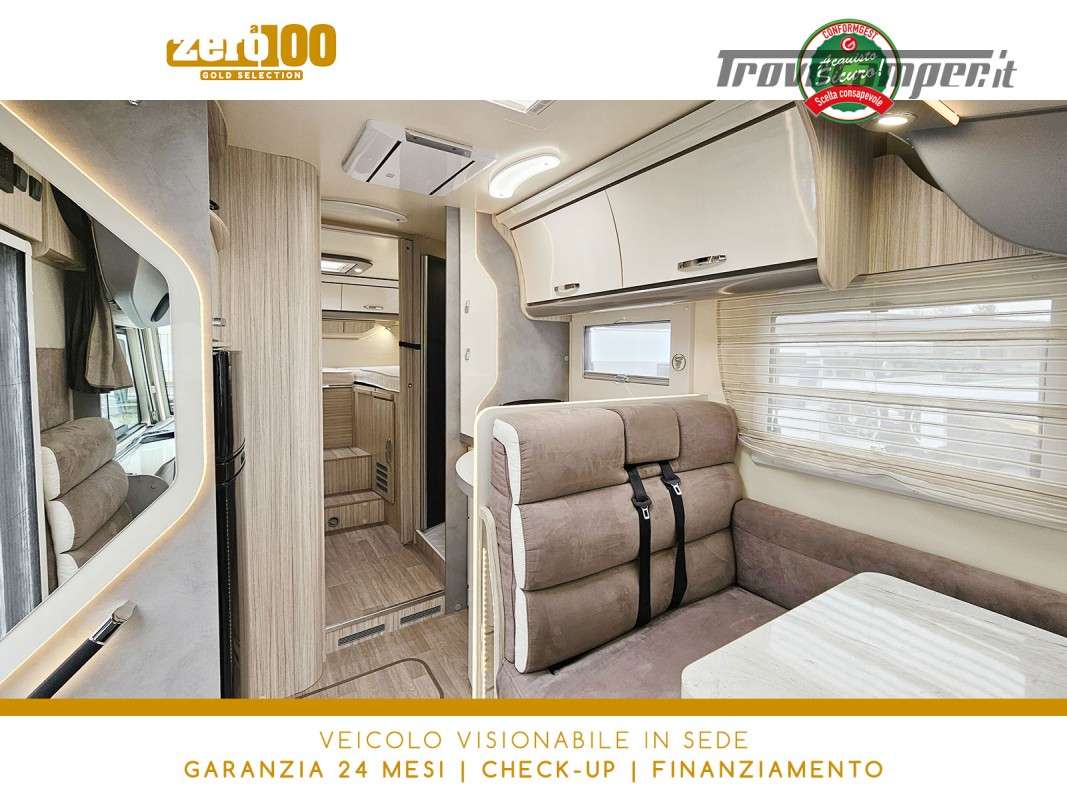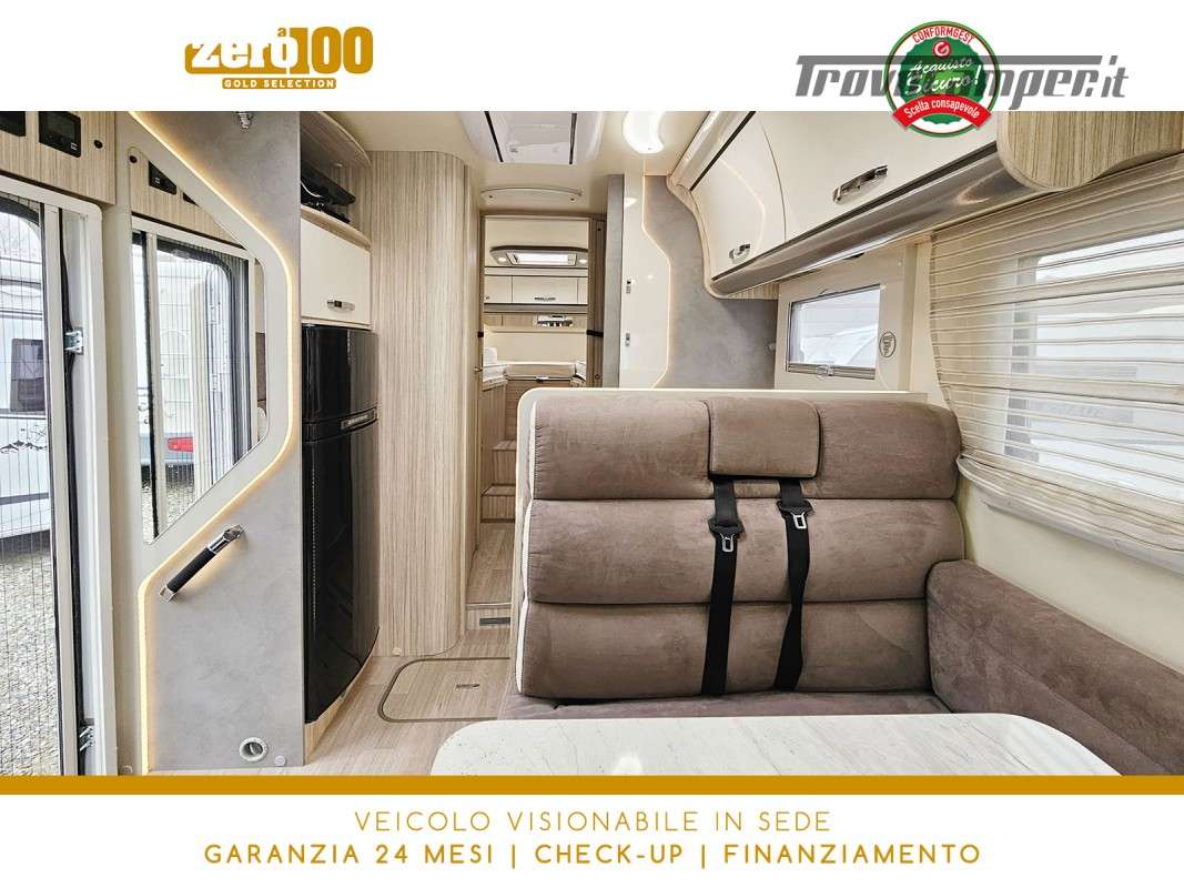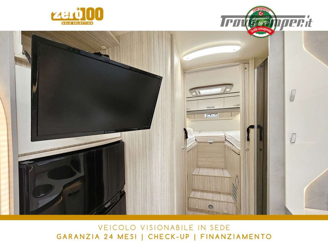 Letti gemelli posteriori in coda – Dinette a L con sedili girevoli – Letto matrimoniale basculante anteriore – Cucina a L 3 fuochi con frigorifero trivalente alto con cella freezer separata – Bagno finestrato composto da 2 vani separati e Doccia indipendente – Garage