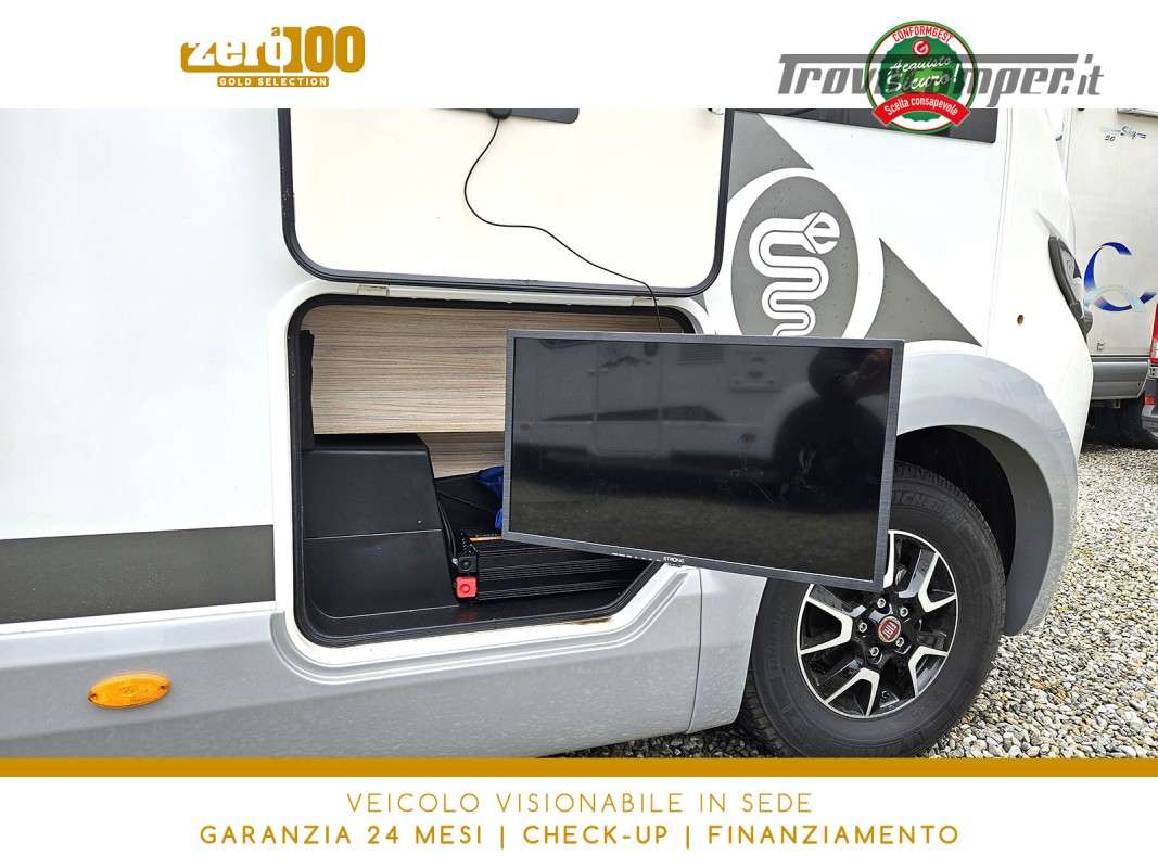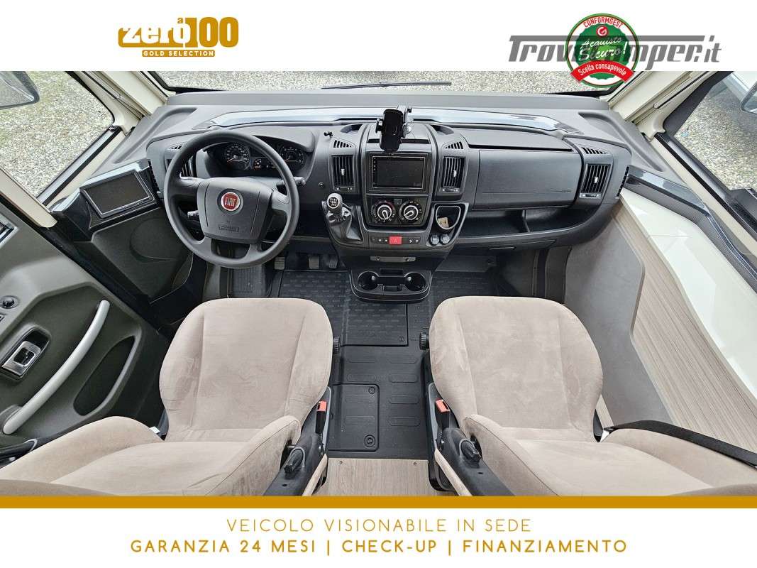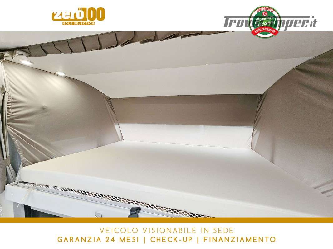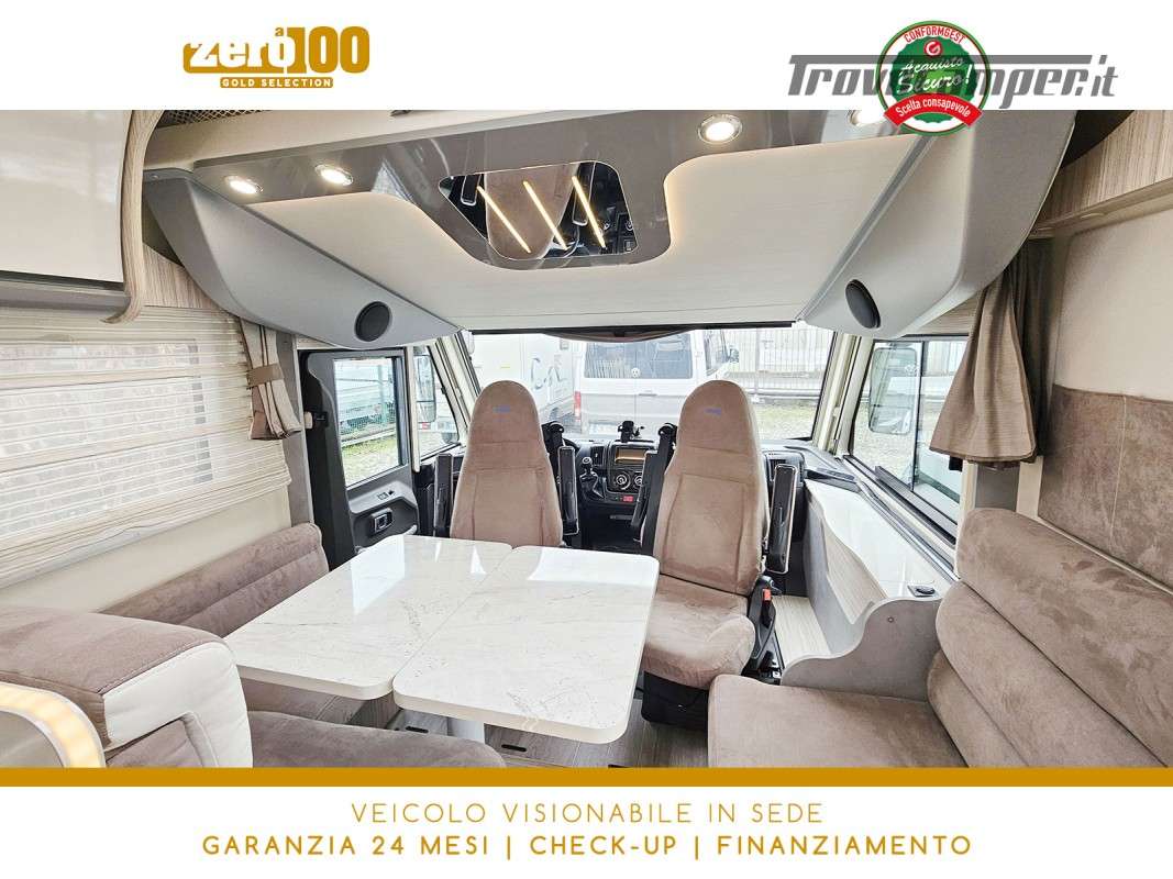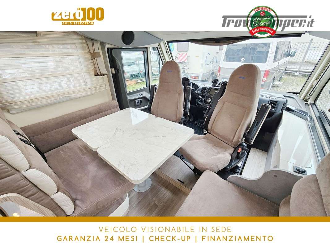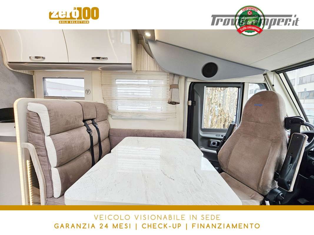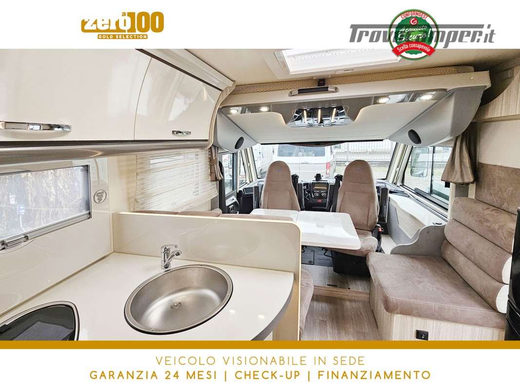 Letti gemelli posteriori in coda – Dinette a L con sedili girevoli – Letto matrimoniale basculante anteriore – Cucina a L 3 fuochi con frigorifero trivalente alto con cella freezer separata – Bagno finestrato composto da 2 vani separati e Doccia indipendente – Garage