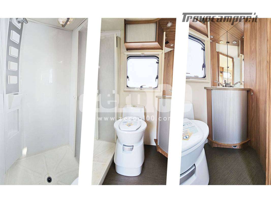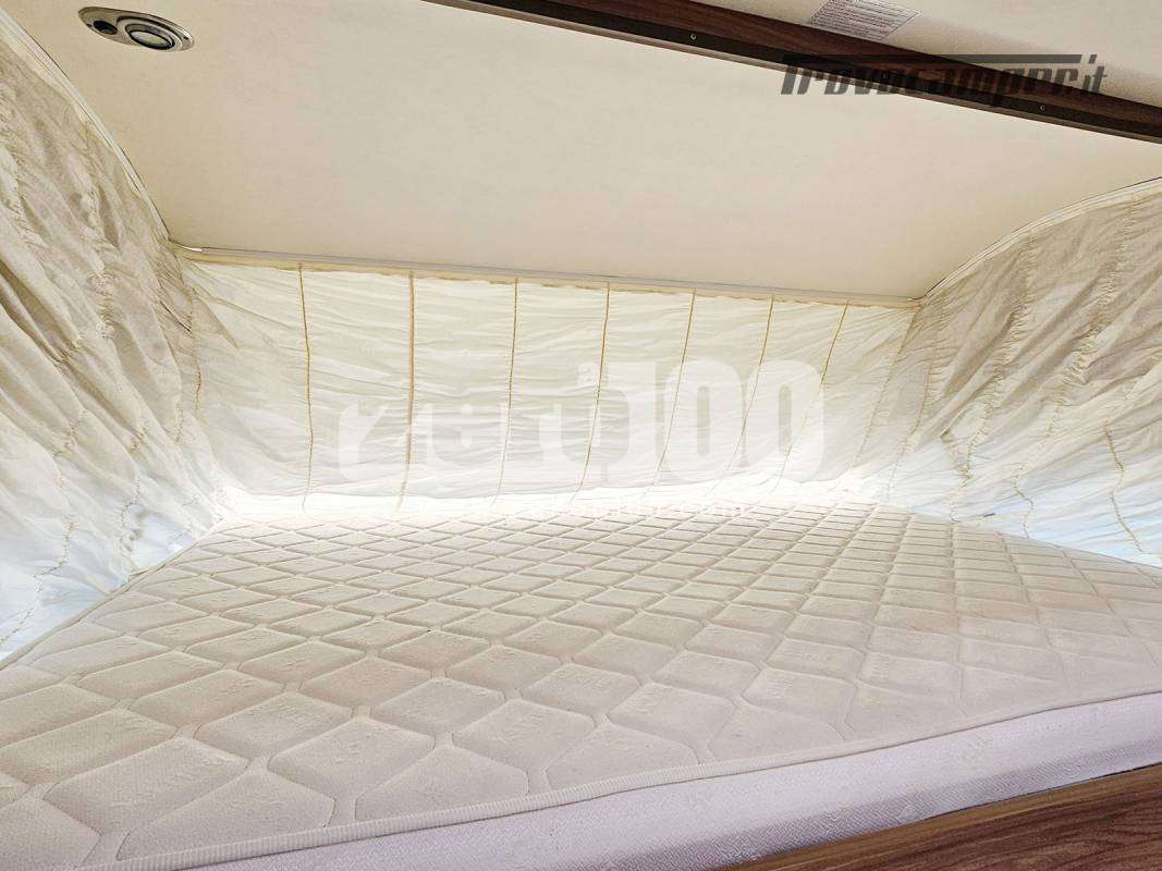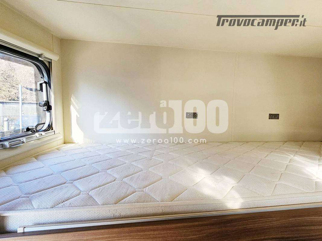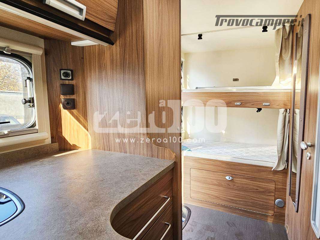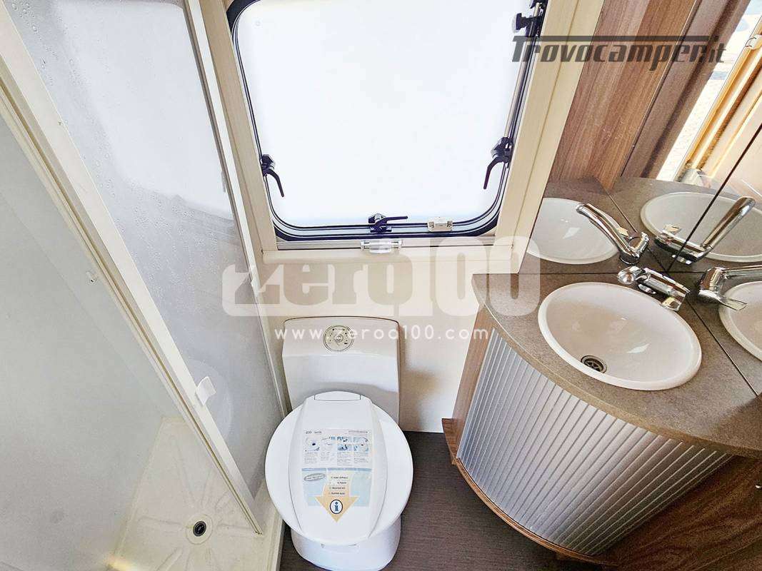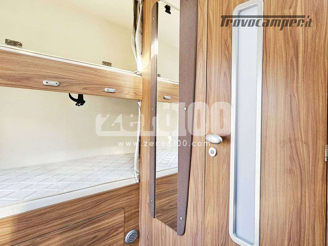 Letto matrimoniale trasversale anteriore – Letti a castello posteriori trasversali a volume variabile – Ampia zona giorno con dinette Face-to-Face trasformabile in letto matrimoniale – Cucina a L 3 fuochi con piezo, Frigorifero trivalente alto con cella freezer separata – Toilette finestrata e Box doccia separato con areatore