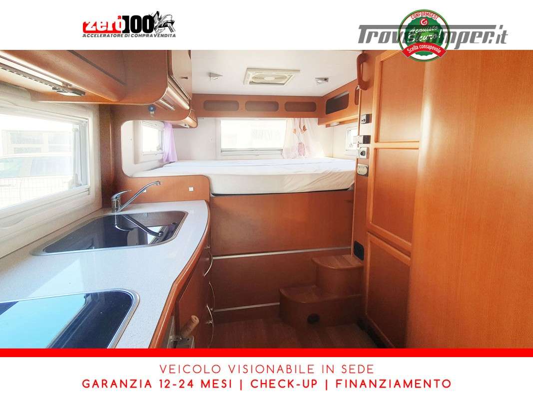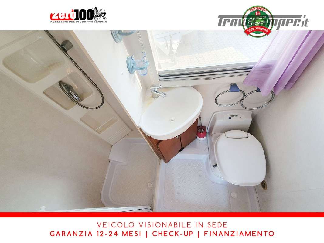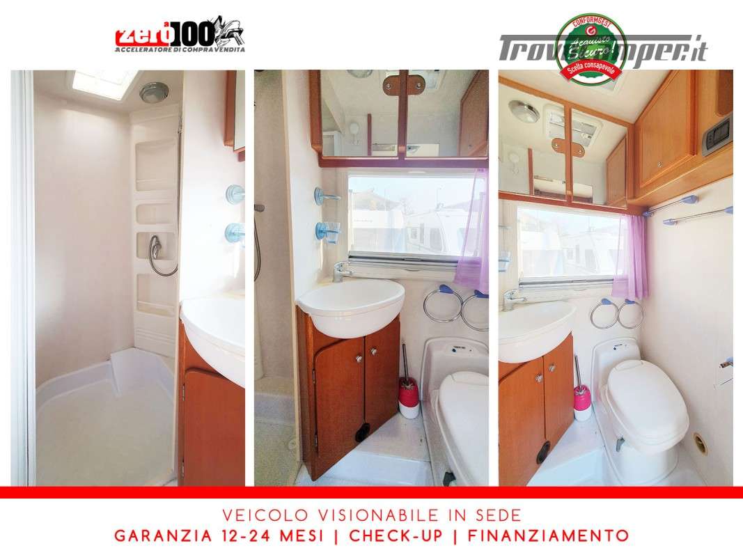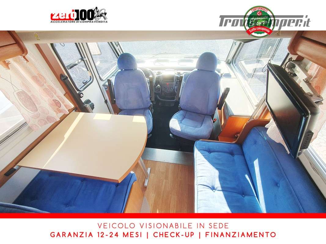 Letto matrimoniale trasversale in coda – Mezza dinette con sedili cabina girevoli – Cucina lineare 3 fuochi con frigorifero trivalente 110 lt – Bagno con doccia separata – Letto matrimoniale basculante – Garage