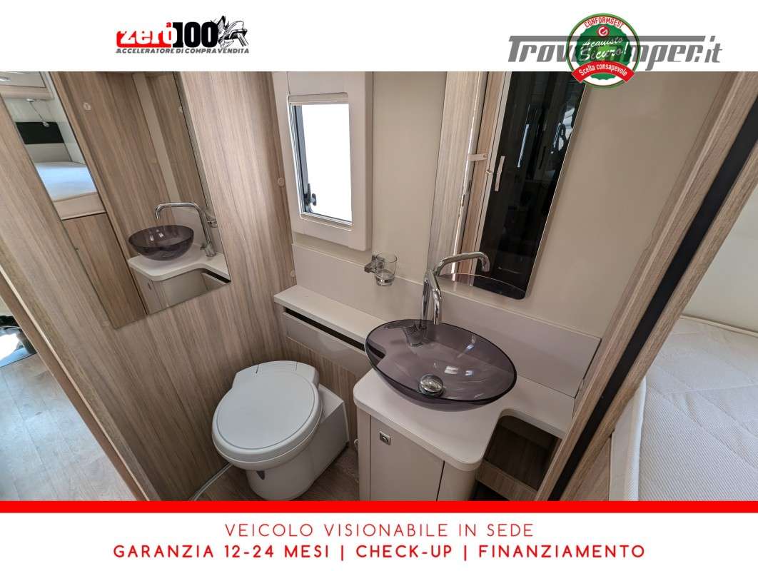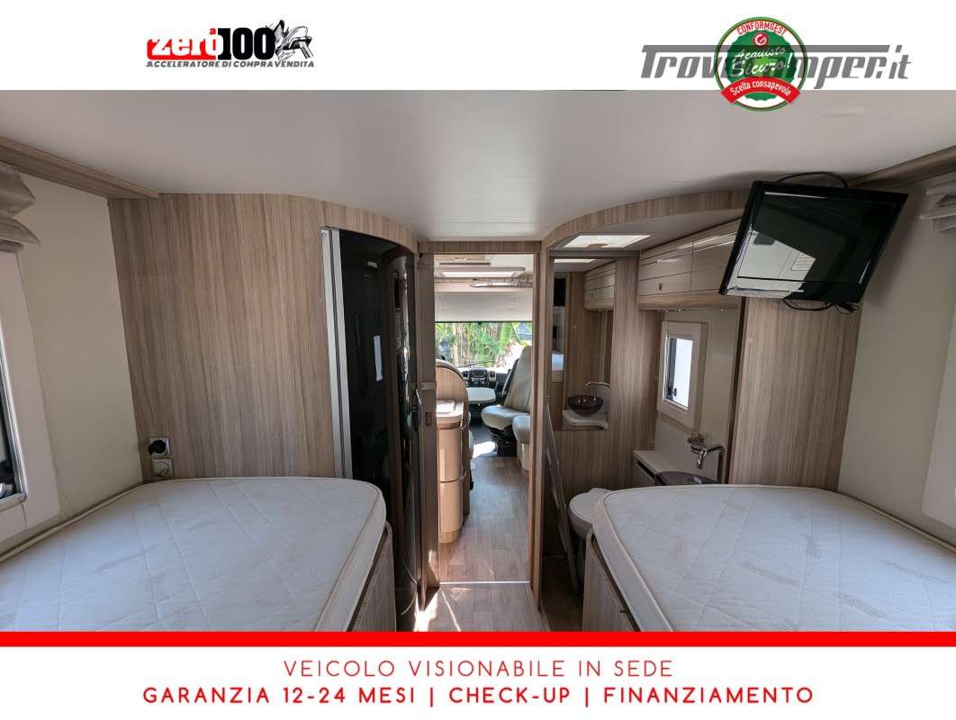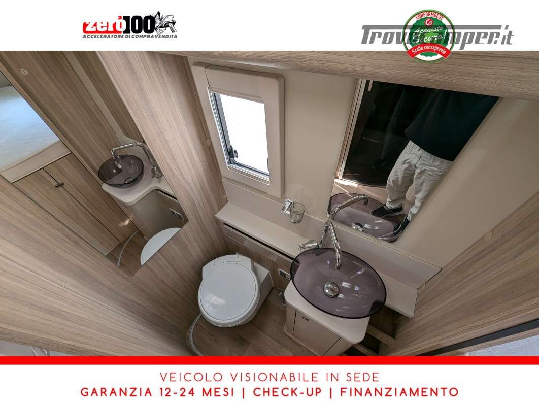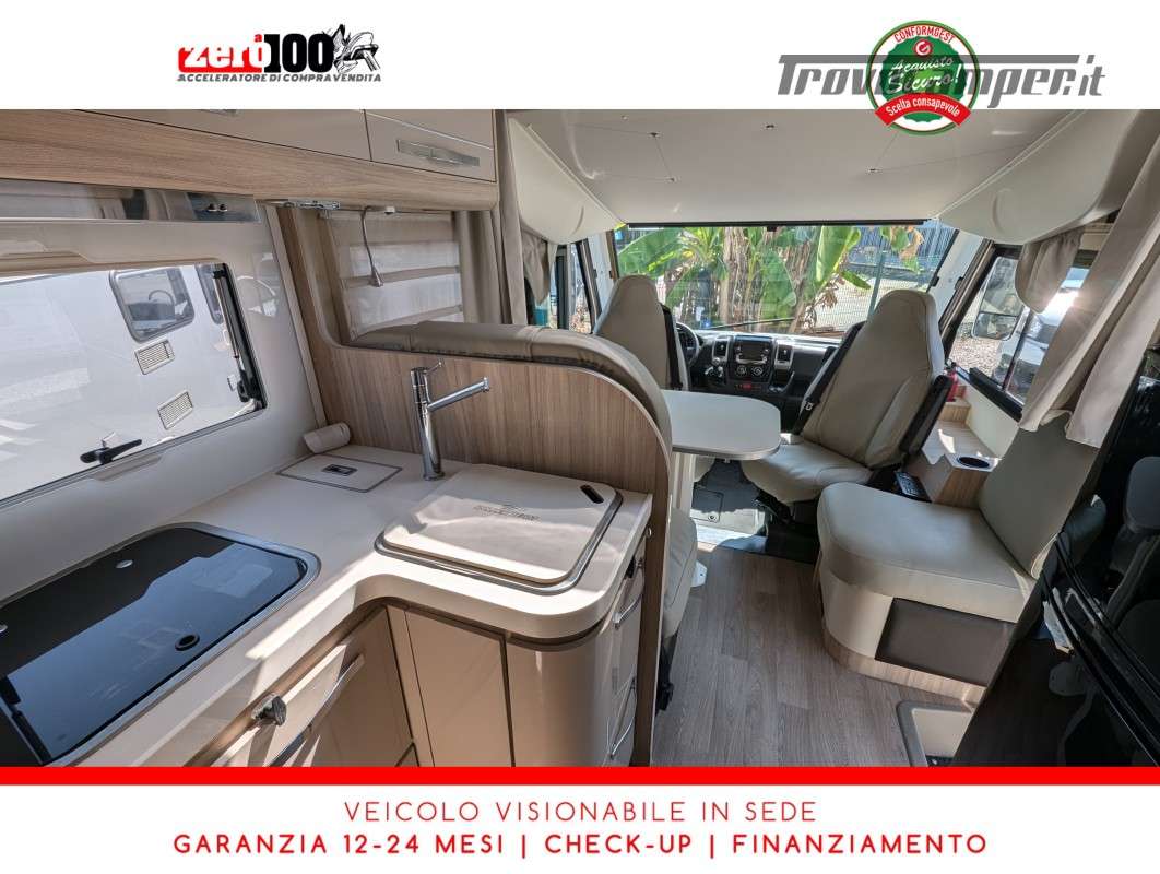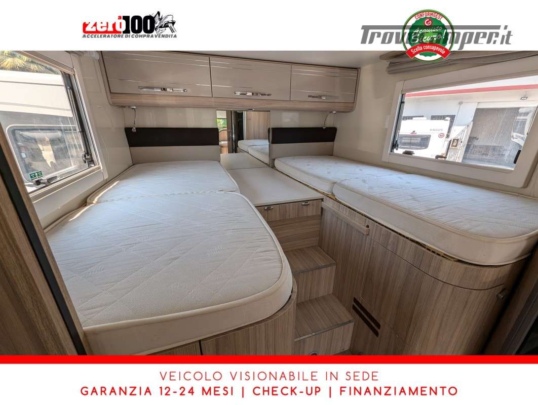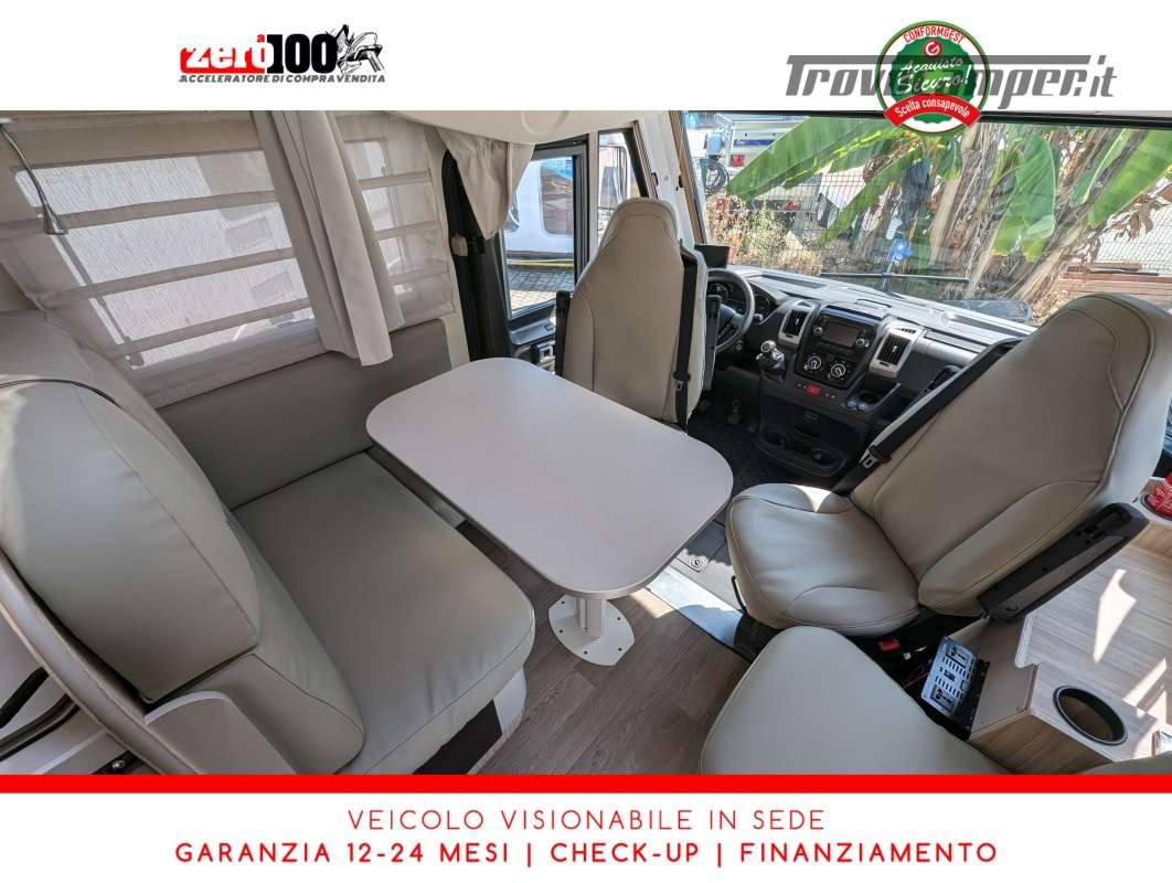 Dinette a L con panca laterale e sedili cabina girevoli - Cucina a L 3 fuochi con piezo, cappa aspirante e Frigorifero trivalente 150 lt automatico - Letti gemelli in coda - Letto matrimoniale basculante anteriore - Bagno composto da 2 vani separati e Doccia indipendente - Garage