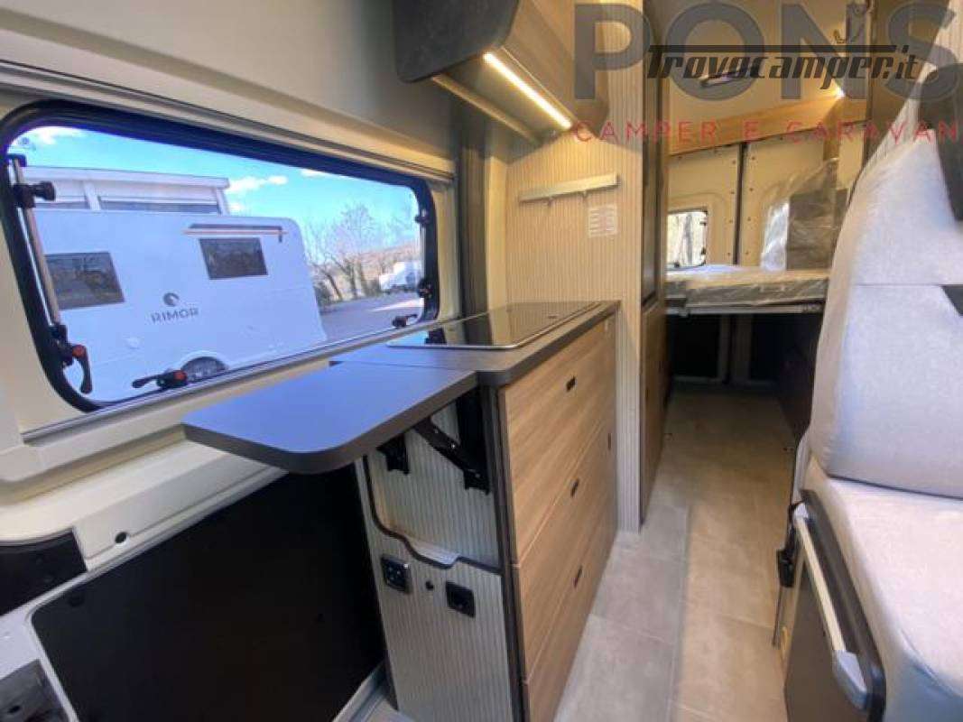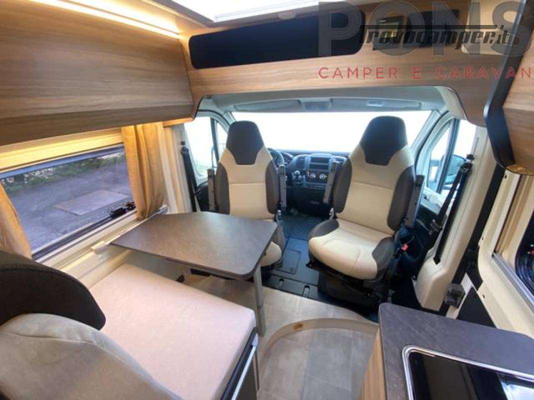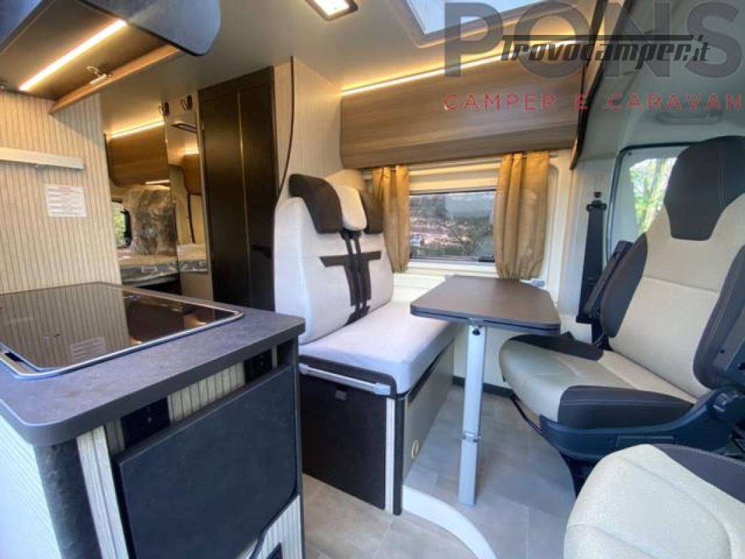 Cucina attrezzata con piano cottura a 2 fuochi, frigorifero a colonna e ampi spazi di stivaggio. Bagno con doccia, e una comoda dinette con tavolo dotato di prolunga ruotabile e sedili cabina girevoli.