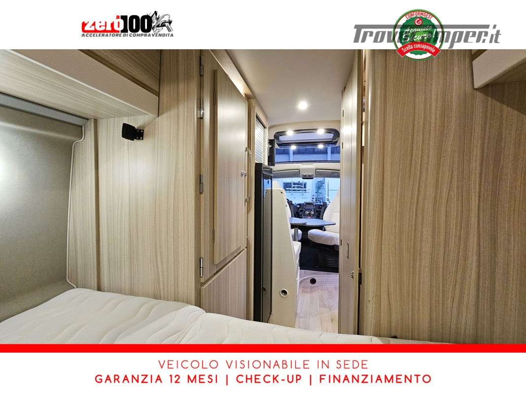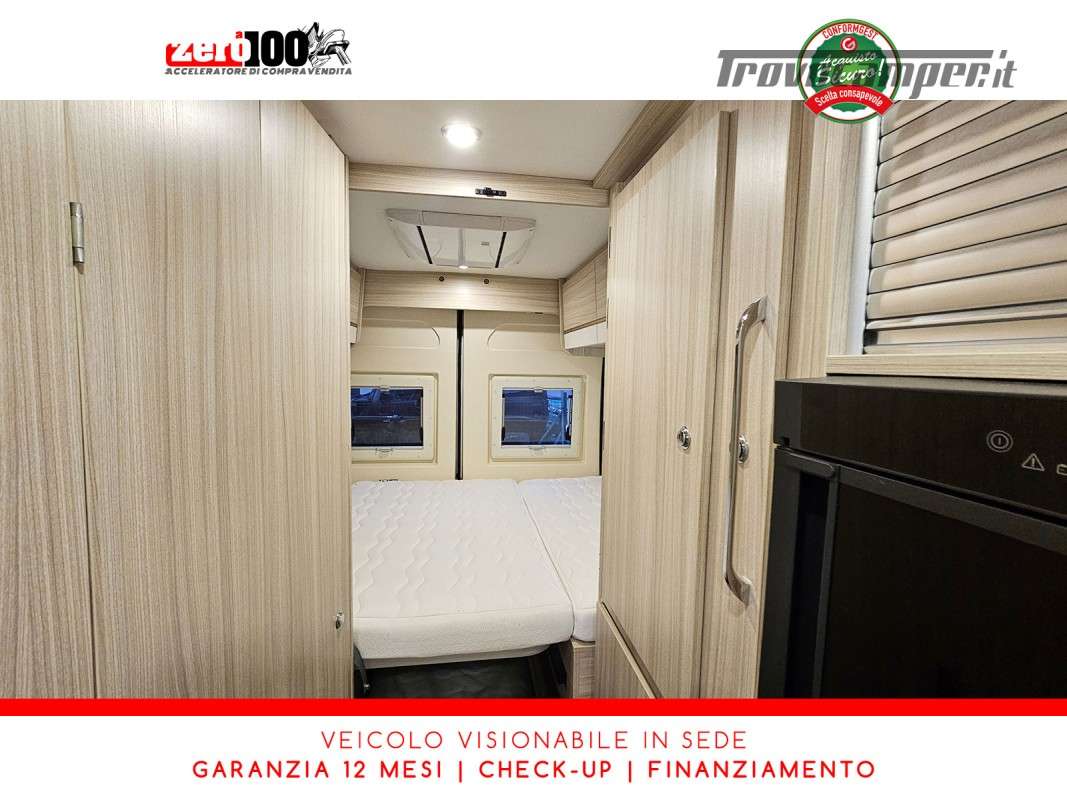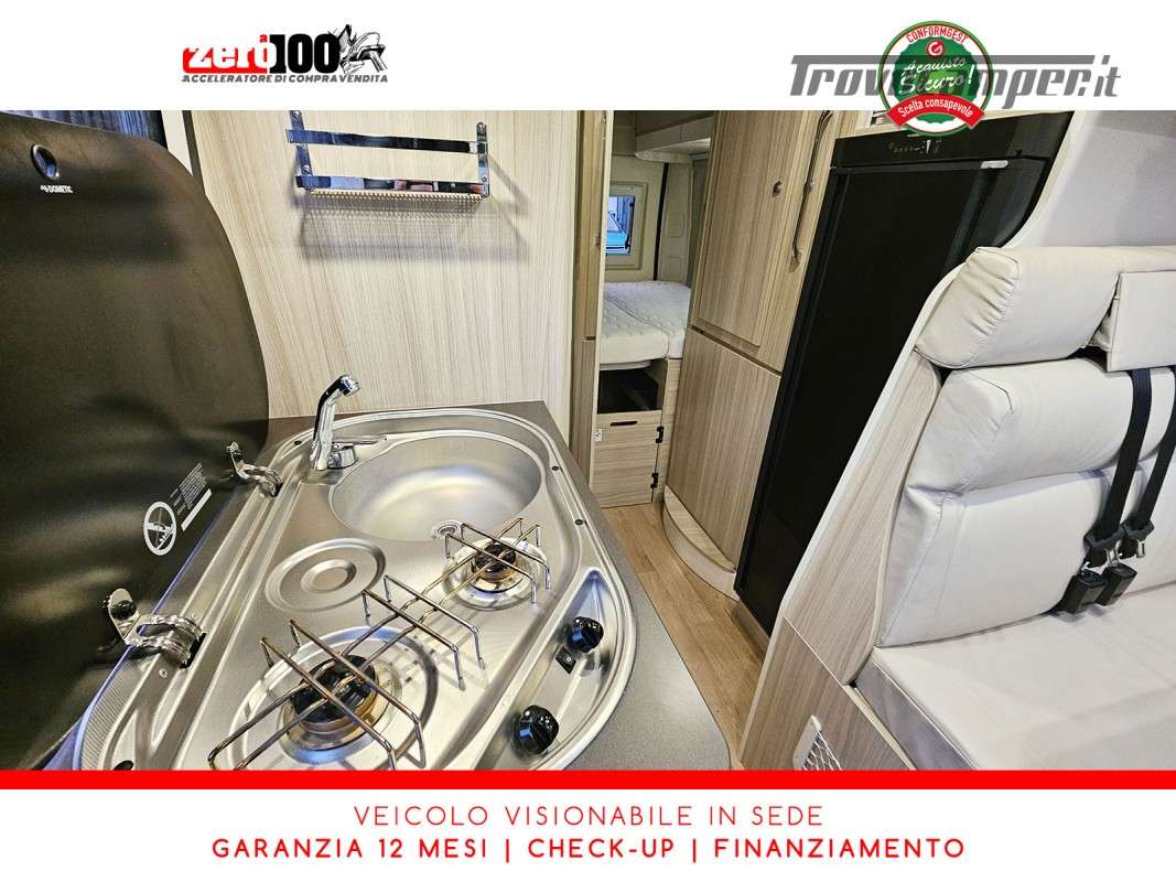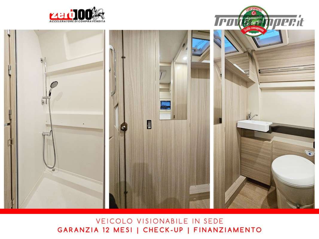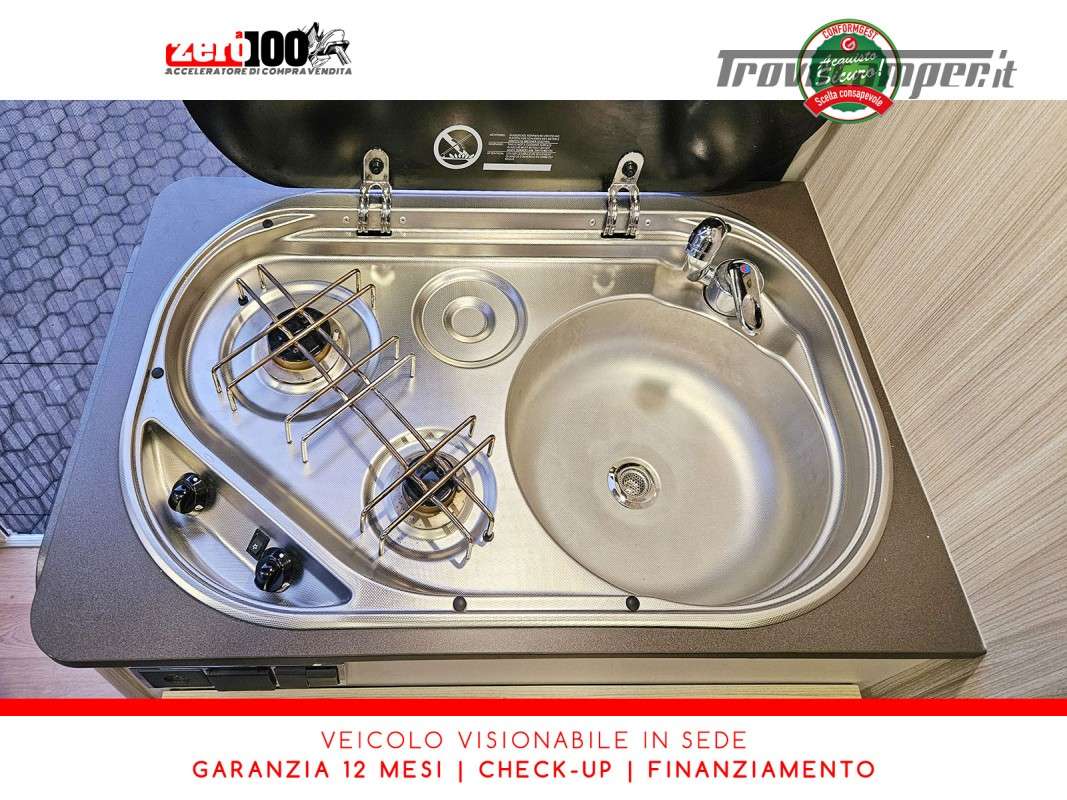 Letto matrimoniale trasversale in coda - Mezza dinette con sedili cabina girevoli trasformabile in letto singolo - Cucina lineare 2 fuochi con piezo - Frigorifero trivalente alto con cella freezer separata - Toilette e lavandino lato DX con oblo' 28 x 28 - Box doccia separato lato SX con aeratore