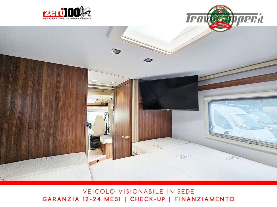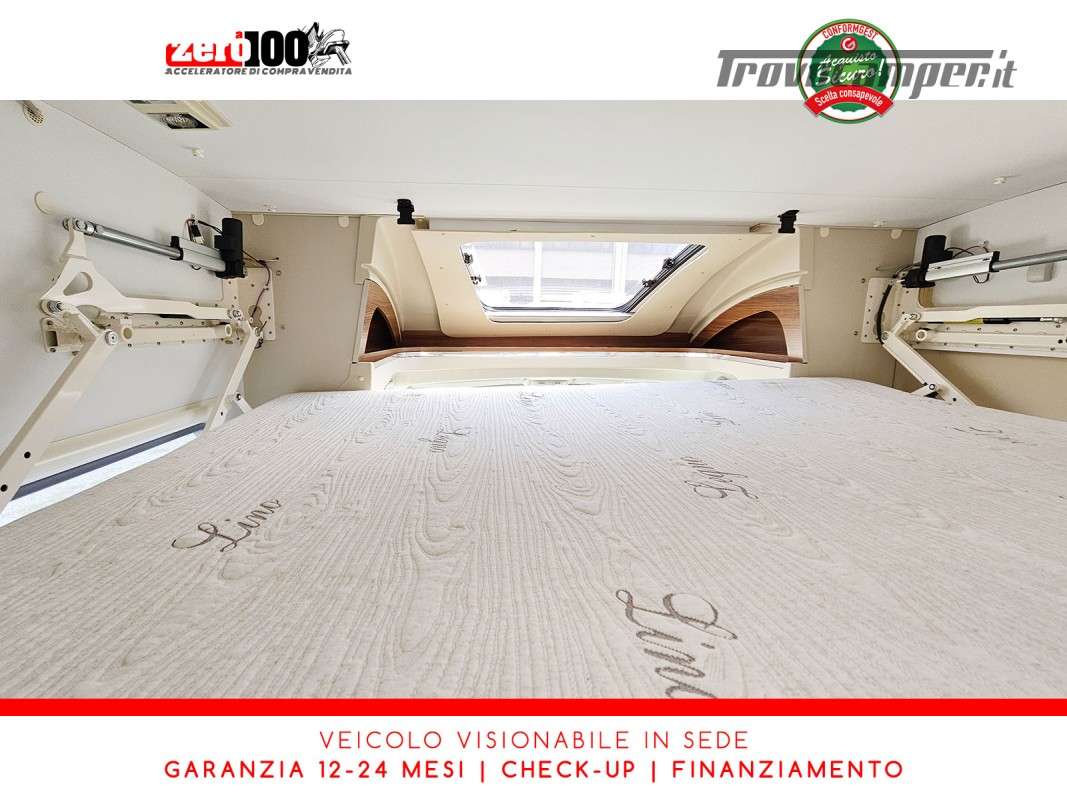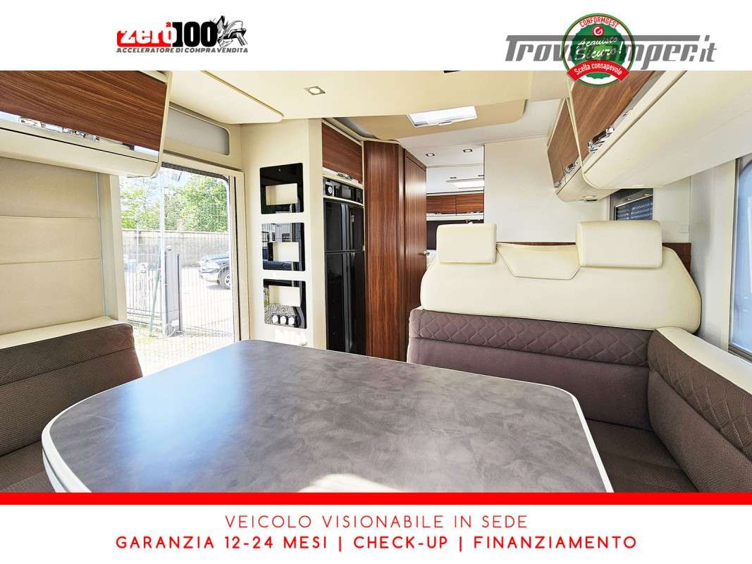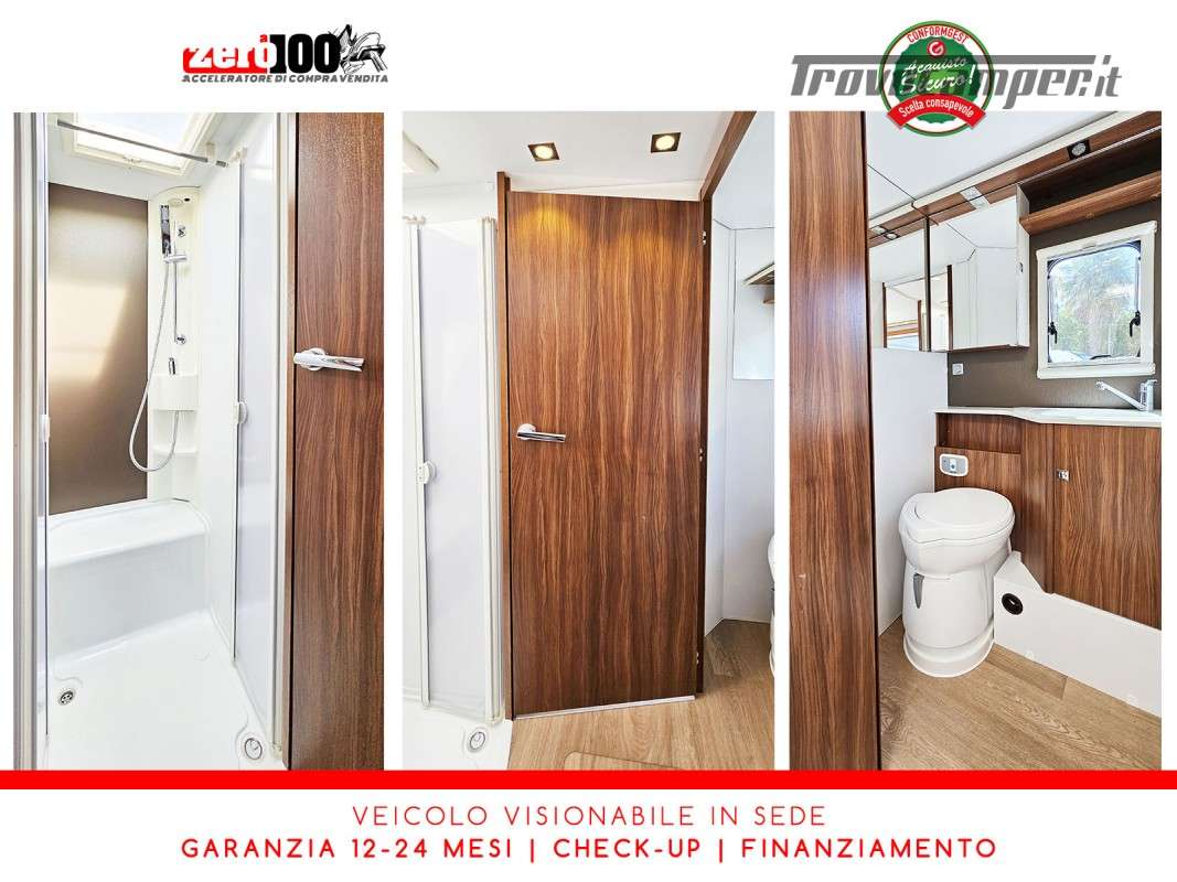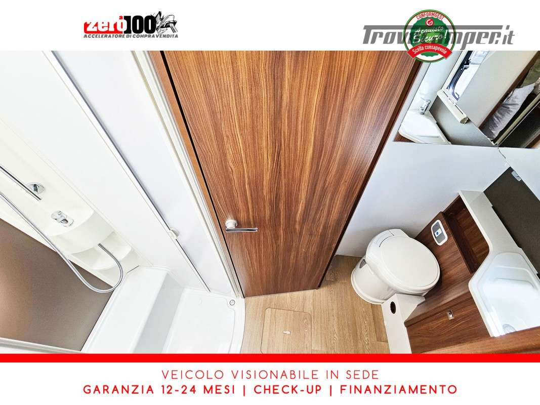 Letti gemelli in coda – Dinette a L con sedili cabina girevoli – Cucina 3 fuochi con piezo e frigorifero trivalente 150 lt automatico – Bagno in 2 vani indipendenti con box doccia separata – Letto anteriore basculante elettrico