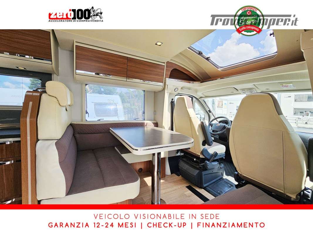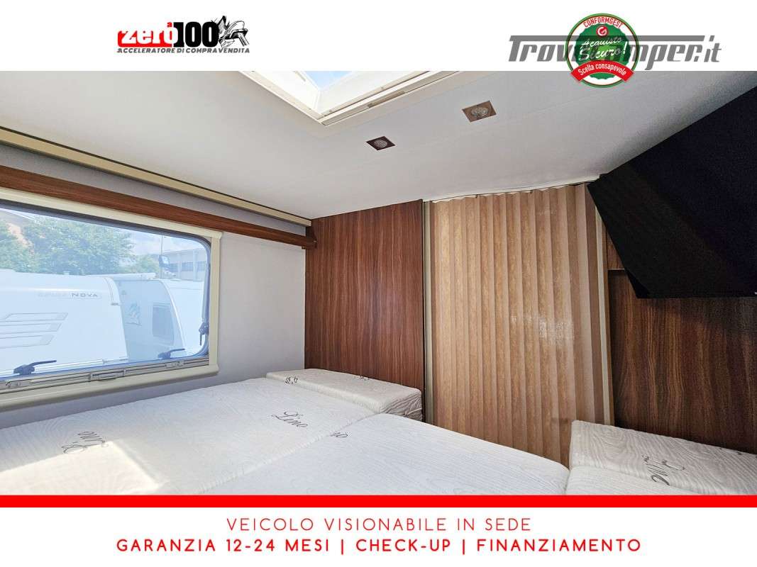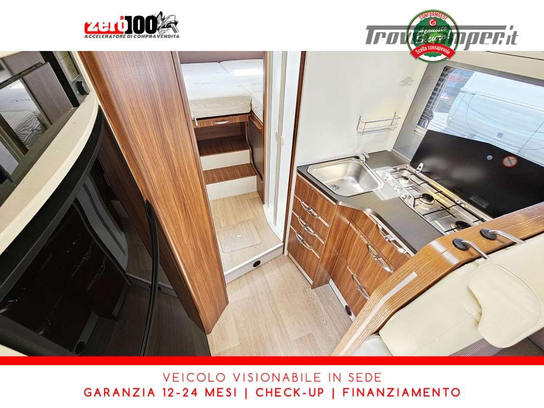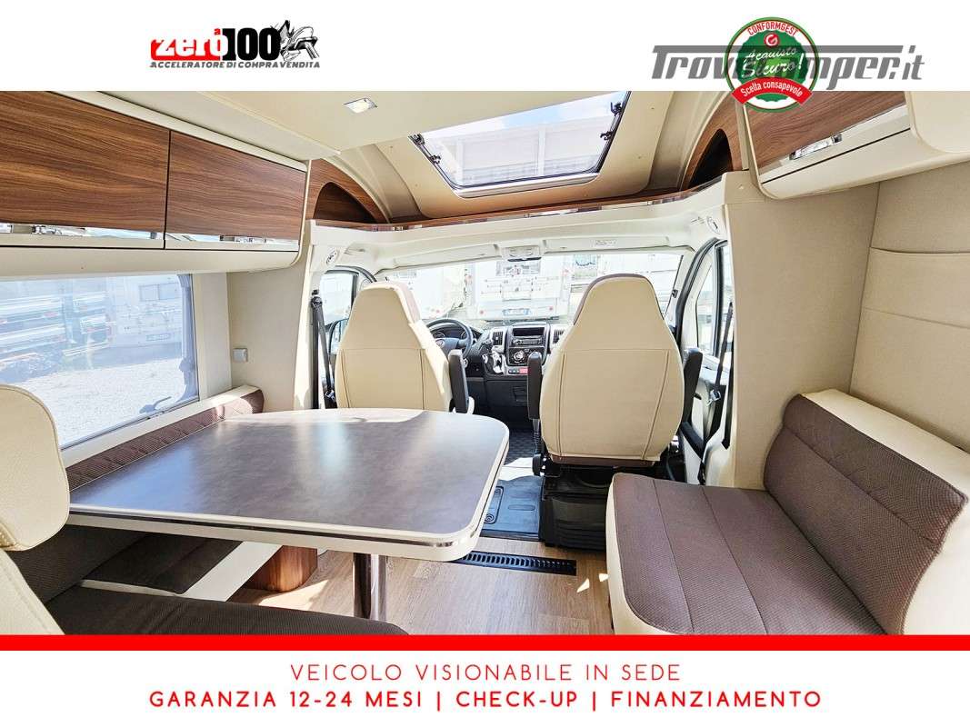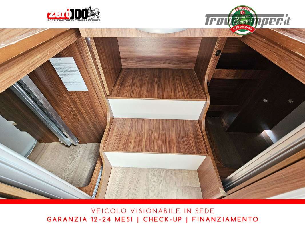 Letti gemelli in coda – Dinette a L con sedili cabina girevoli – Cucina 3 fuochi con piezo e frigorifero trivalente 150 lt automatico – Bagno in 2 vani indipendenti con box doccia separata – Letto anteriore basculante elettrico