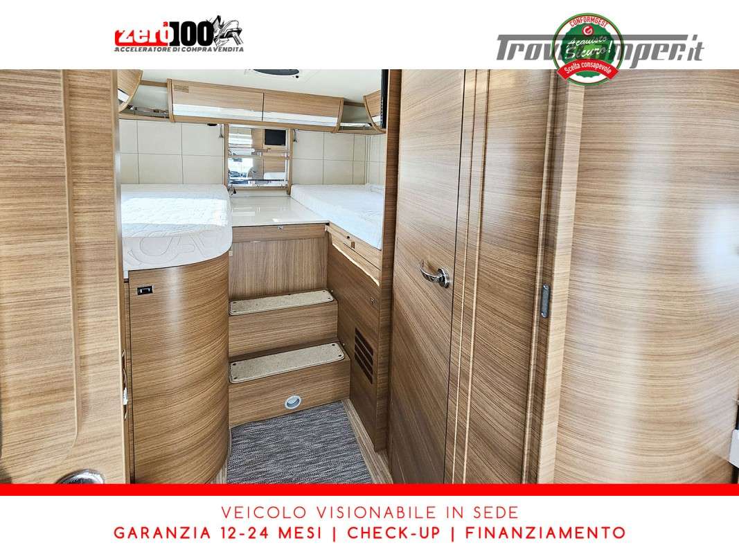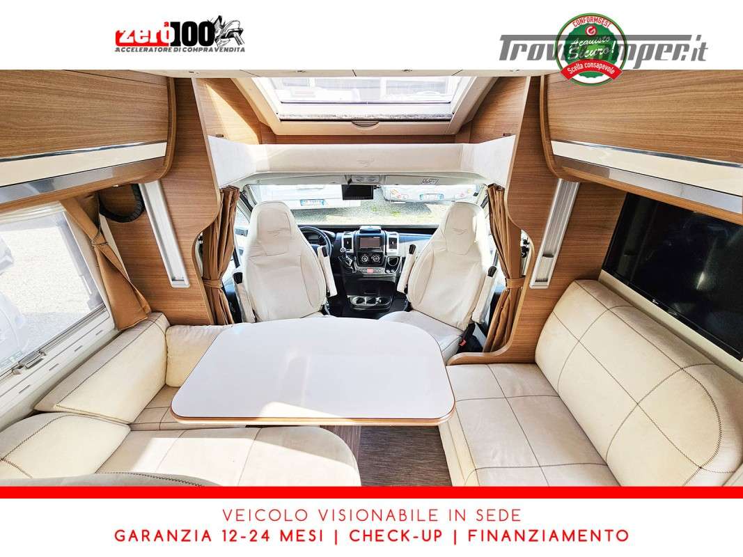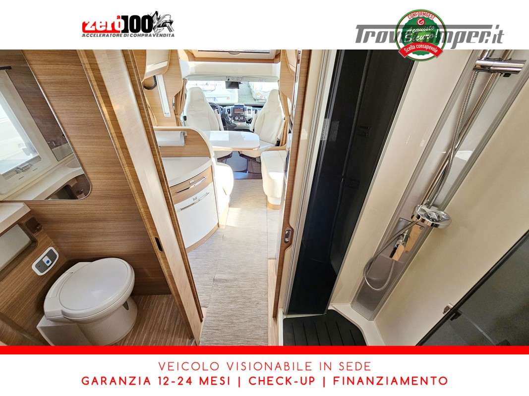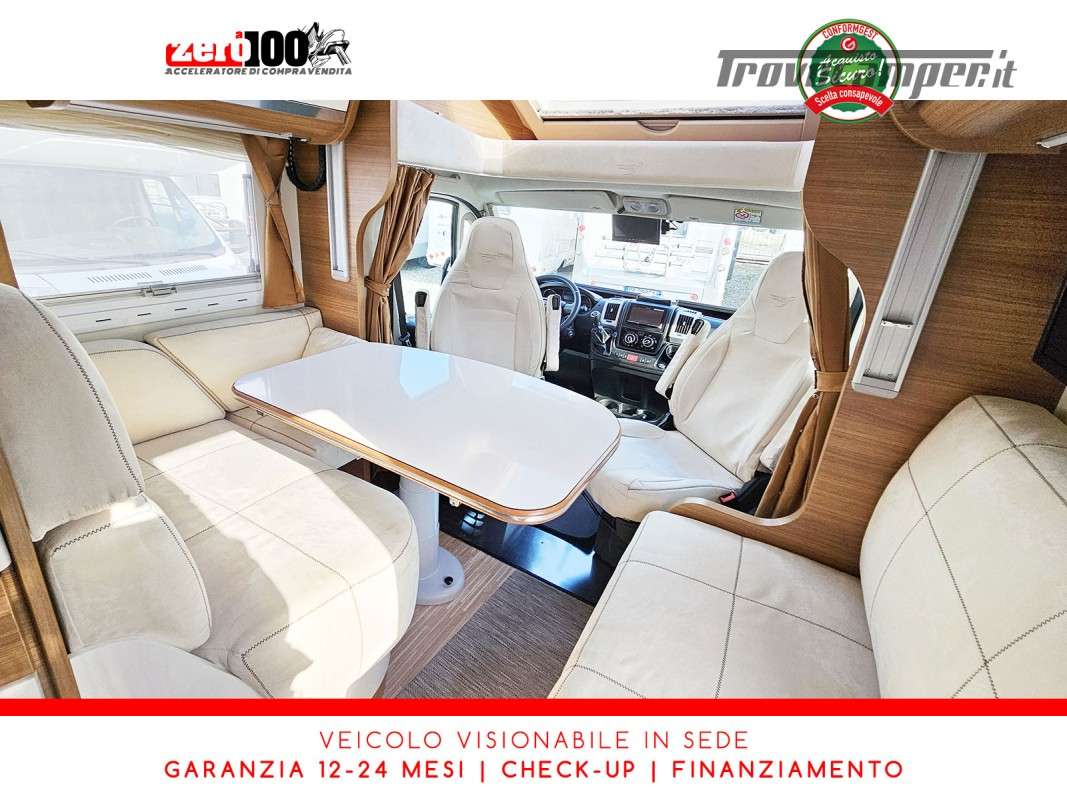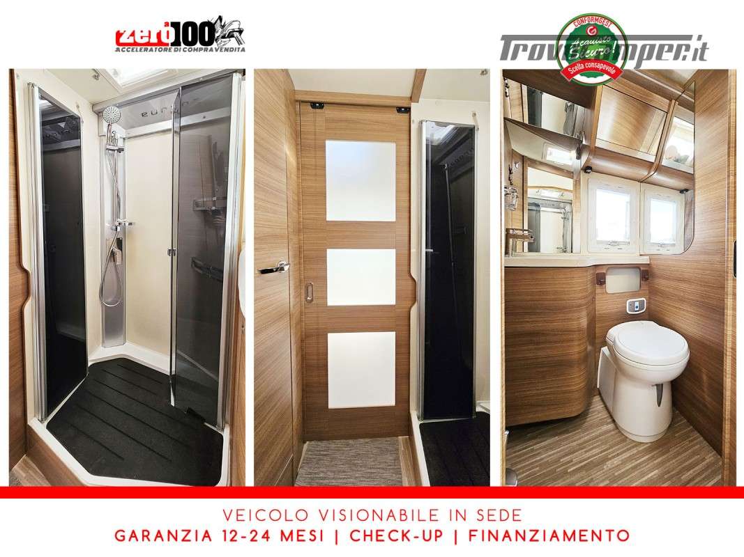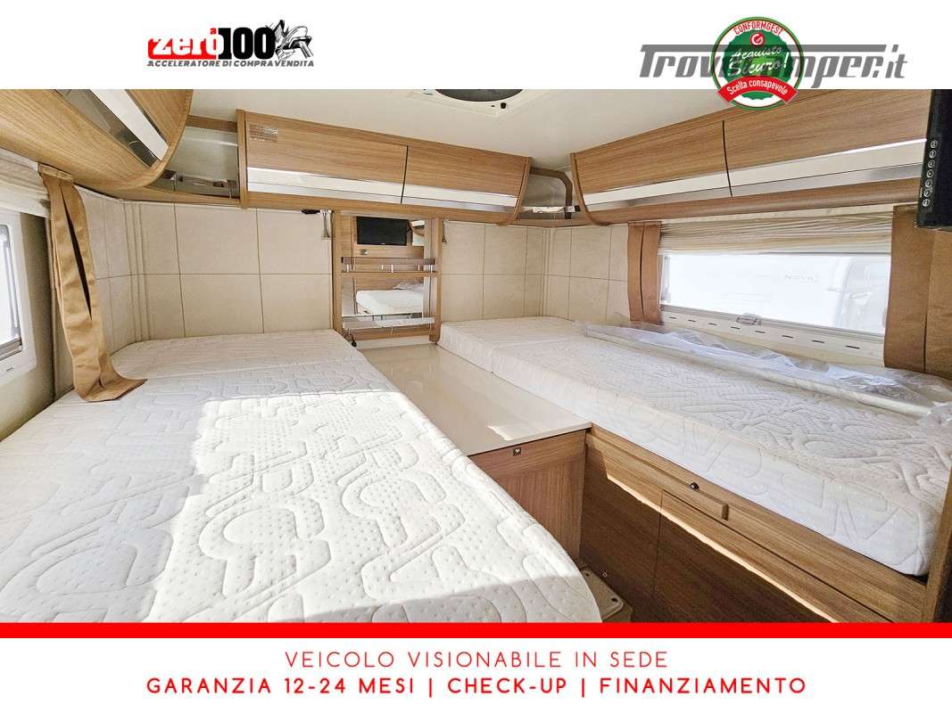 Letti gemelli in coda – Dinette a L con sedili cabina girevoli e gamba telescopica trasformabile in letto – Cucina 3 fuochi con piezo e frigorifero trivalente 150 lt automatico – Bagno in 2 vani indipendenti con box doccia separata – Letto anteriore basculante elettrico – Garage