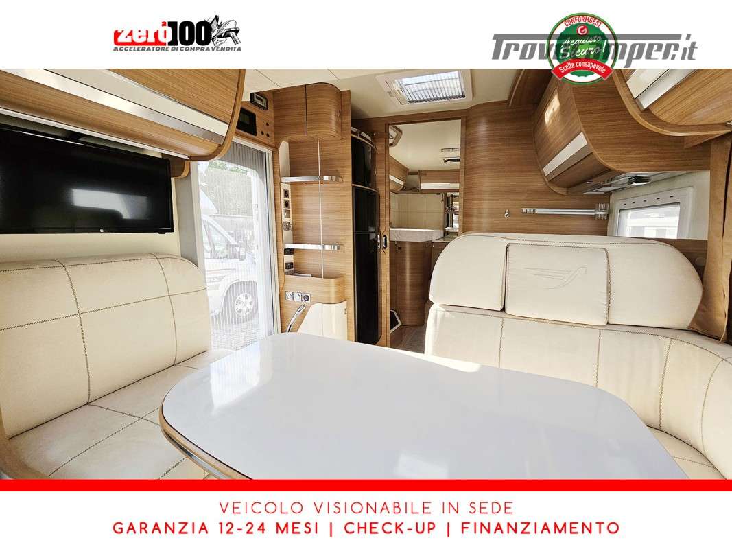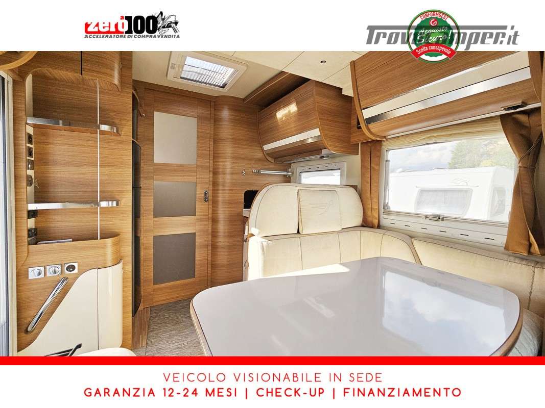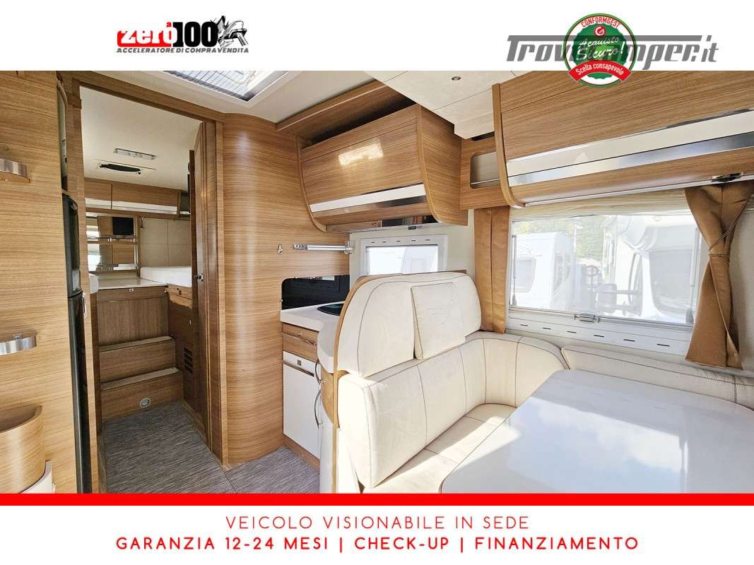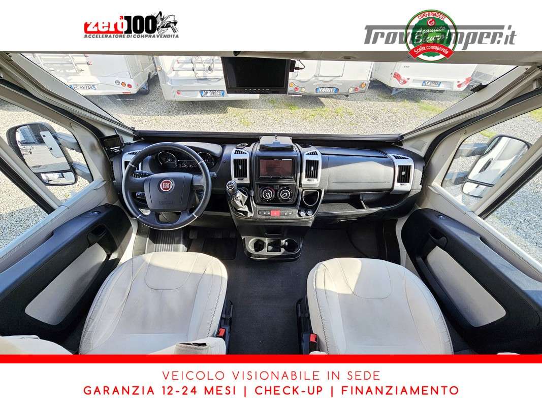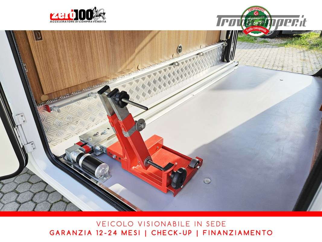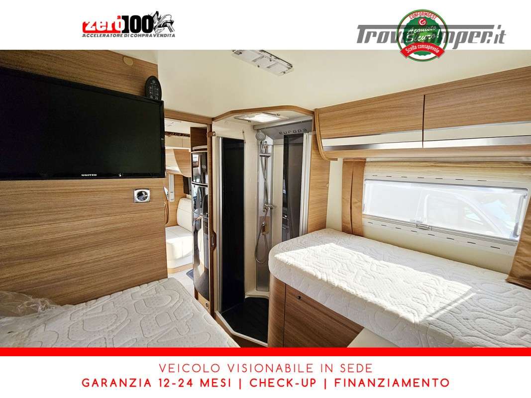 Letti gemelli in coda – Dinette a L con sedili cabina girevoli e gamba telescopica trasformabile in letto – Cucina 3 fuochi con piezo e frigorifero trivalente 150 lt automatico – Bagno in 2 vani indipendenti con box doccia separata – Letto anteriore basculante elettrico – Garage