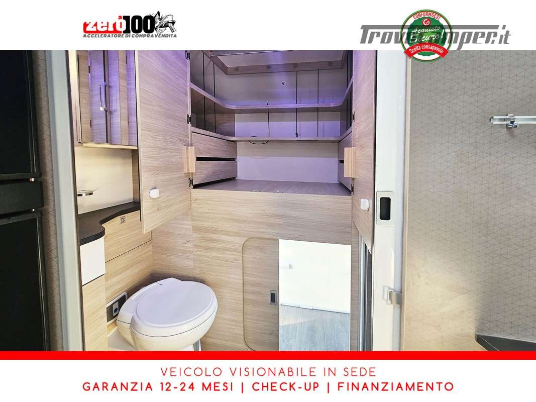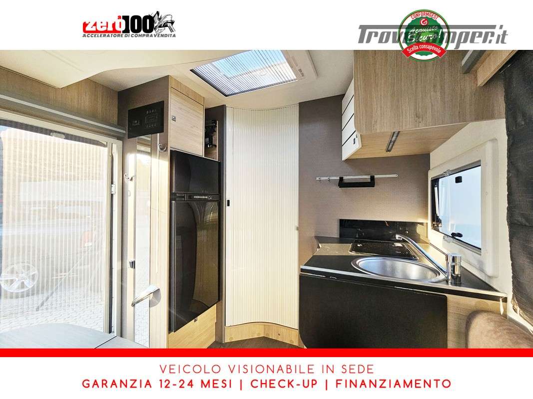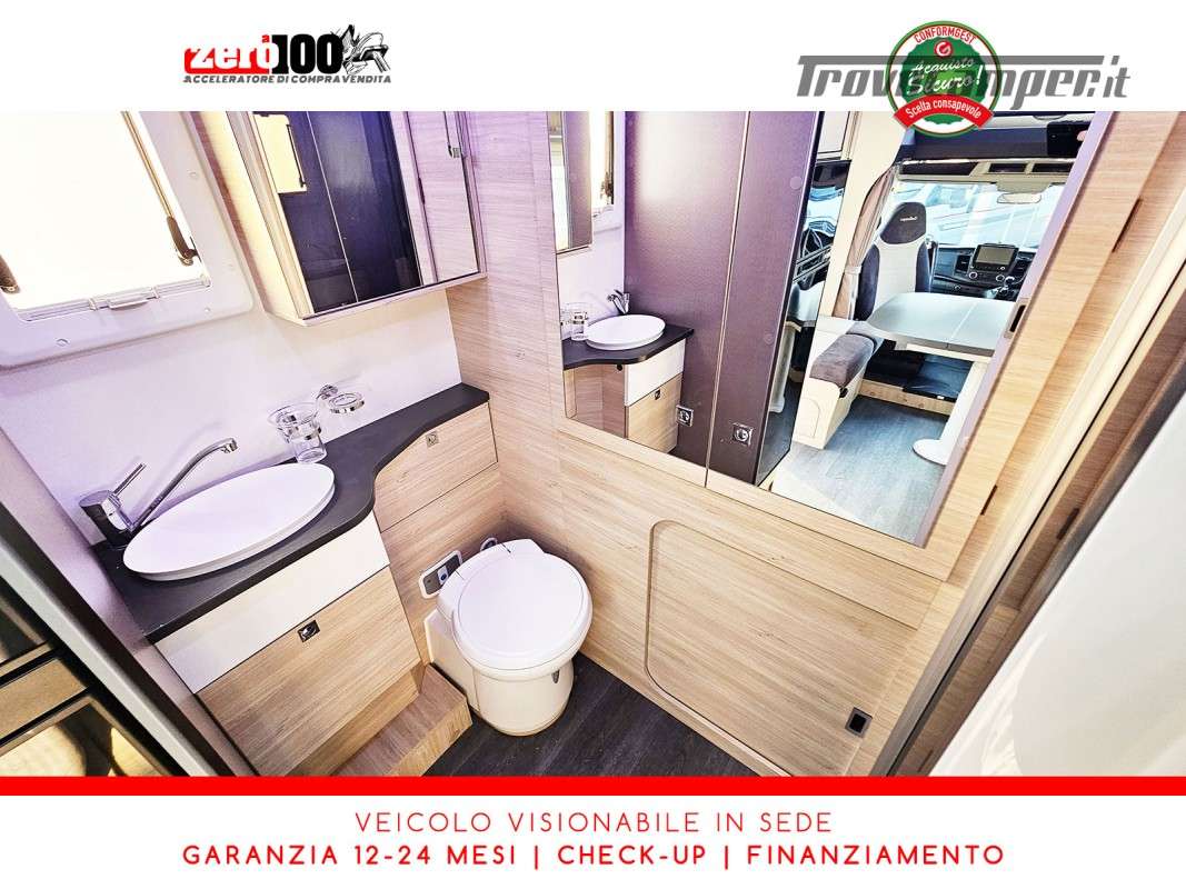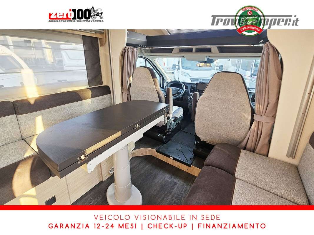 Dinette Face to Face con sedili girevoli trasformabile in letto – Letto matrimoniale basculante elettrico – Cucina lineare con frigo alto contrapposto – Ampio bagno in coda con doccia separata – Garage