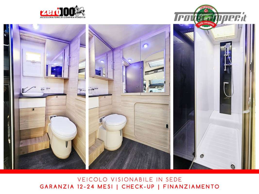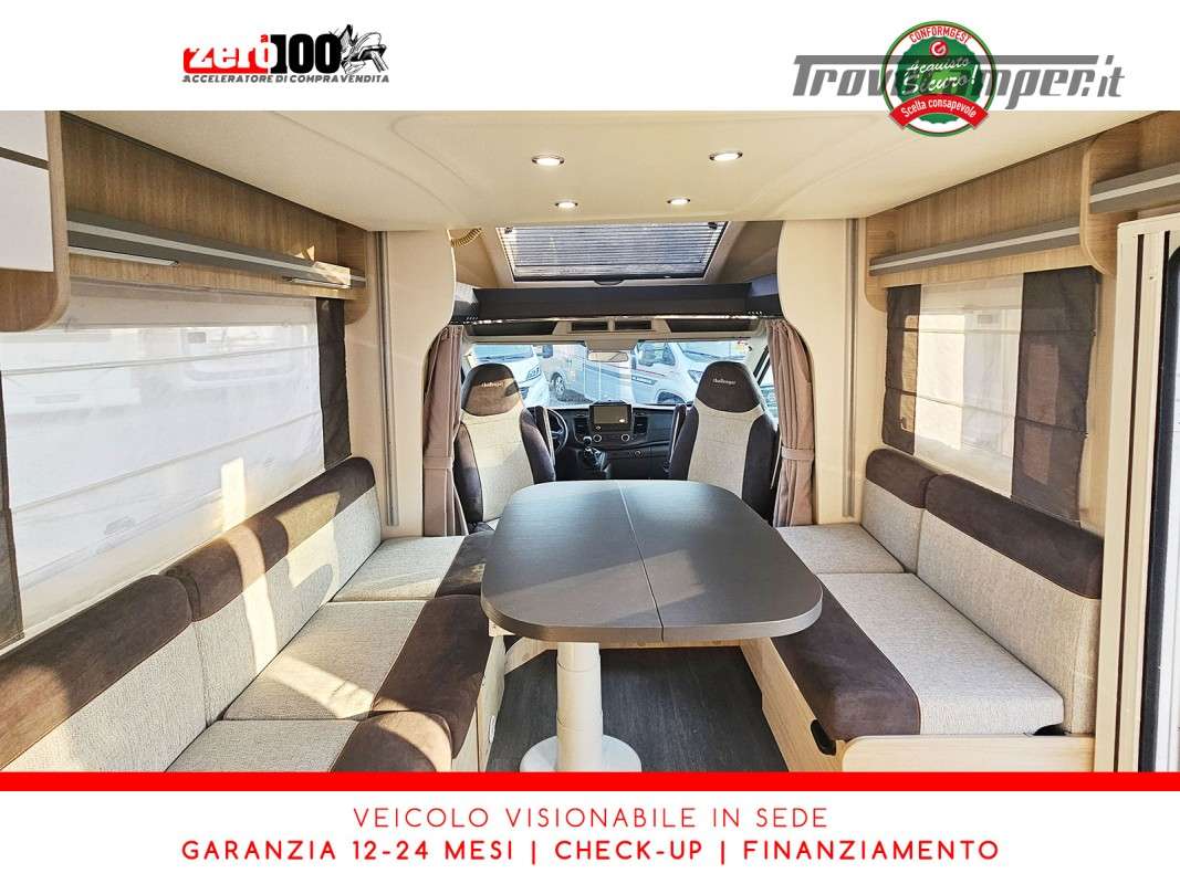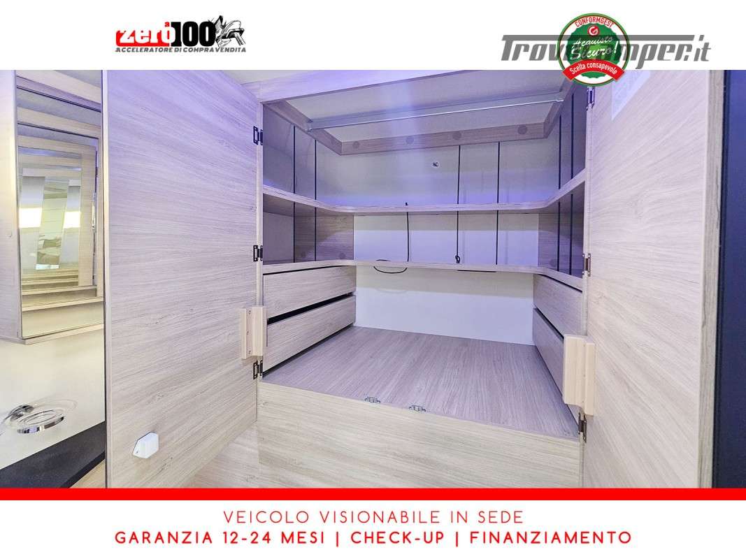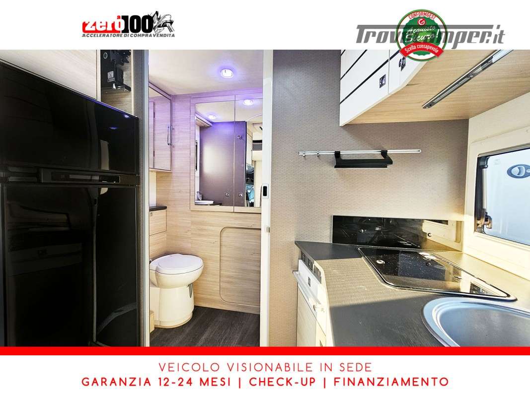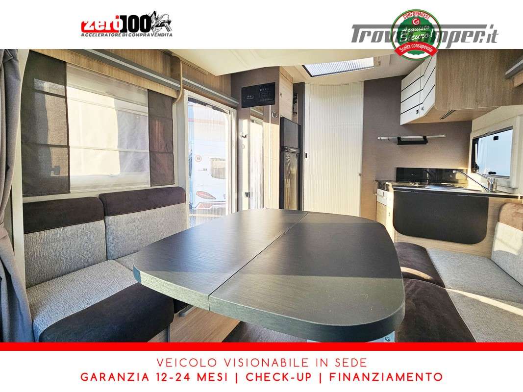 Dinette Face to Face con sedili girevoli trasformabile in letto – Letto matrimoniale basculante elettrico – Cucina lineare con frigo alto contrapposto – Ampio bagno in coda con doccia separata – Garage