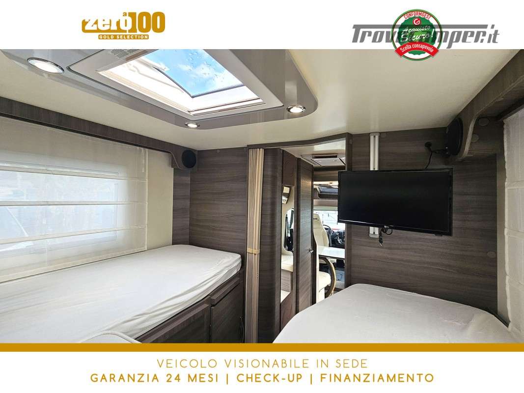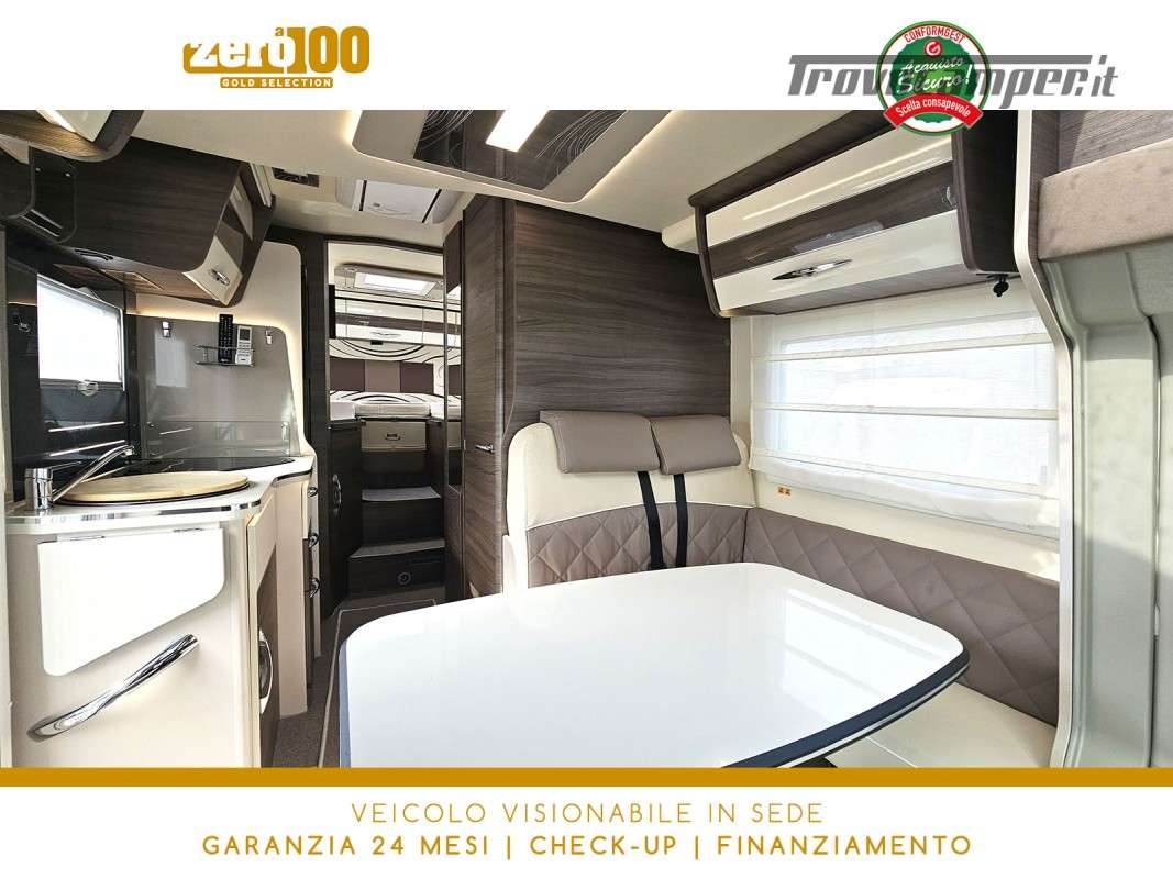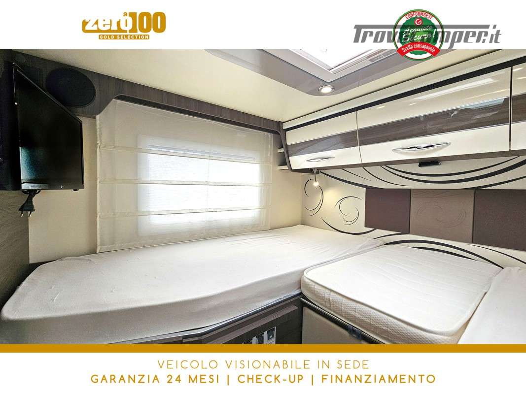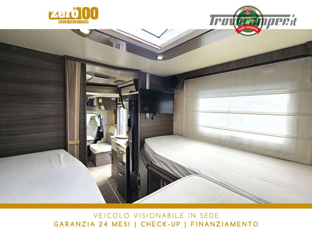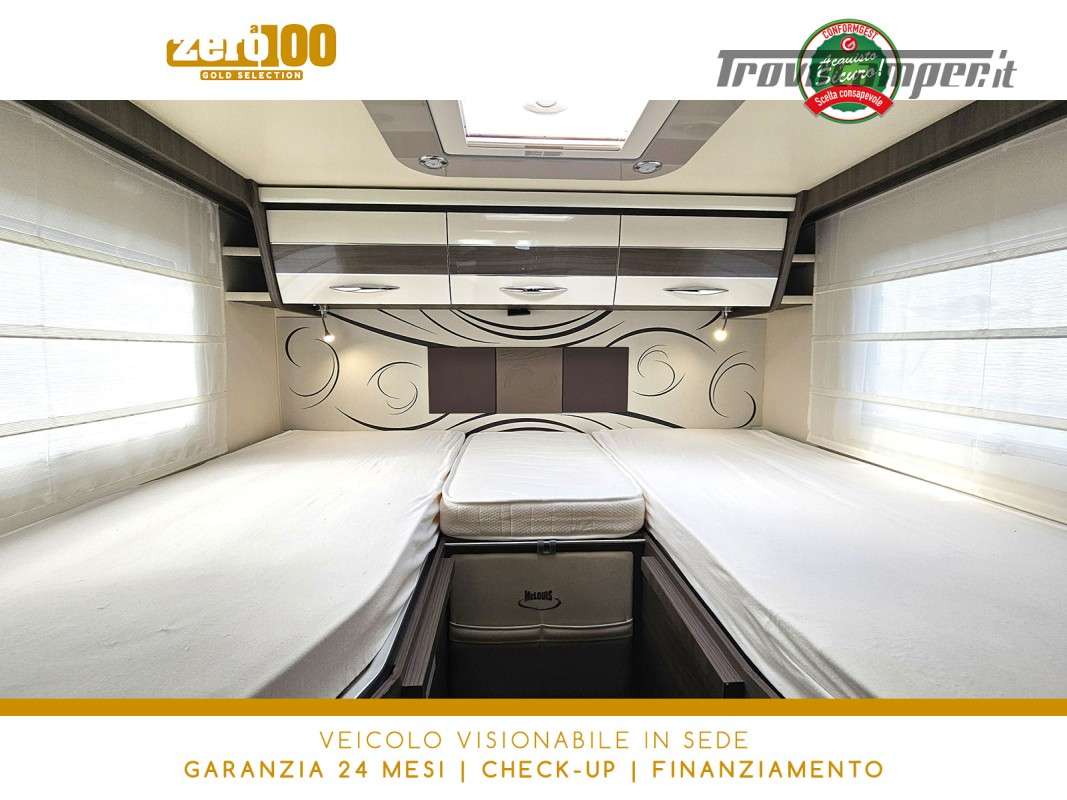 Letti gemelli in coda – Dinette a L con sedili cabina girevoli – Letto basculante elettrico anteriore – Cucina lineare 3 fuochi con Frigorifero trivalente alto con cella freezer separata – Bagno con box doccia e finestra – Garage