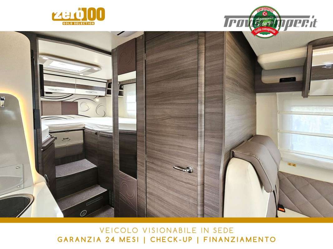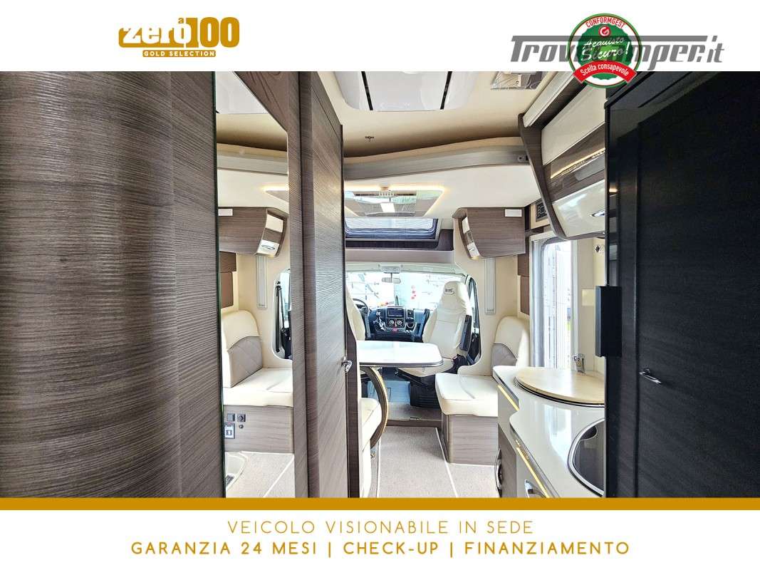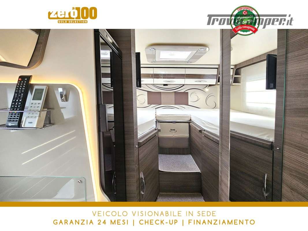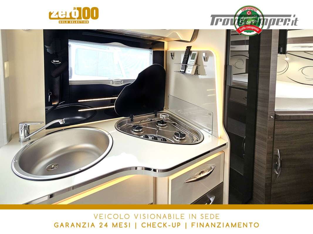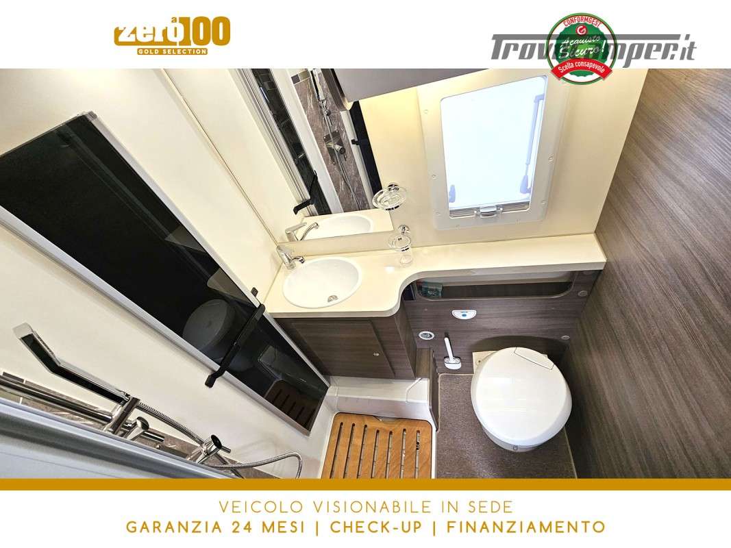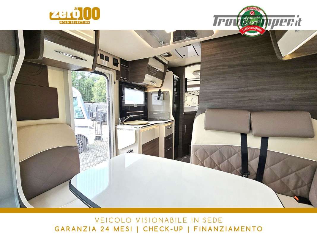 Letti gemelli in coda – Dinette a L con sedili cabina girevoli – Letto basculante elettrico anteriore – Cucina lineare 3 fuochi con Frigorifero trivalente alto con cella freezer separata – Bagno con box doccia e finestra – Garage