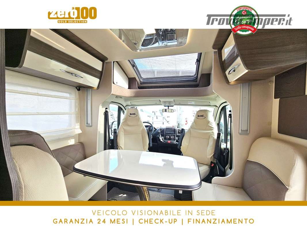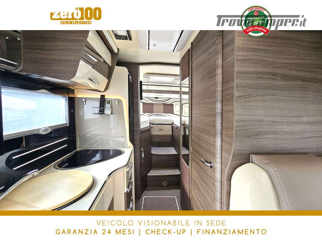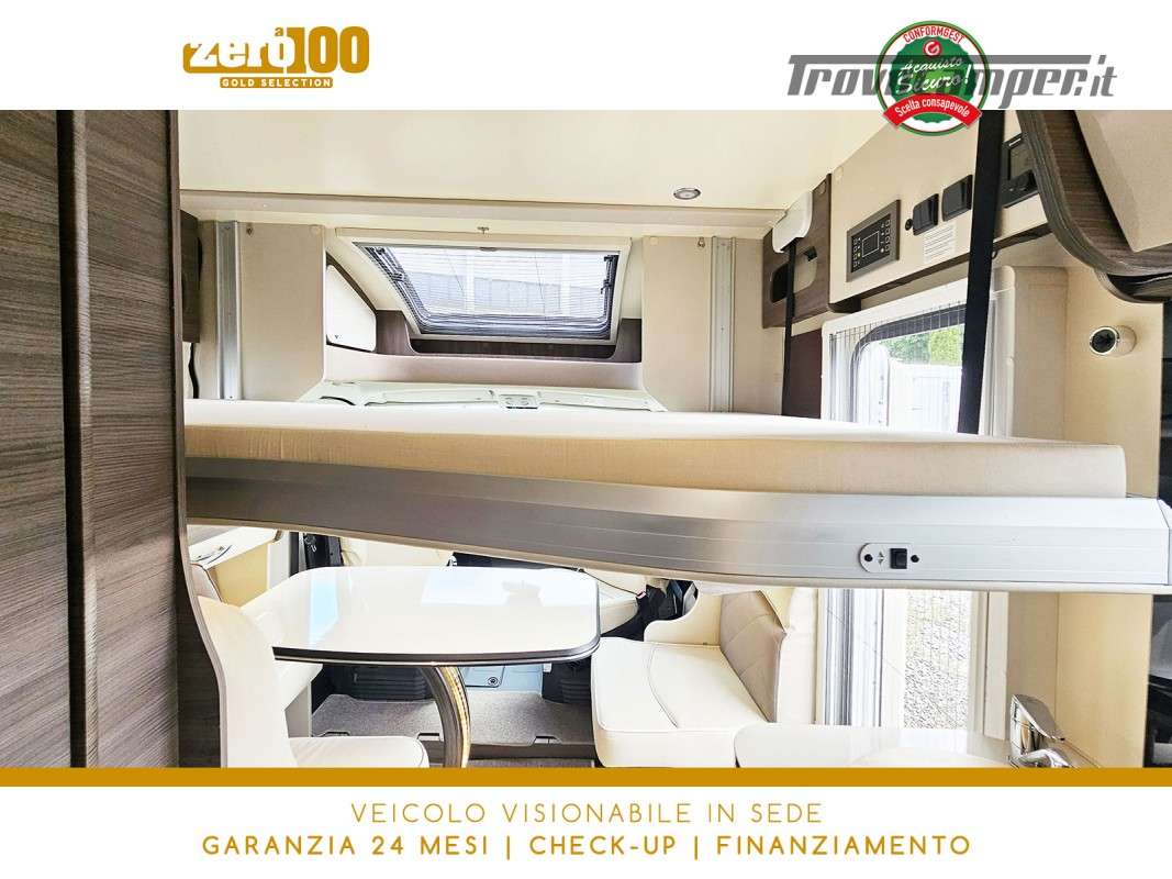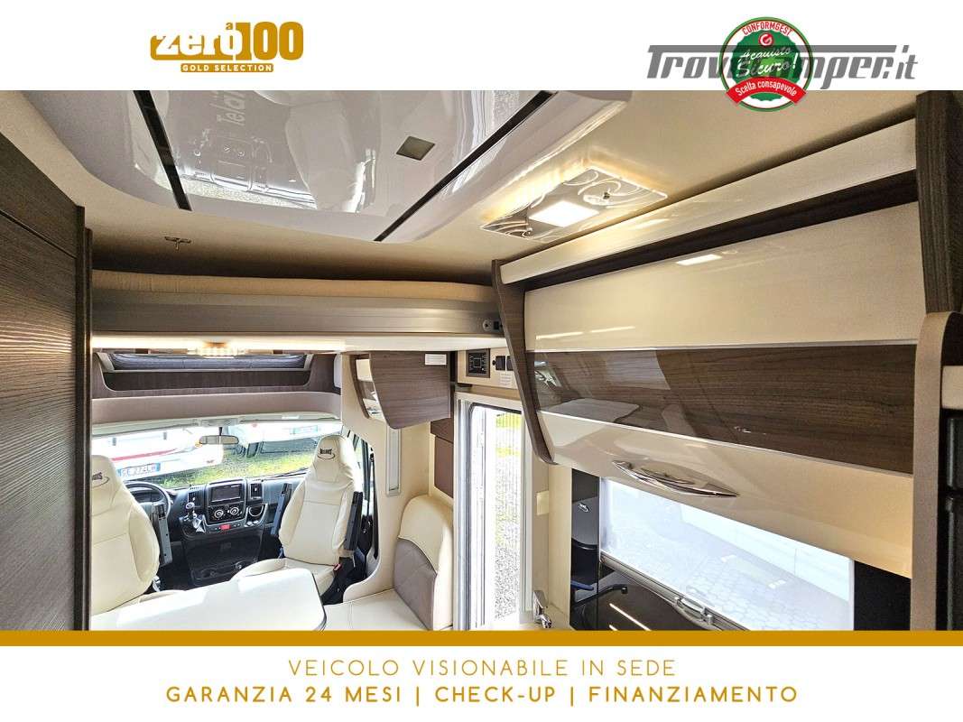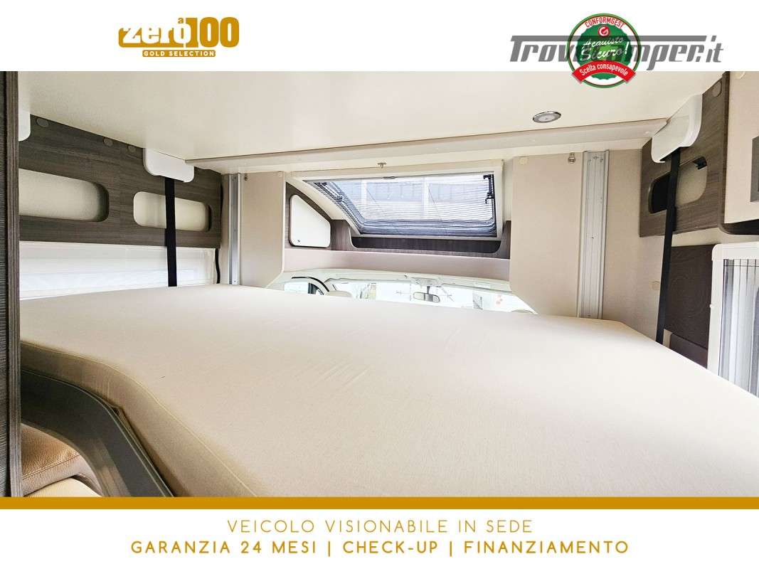 Letti gemelli in coda – Dinette a L con sedili cabina girevoli – Letto basculante elettrico anteriore – Cucina lineare 3 fuochi con Frigorifero trivalente alto con cella freezer separata – Bagno con box doccia e finestra – Garage