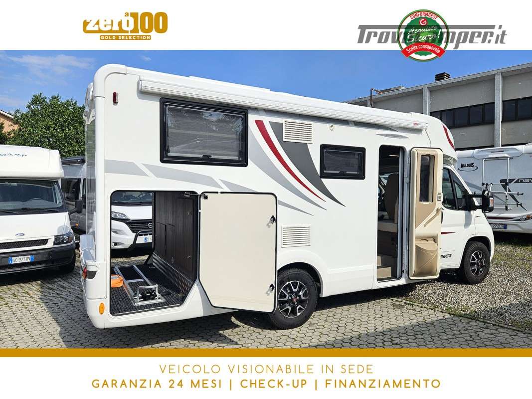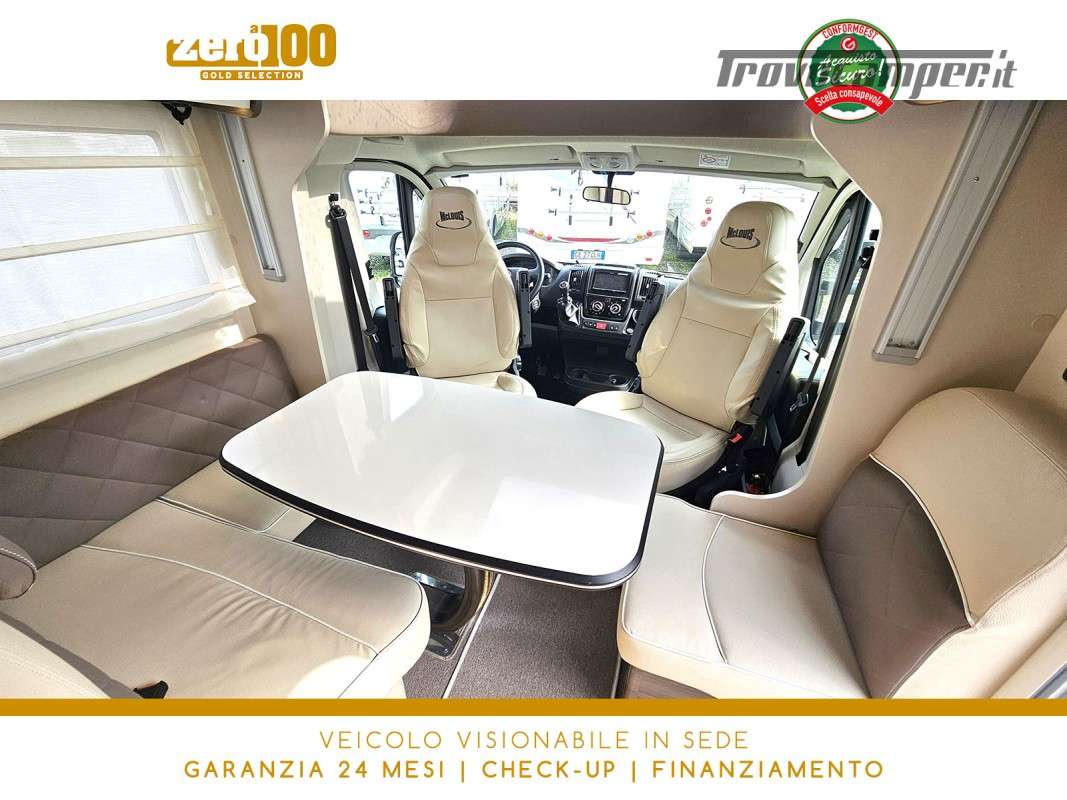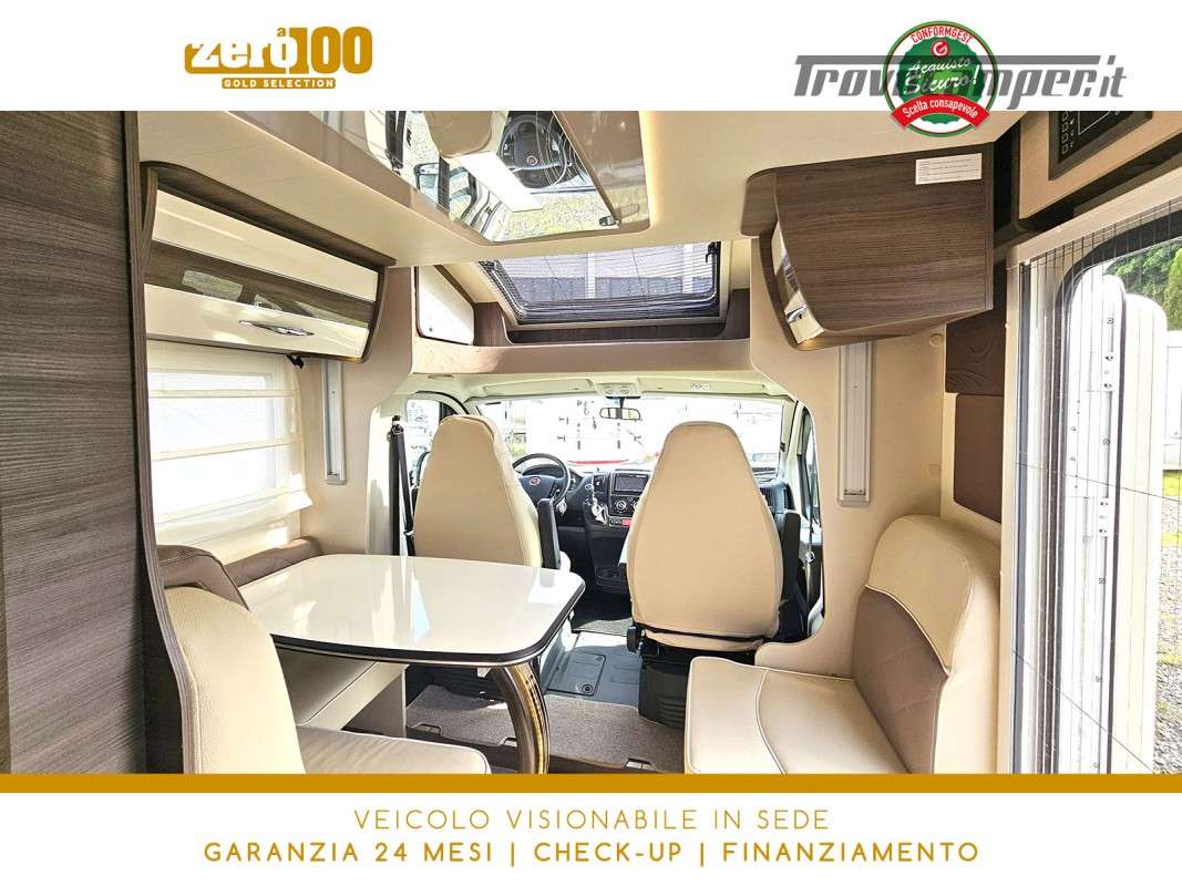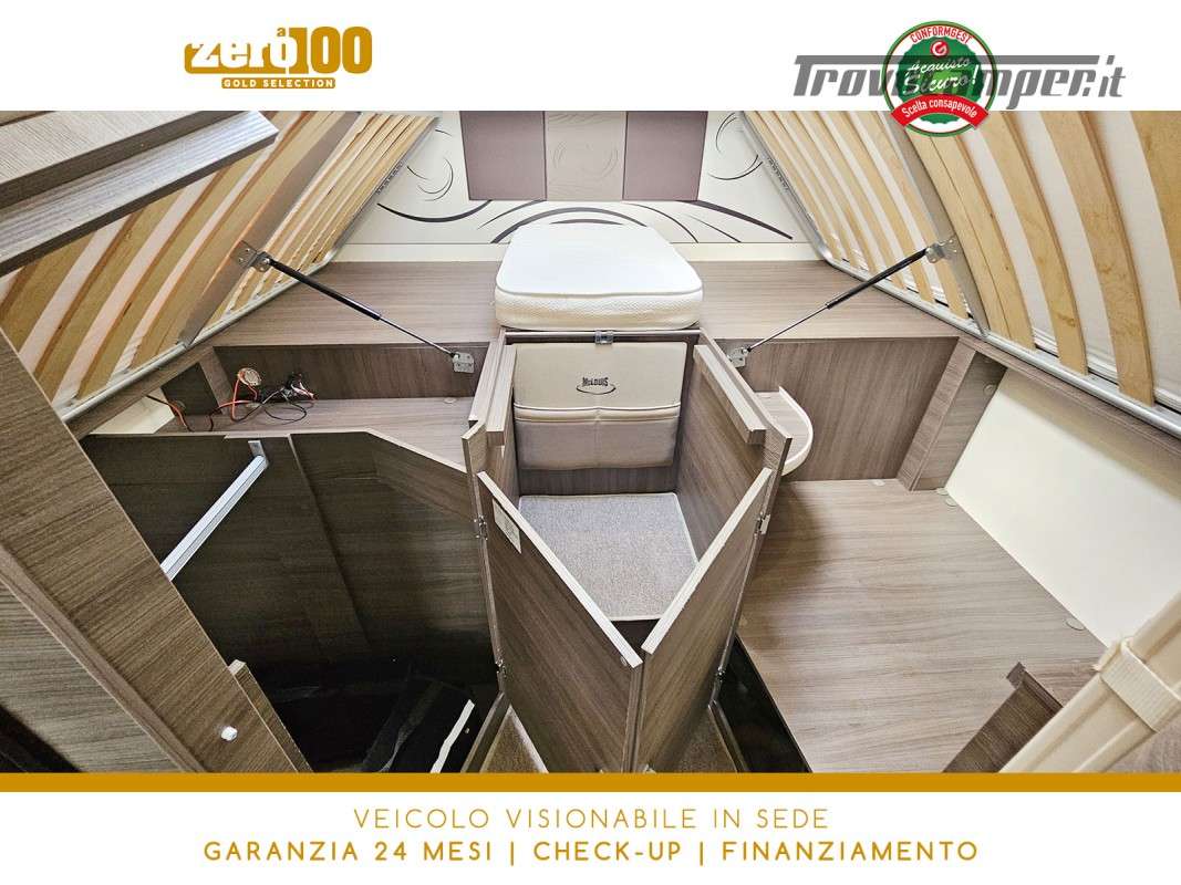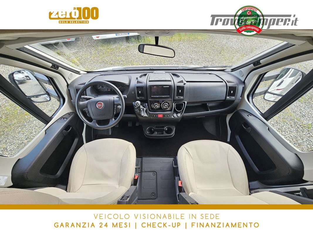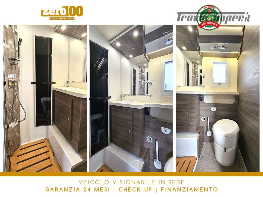 Letti gemelli in coda – Dinette a L con sedili cabina girevoli – Letto basculante elettrico anteriore – Cucina lineare 3 fuochi con Frigorifero trivalente alto con cella freezer separata – Bagno con box doccia e finestra – Garage