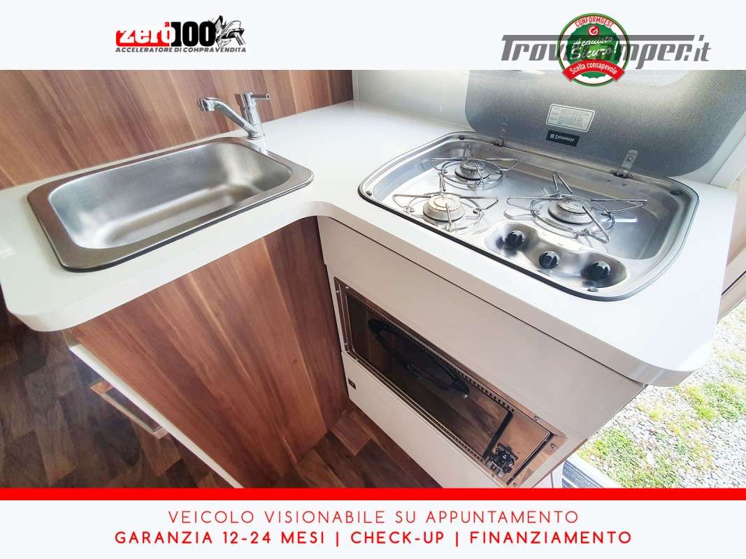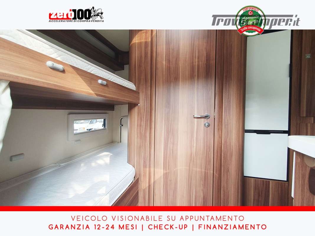 Letto matrimoniale anteriore basculante - Letti a castello trasversali in coda con gavone a volume variabile accessibile da entrambi i lati - Salottino Dinette trasformabile in letto matrimoniale - Cucina ad angolo con piano cottura 3 fuochi e forno - Frigorifero alto 140 lt - Bagno con doccia separata