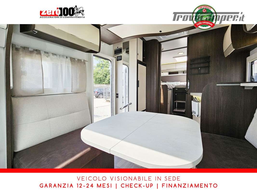 Letti gemelli in coda – Dinette Face to face con sedili cabina girevoli - Letto basculante anteriore elettrico - Cucina lineare 3 fuochi con Frigorifero trivalente alto con cella freezer separata – Bagno diviso in 2 vani separati: Toilette e lavello lato passeggero con oblò, Box doccia indipendente lato guida con oblò