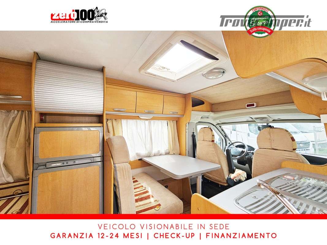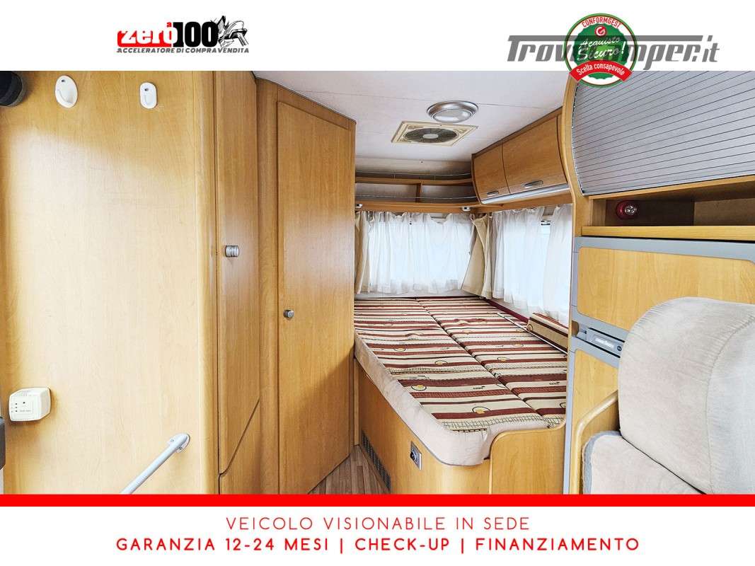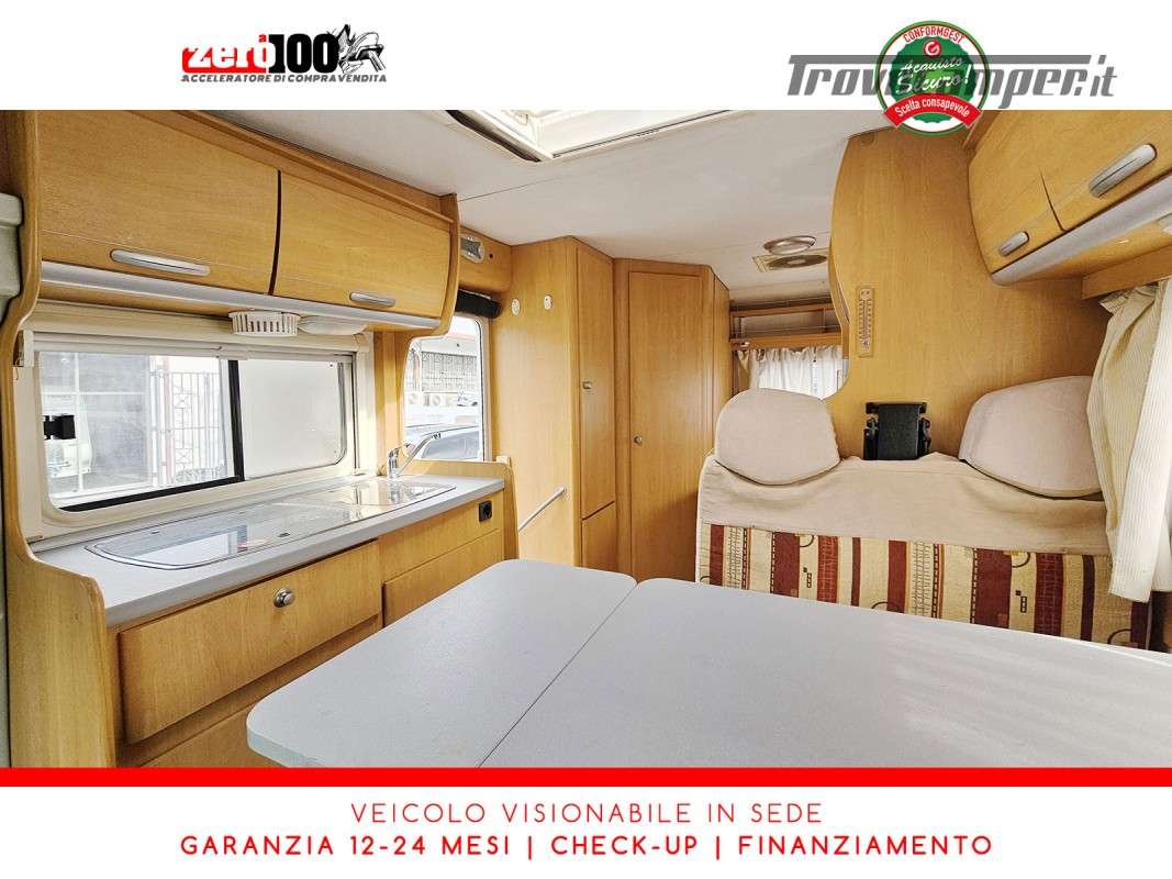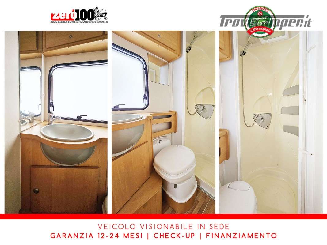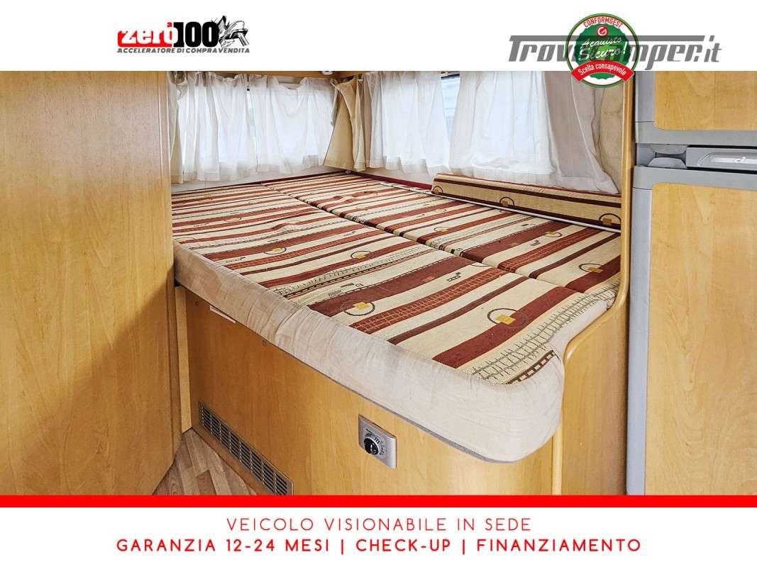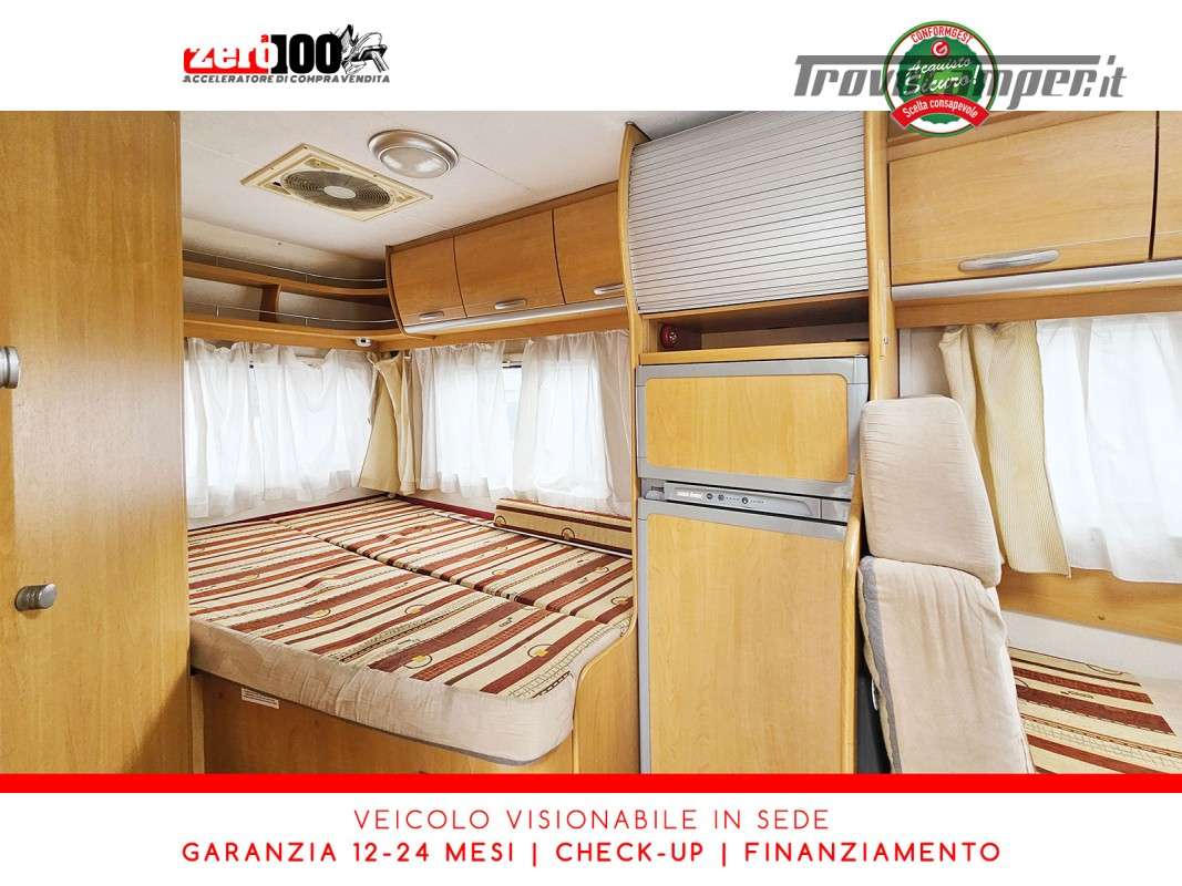Letto alla francese lato SX in coda - Mezza dinette con sedili cabina girevoli trasformabile in letto - Cucina lineare 3 fuochi con aspiratore, Frigorifero trivalente alto con cella freezer separata - Bagno con box doccia separato, finestra e oblò 28 x 28