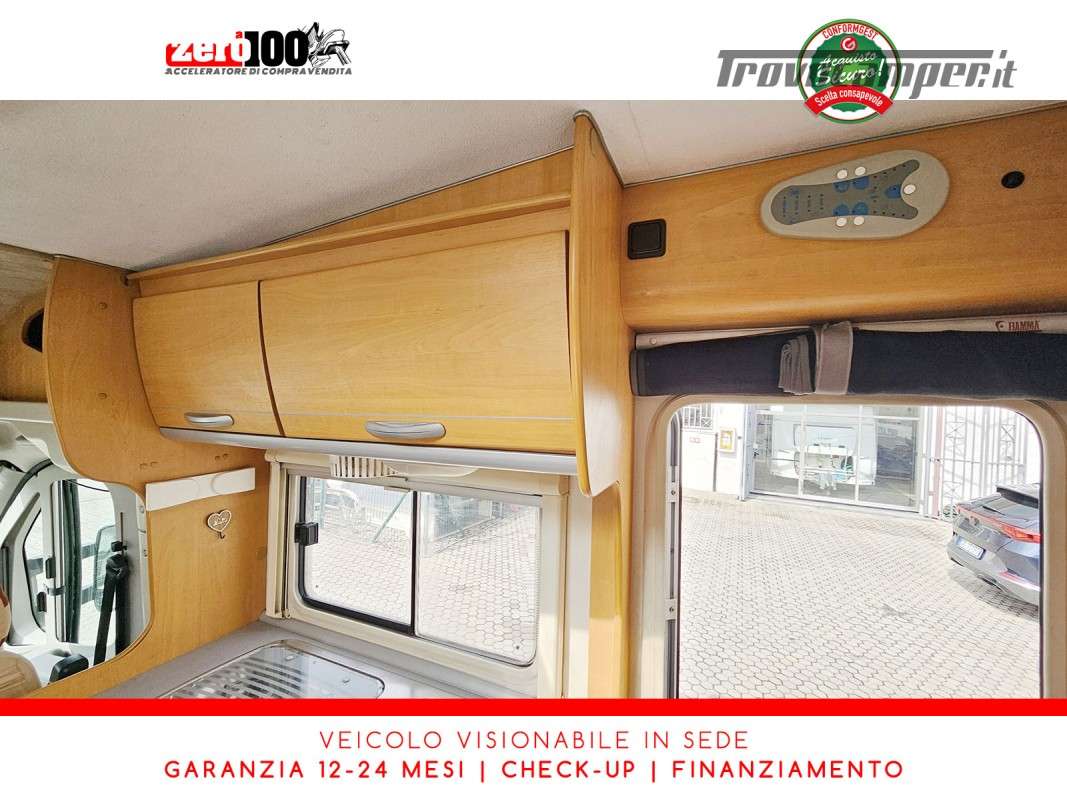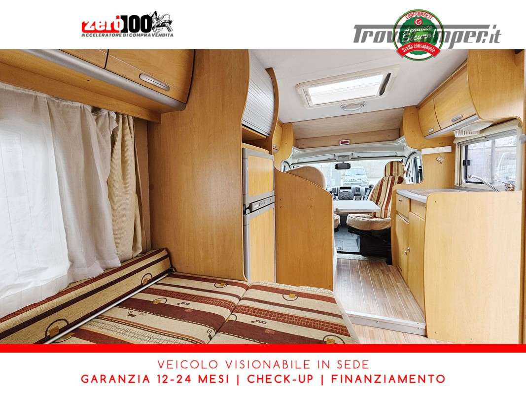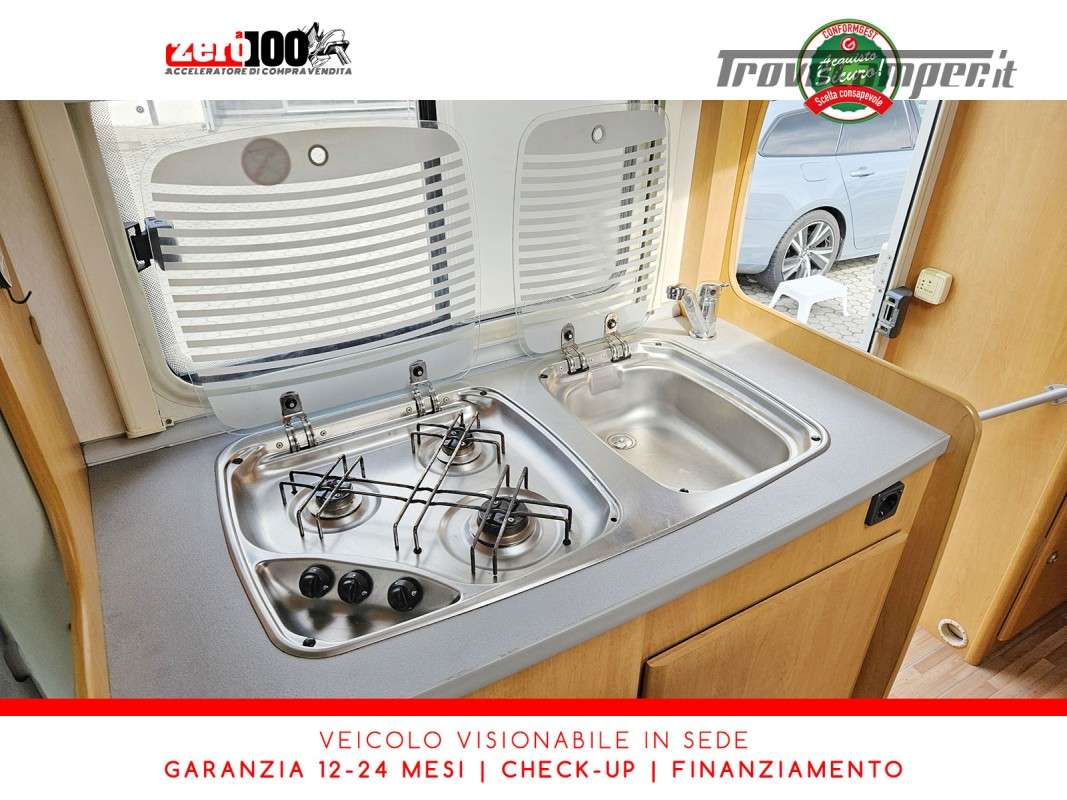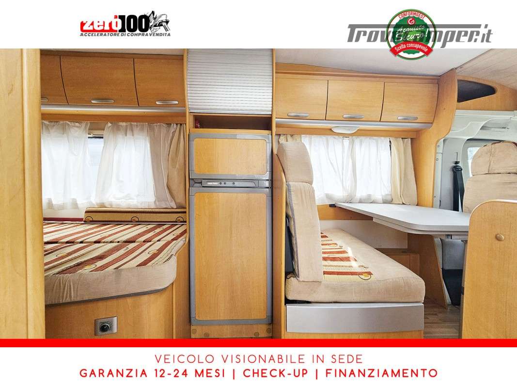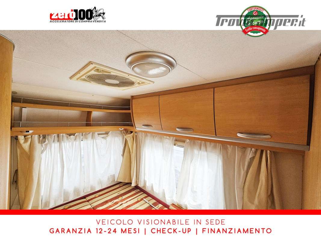 Letto alla francese lato SX in coda - Mezza dinette con sedili cabina girevoli trasformabile in letto - Cucina lineare 3 fuochi con aspiratore, Frigorifero trivalente alto con cella freezer separata - Bagno con box doccia separato, finestra e oblò 28 x 28