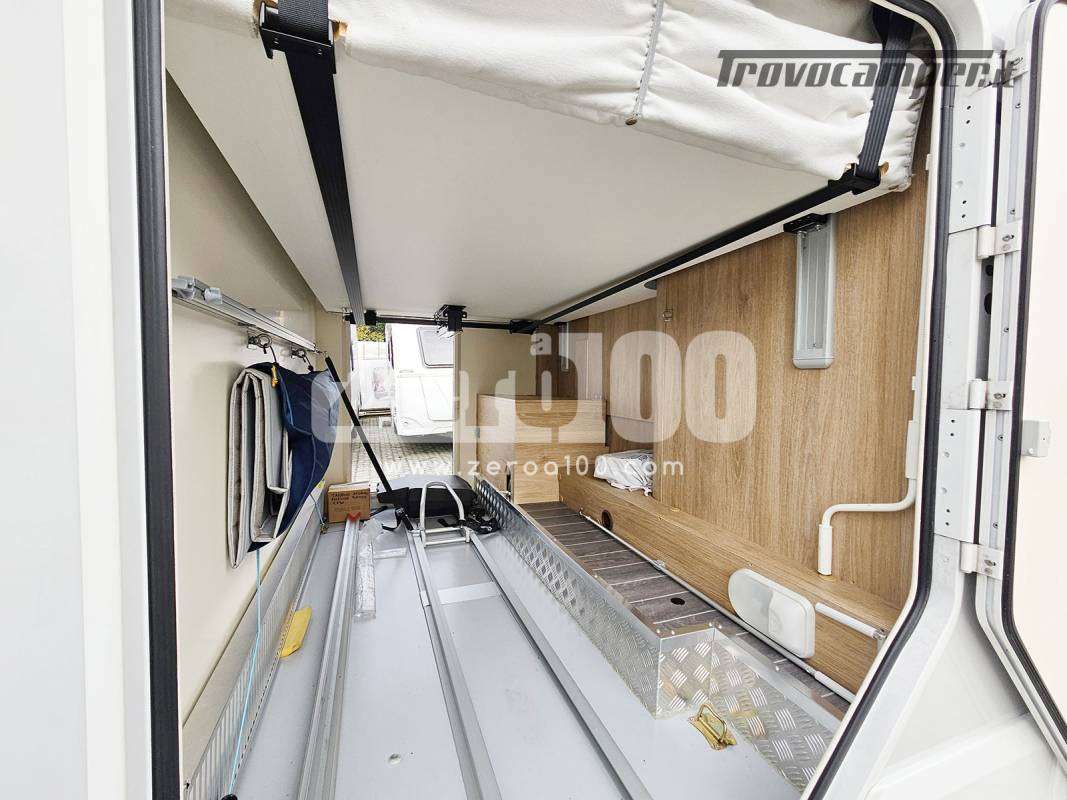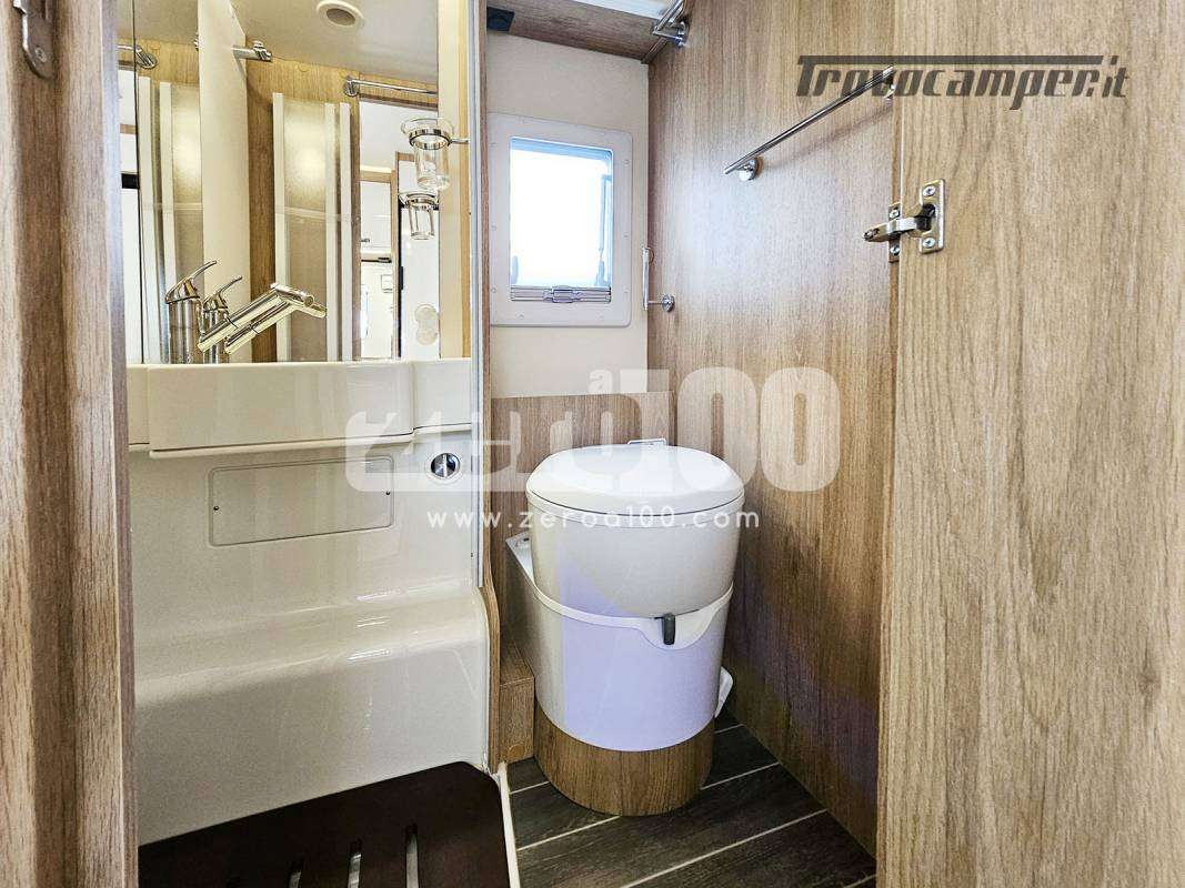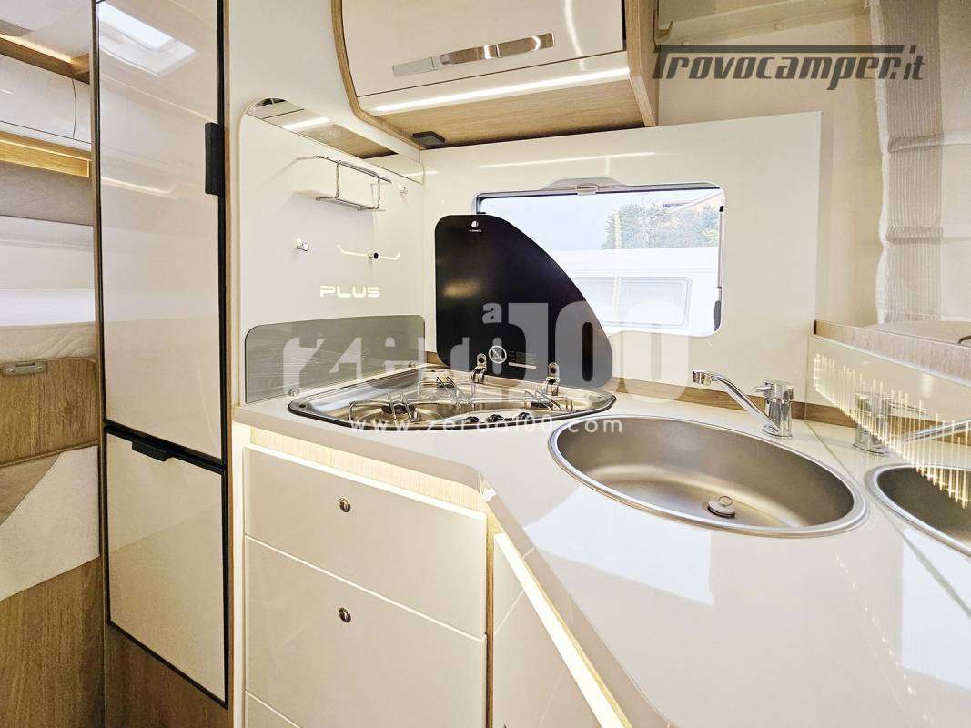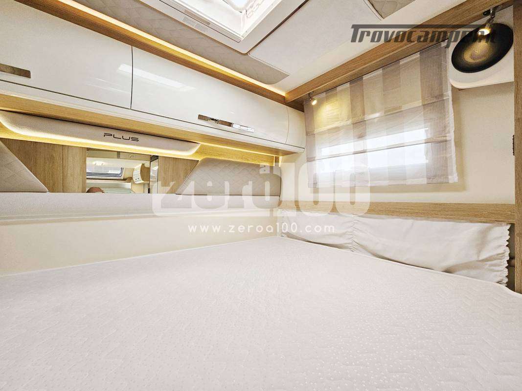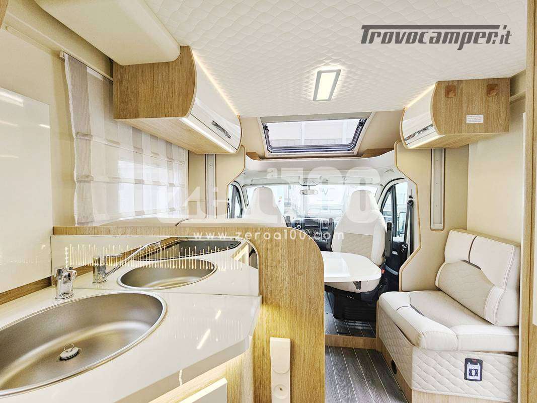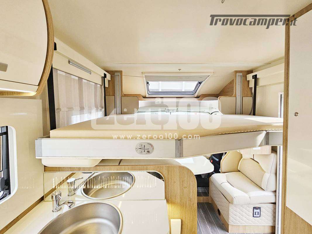 Letto matrimoniale trasversale in coda flex space manuale – Dinette a L con divanetto lato dx e sedili cabina girevoli -Letto basculante elettrico anteriore sopra dinette – Cucina lineare 3 fuochi con piezo, Frigorifero trivalente alto con cella freezer separata – Toilette con finestra e Box doccia con areatore – Letti con doghe – Pareti e tetto in Vetroresina – Ampio garage a volume variabile