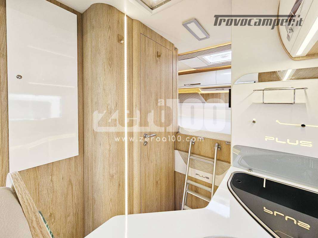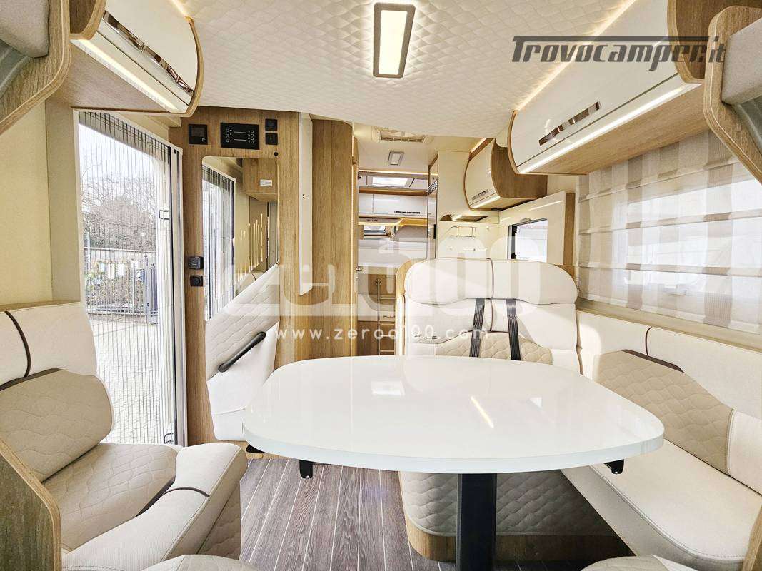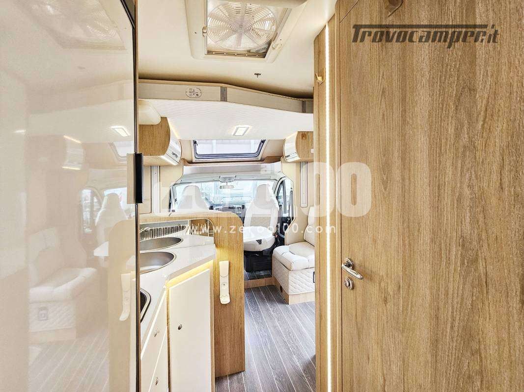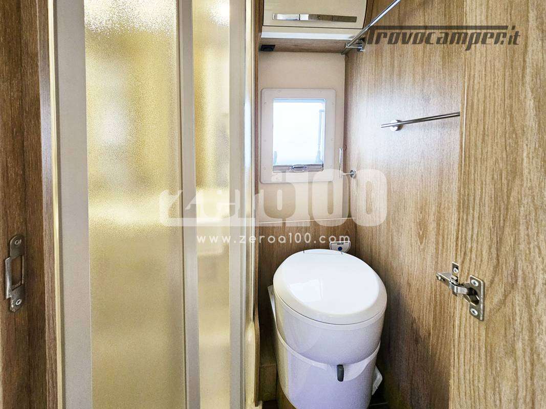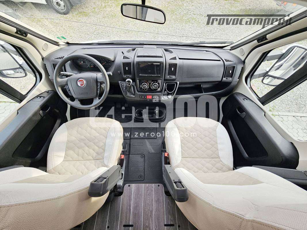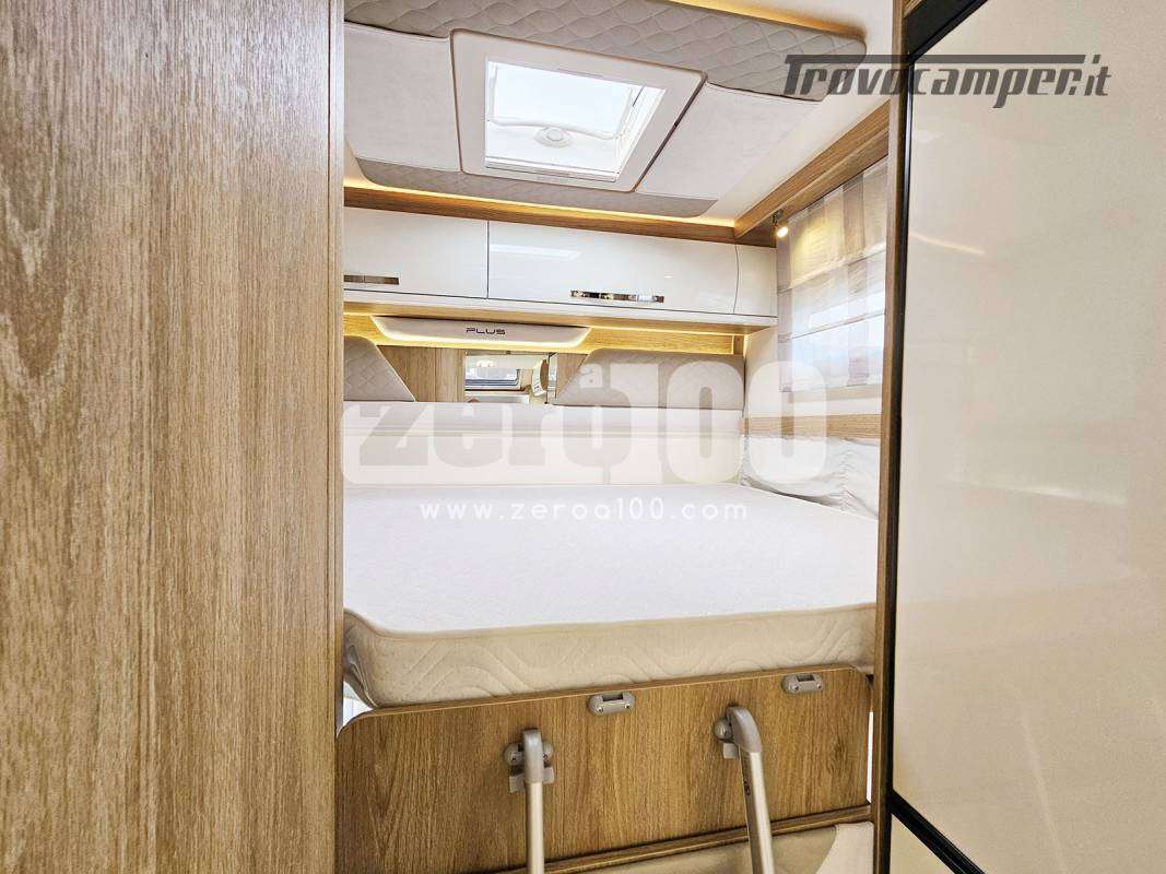 Letto matrimoniale trasversale in coda flex space manuale – Dinette a L con divanetto lato dx e sedili cabina girevoli -Letto basculante elettrico anteriore sopra dinette – Cucina lineare 3 fuochi con piezo, Frigorifero trivalente alto con cella freezer separata – Toilette con finestra e Box doccia con areatore – Letti con doghe – Pareti e tetto in Vetroresina – Ampio garage a volume variabile
