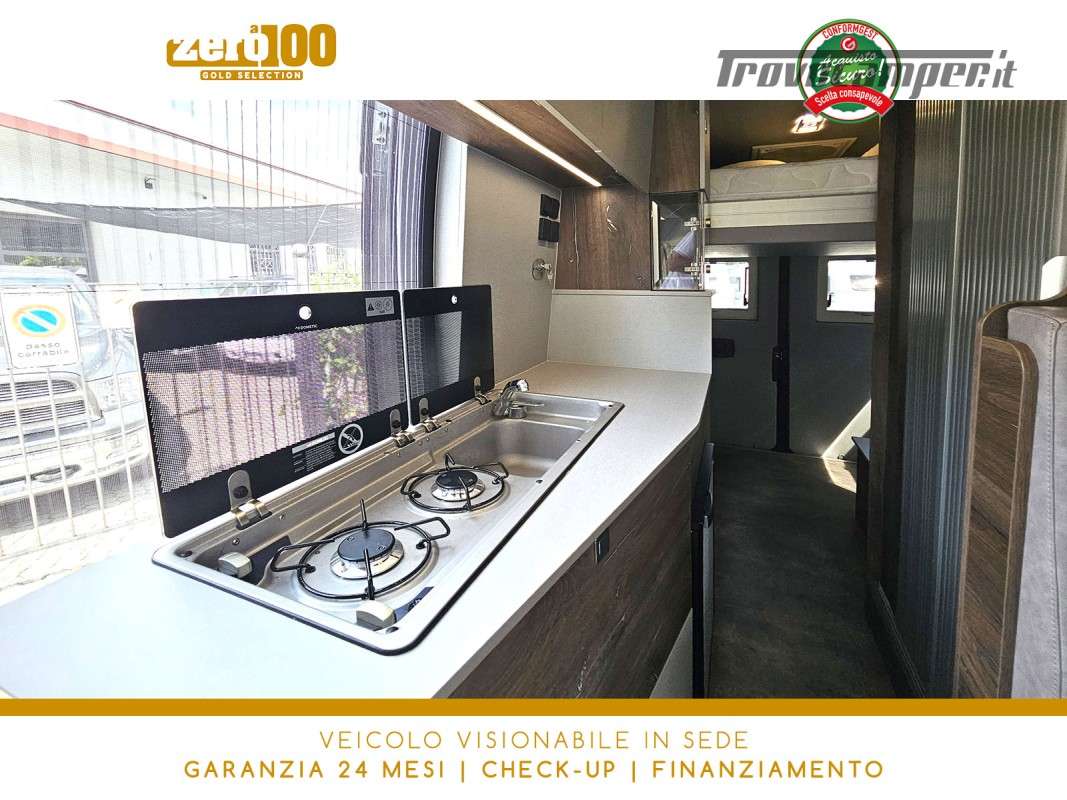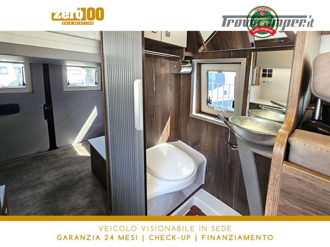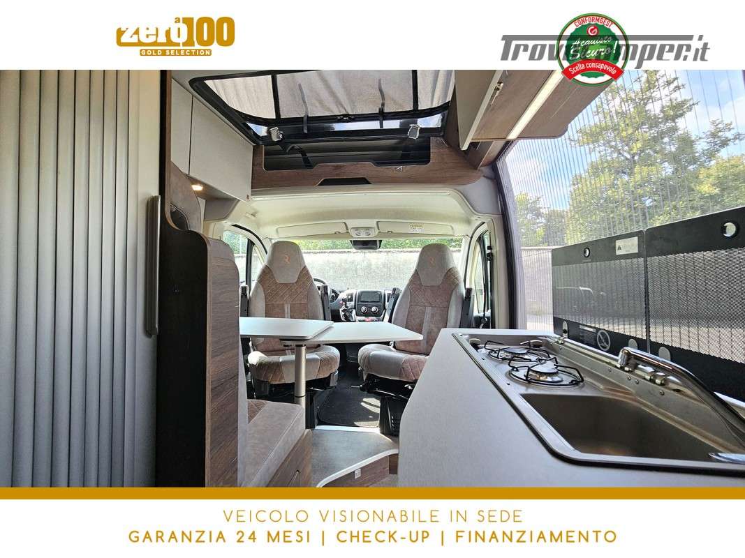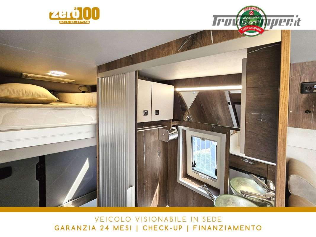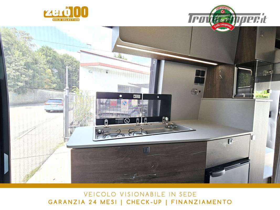 Letto matrimoniale trasversale in coda elettrico – Mezza dinette con sedili cabina girevoli – Letto matrimoniale su tetto a soffietto – Cucina lineare 2 fuochi – Frigorifero a compressore 70 lt – Bagno con doccia integrata e finestra – Garage a volume variabile