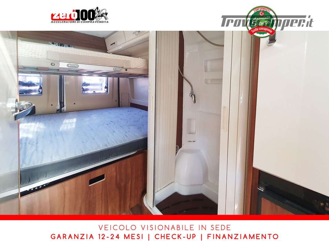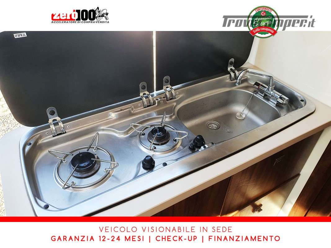 Doppio letto matrimoniale trasversale in coda removibile - Mezza dinette e sedili girevoli trasformabile in letto singolo - Cucina lineare 3 fuochi co frigorifero trivalente 115 lt - Bagno e box doccia separati in 2