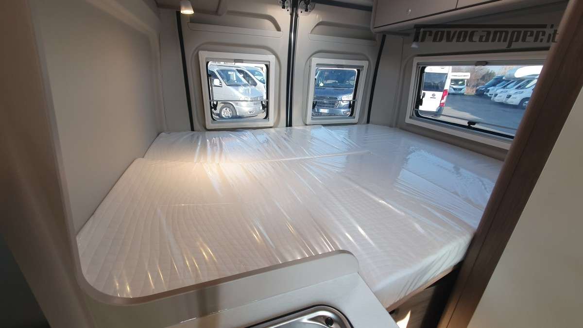 Il layout è il classico con un grande letto matrimoniale trasversale posizionato nella parte posteriore del camper, sopra ad un ampio garage utile per stivare tutto l’occorrente di cui avrete bisogno.