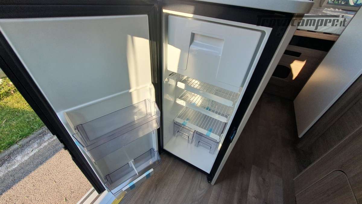 Quest’ultima è fornita di 2 fuochi, lavandino, un ampio frigorifero a compressore da 90 Lt ed un utilissimo piano di appoggio.