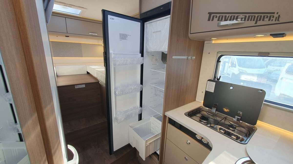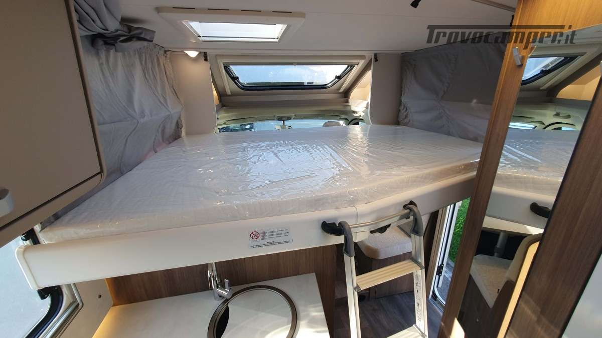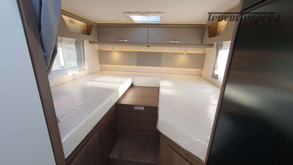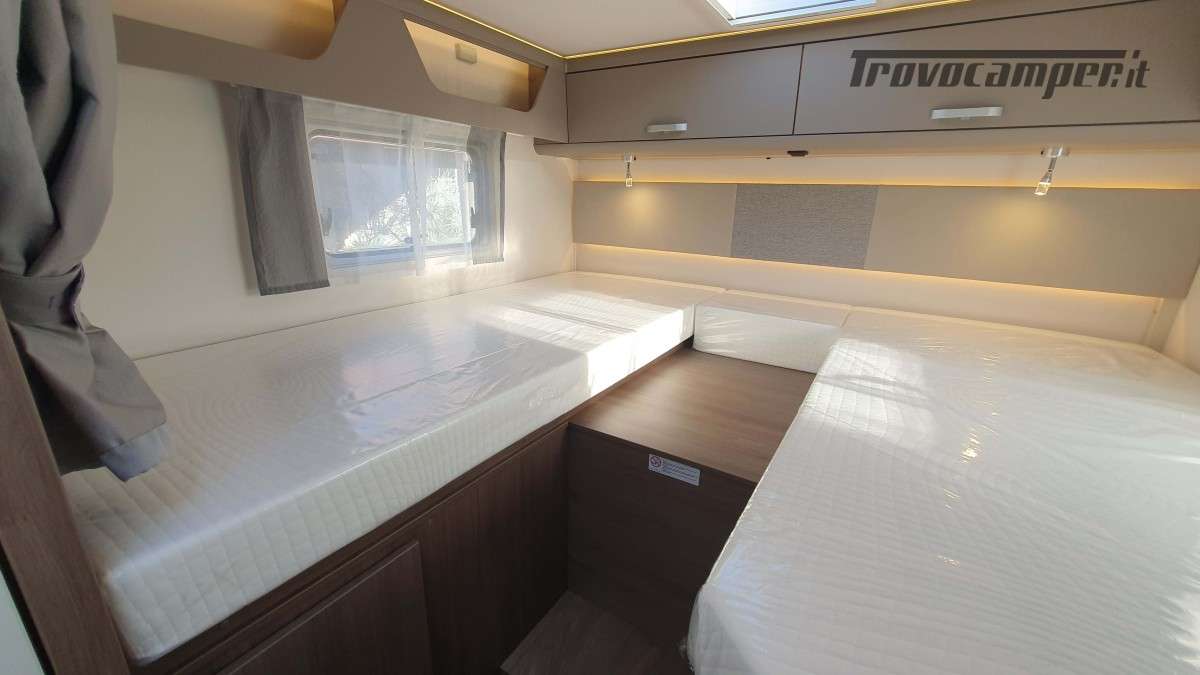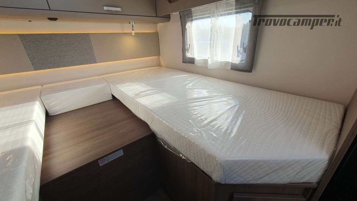 un letto matrimoniale basculante manuale si trova sopra la dinette, mentre nella parte posteriore ci sono due letti gemelli sopra al garage.